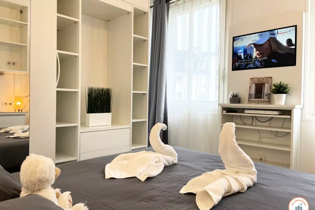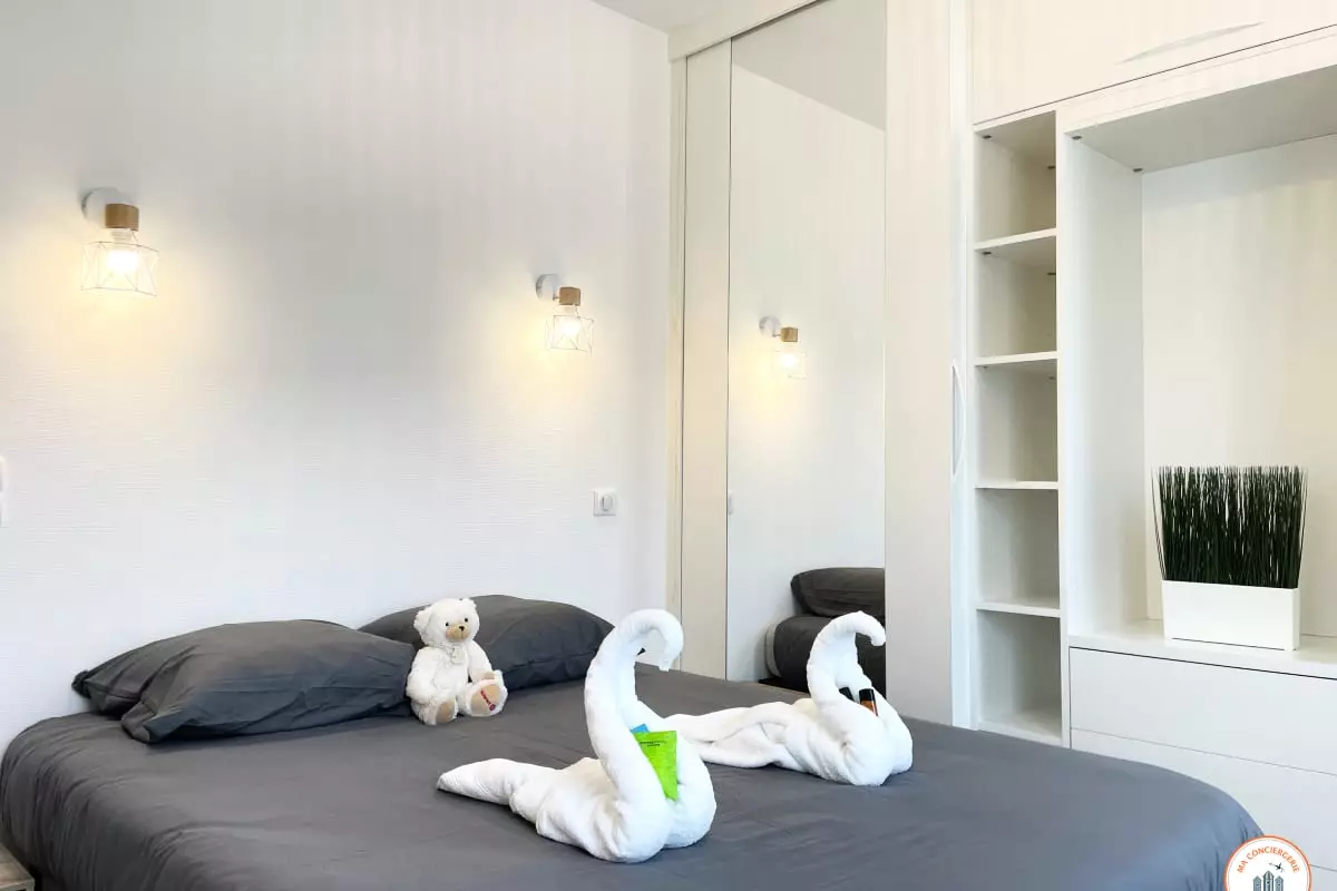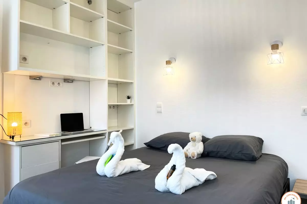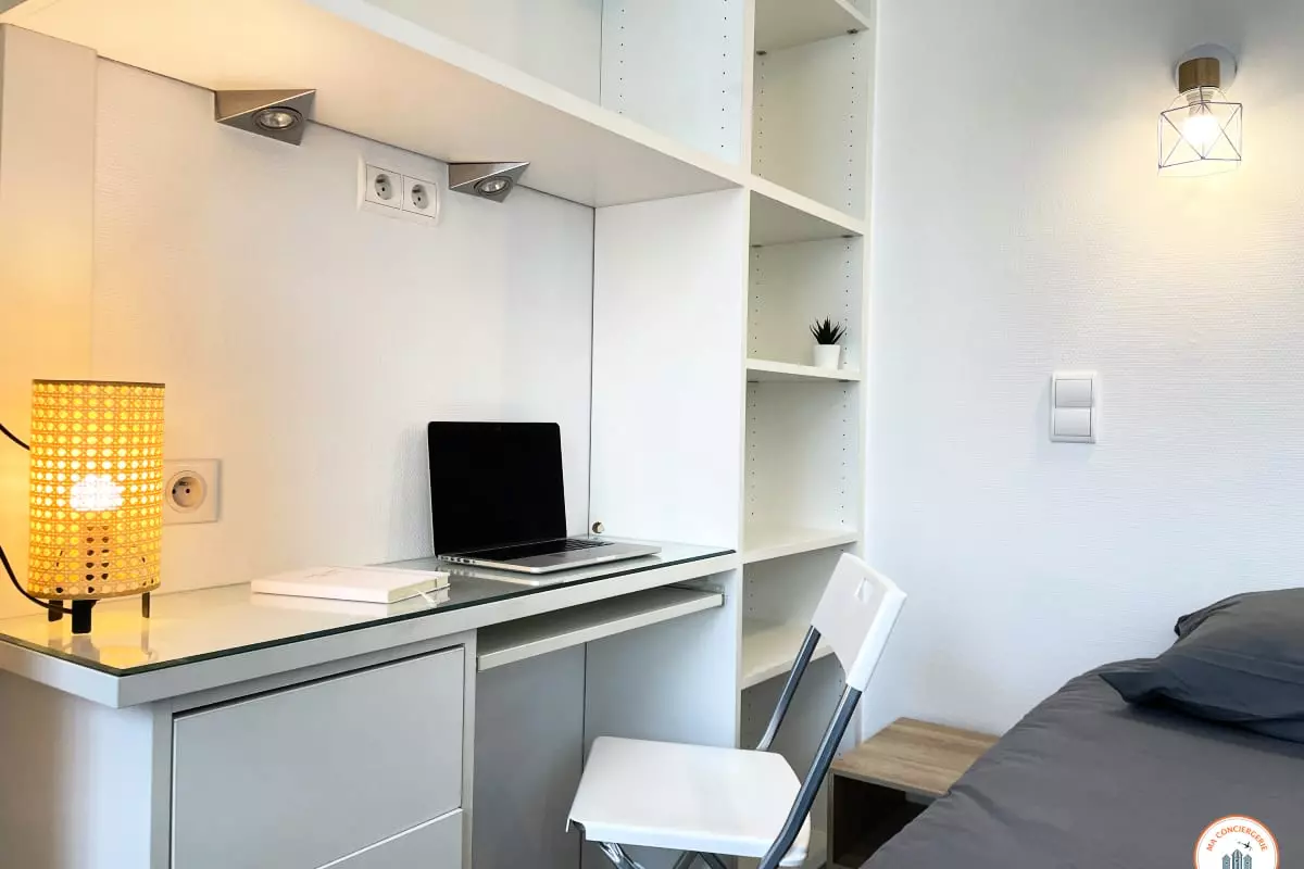 - une chambre avec espace de travail (idéal pour le télétravail), disposant d'un lit double de qualité en 140x200cm et de nombreux espaces de rangement.