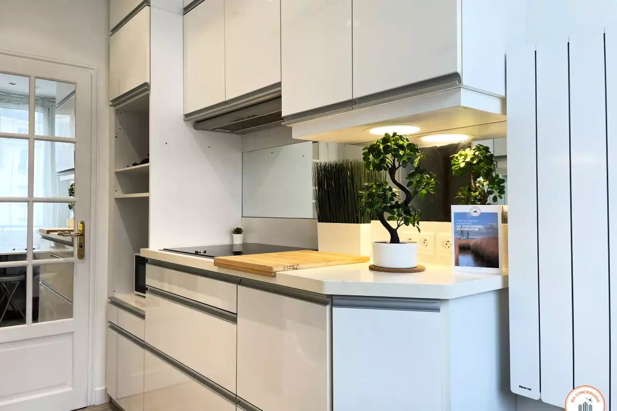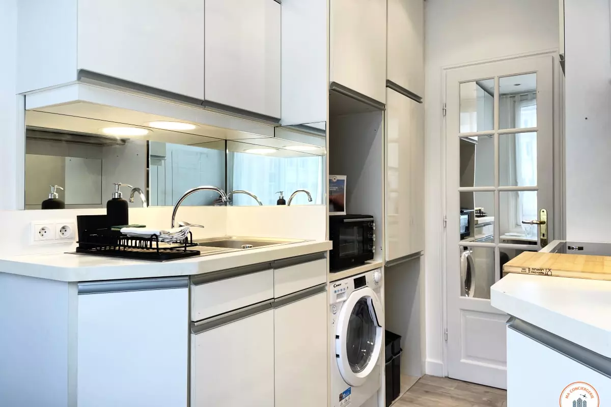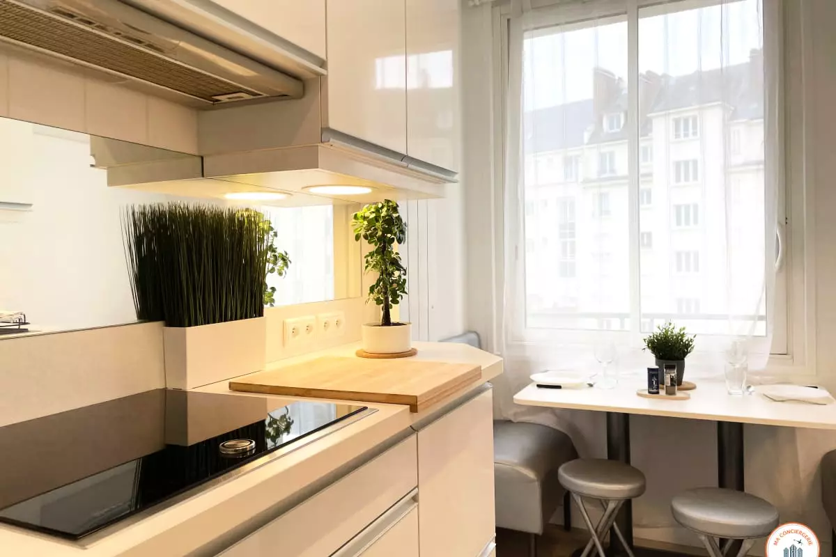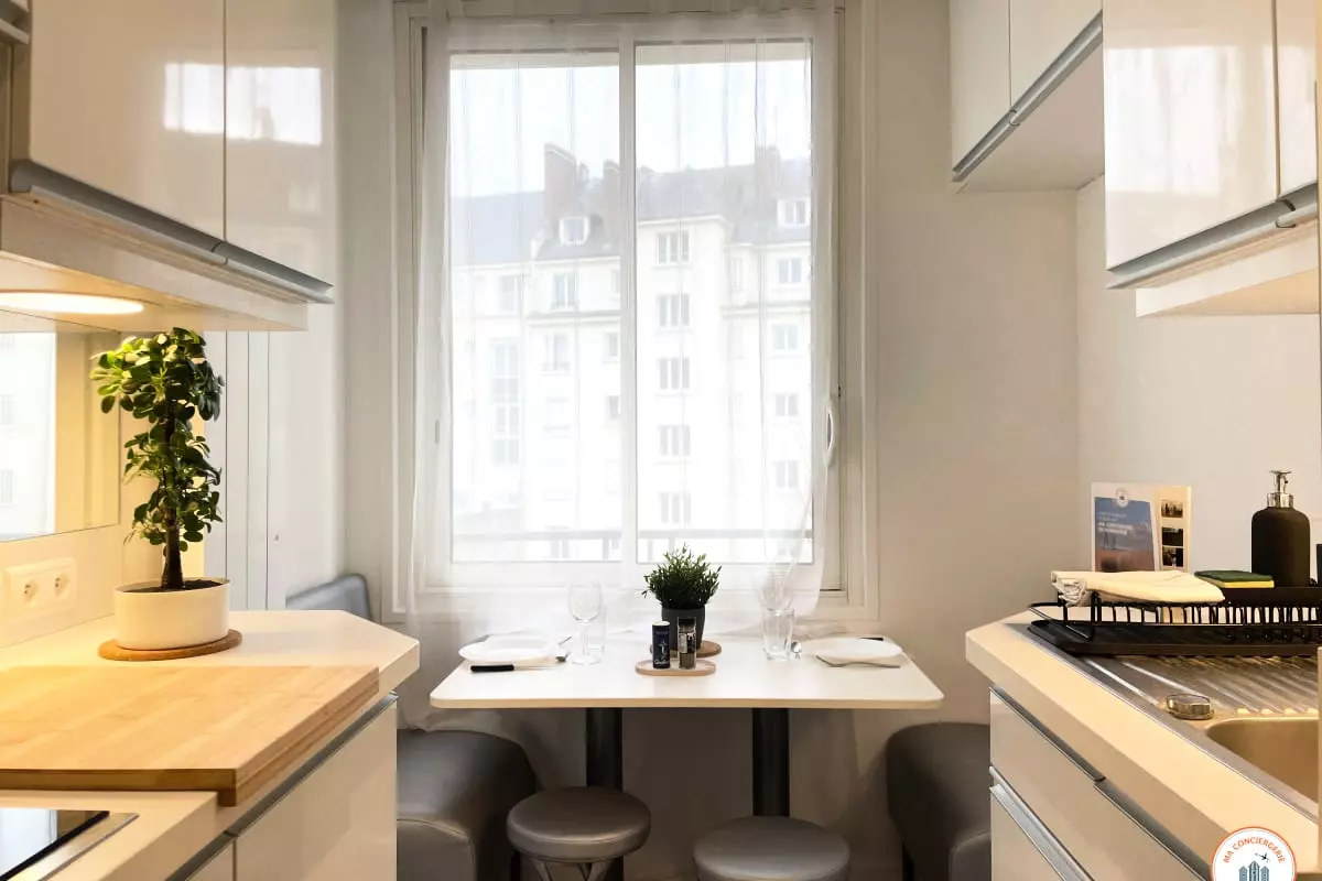 - une cuisine équipée disposant d'un espace repas, avec réfrigérateur, four/micro-ondes, machine à café, et tous les équipements nécessaires pour cuisiner de bons petits plats.