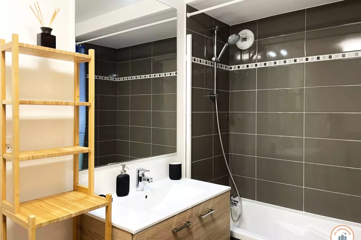 - Une salle de bain avec baignoire, meuble vasque, WC et rangements.