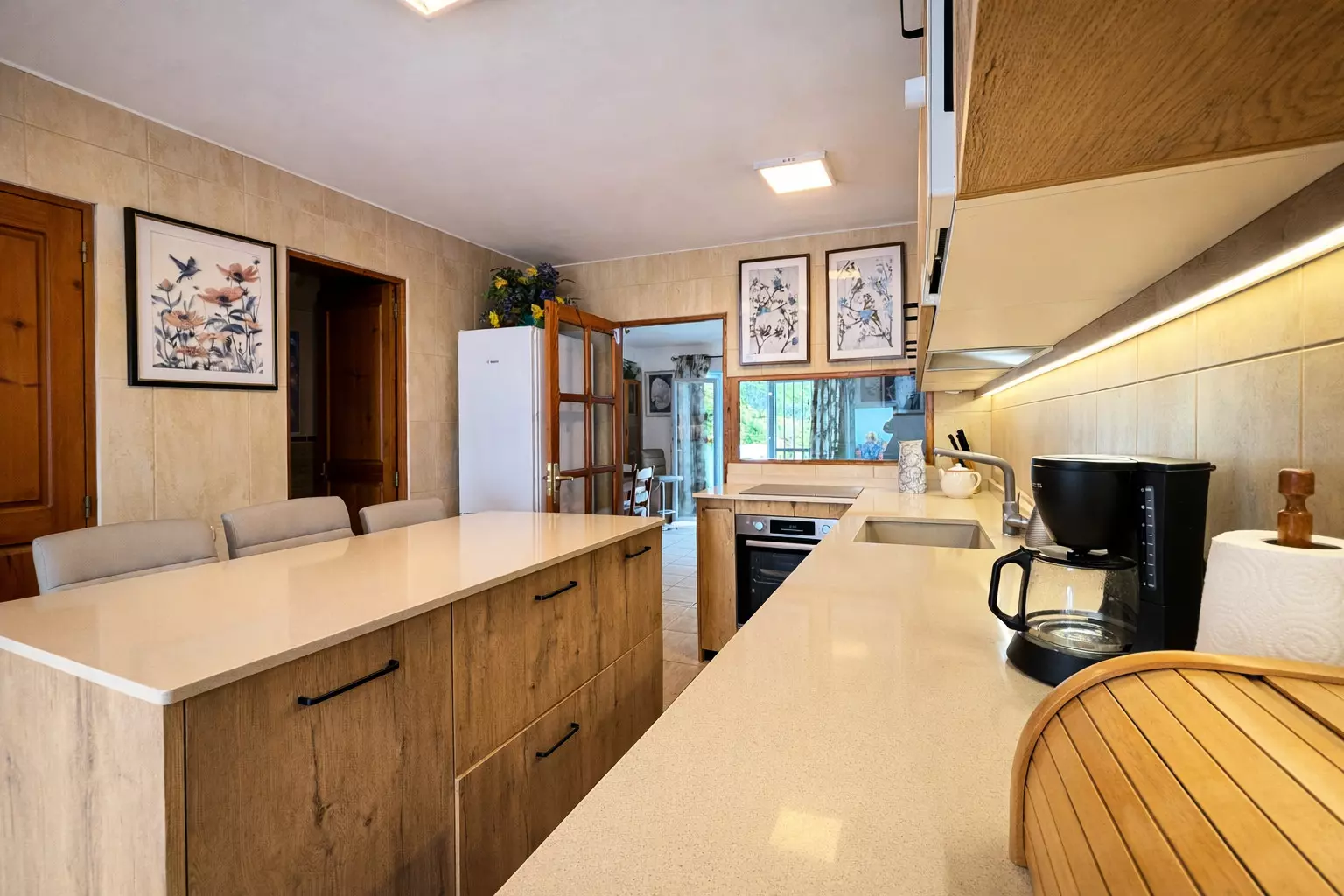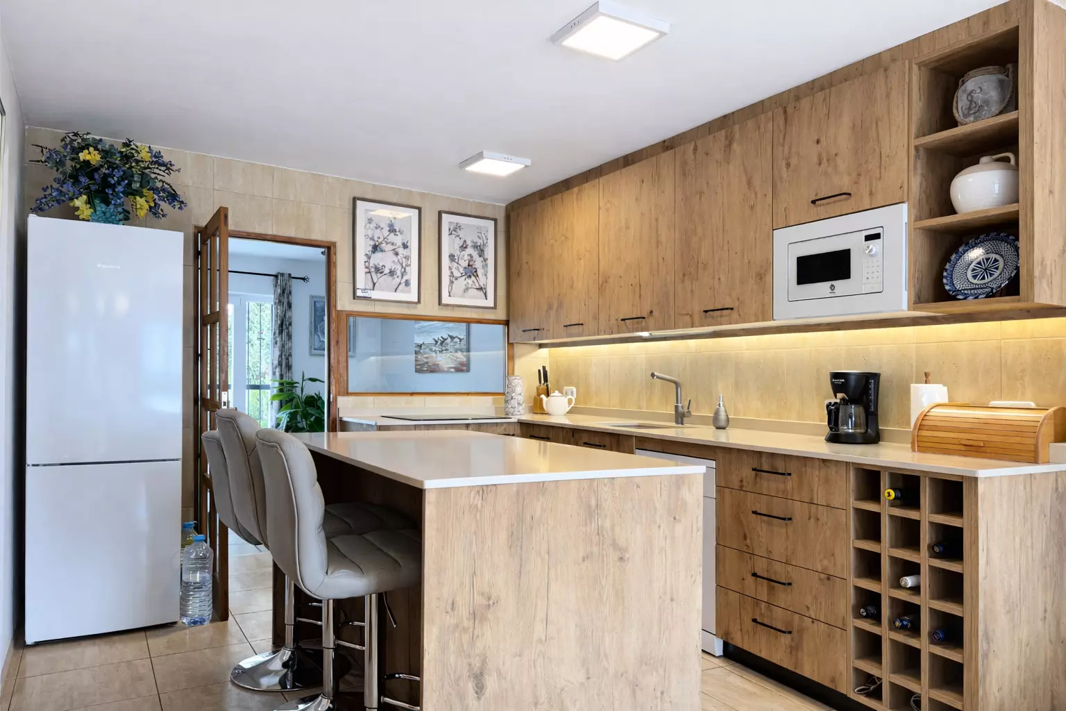 La cuisine est équipée d'un réfrigérateur, d'un four à micro-ondes, d'un four, d'un congélateur, d'un lave-linge, de vaisselle, d'ustensiles de cuisine, d'une cafetière et d'un grille-pain.