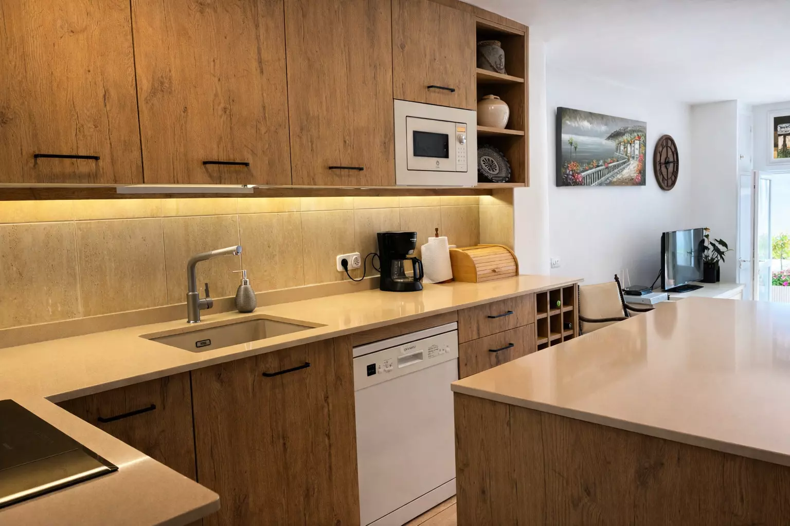 À l'étage inférieur se trouve le salon-salle à manger, avec un canapé confortable, une télévision et un îlot dans la cuisine pour manger.