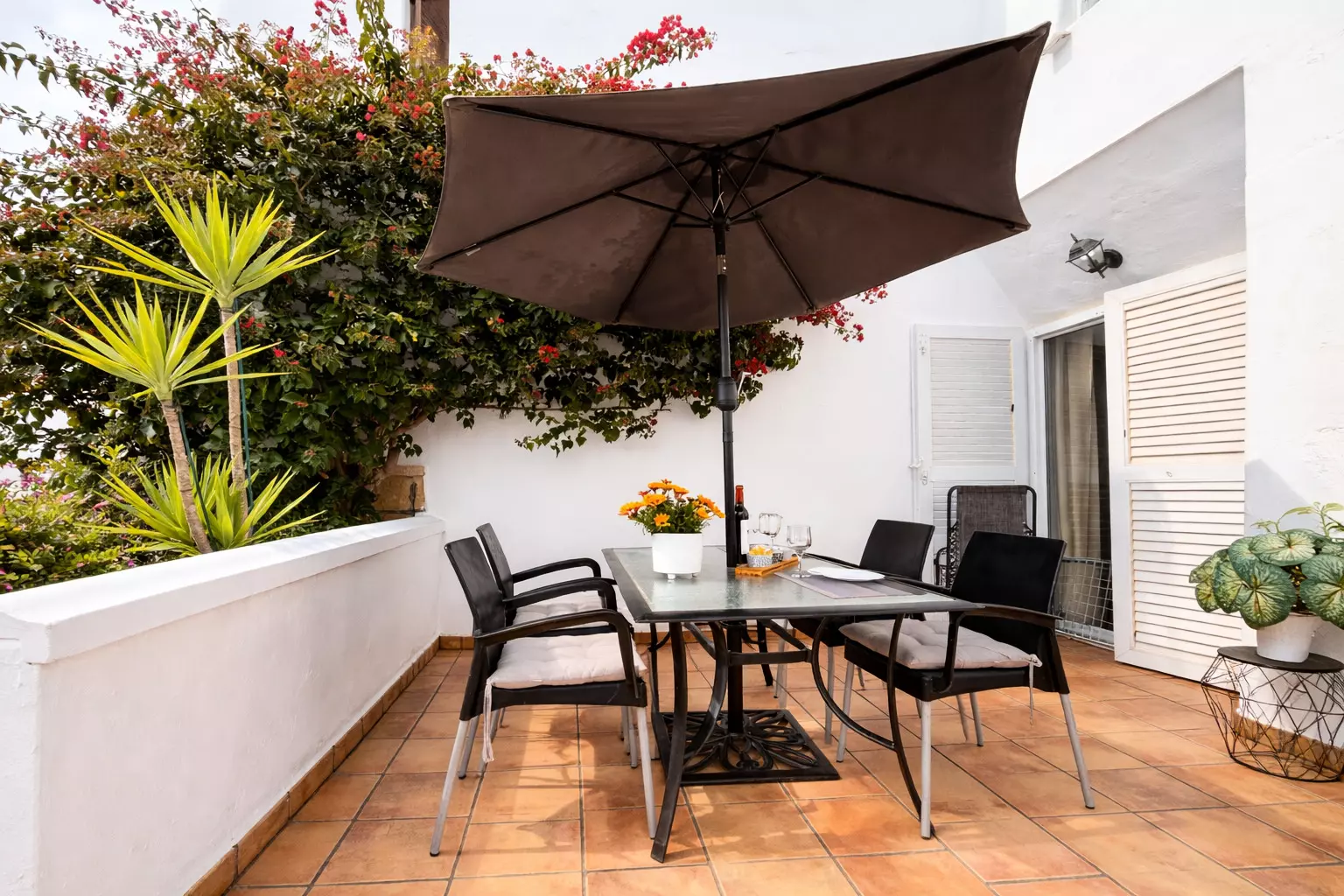 La maison de ville, avec parking et WIFI, dispose de 3 terrasses. La première, face à la mer, avec des vues privilégiées, et un coin repas extérieur couvert d'un parasol.