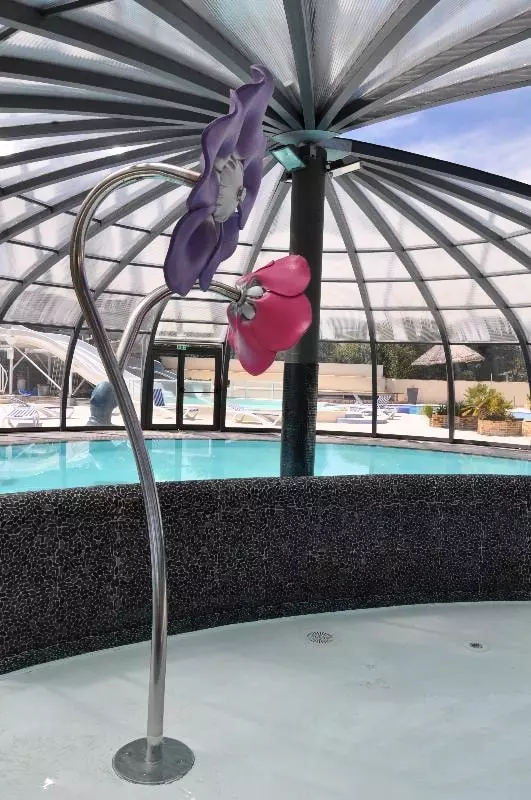 * piscine chauffée avec balnéothérapie et pataugeoire ludique avec plage californienne et petit pentaglisse partant d'un îlot pour les enfants. Piscine couverte chauffée.