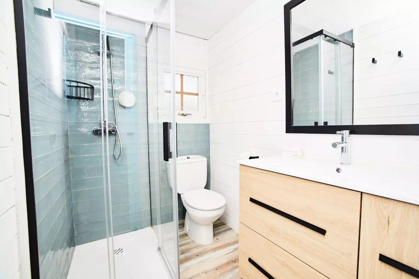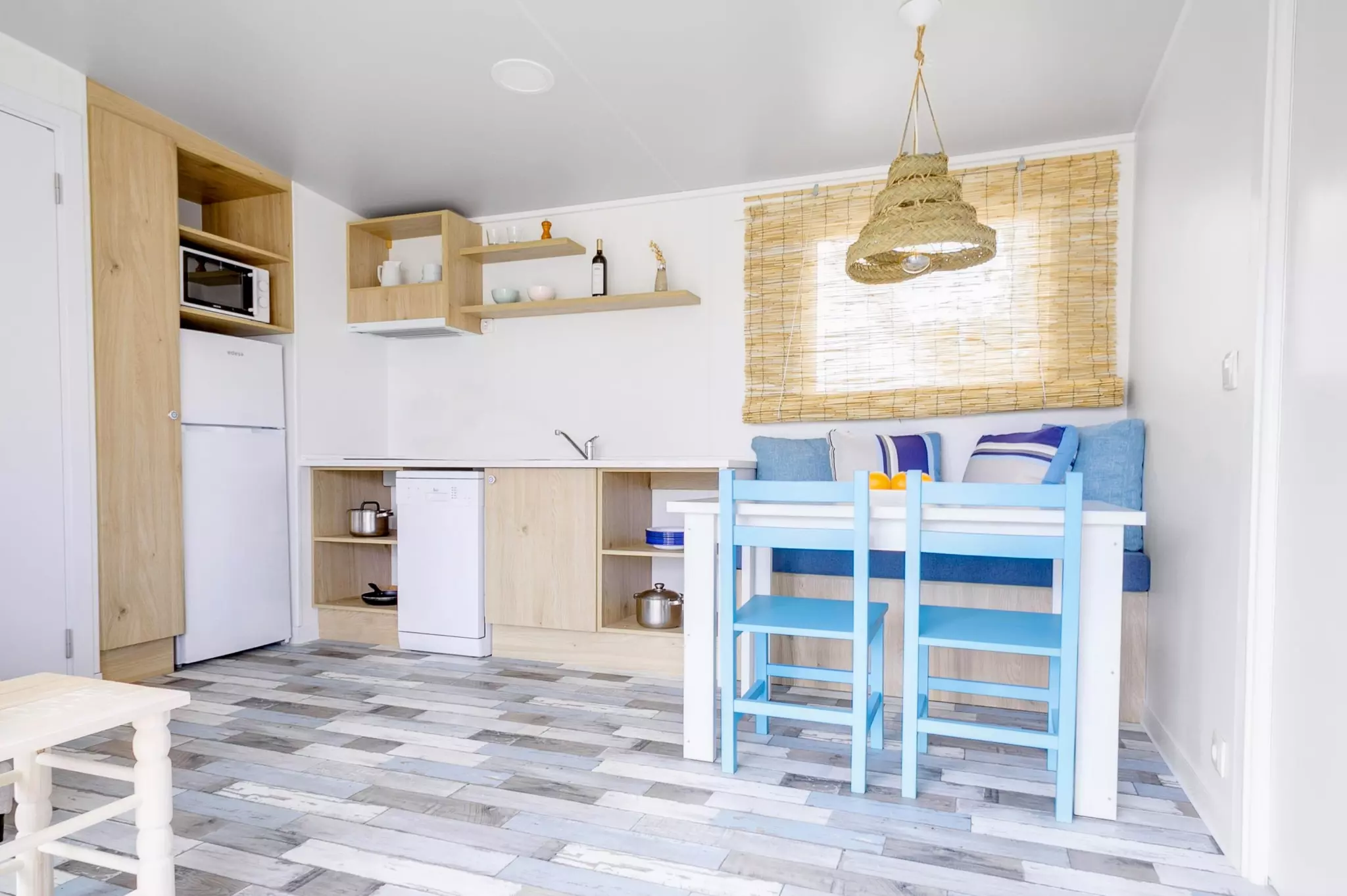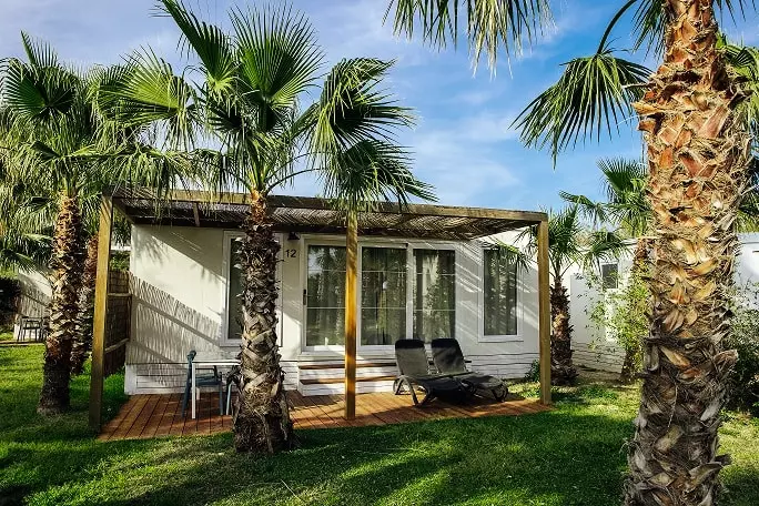 New 36m2 cabin, perfect for a family holiday for up to 5 people. Equipped with living-dining room and two bedrooms with en-suite bathroom, one with double bed, the second with bunk bed and trundle bed. Fully equipped kitchen and bathroom. Cottage with terrace with table and garden outside. Pedestrian street.