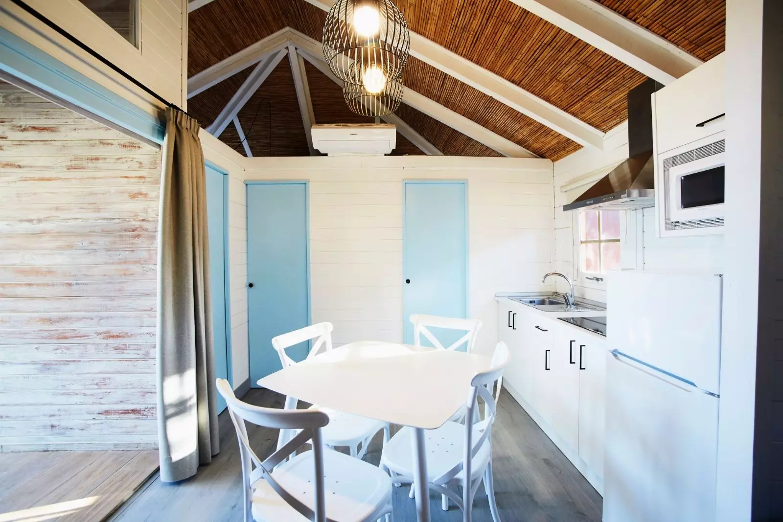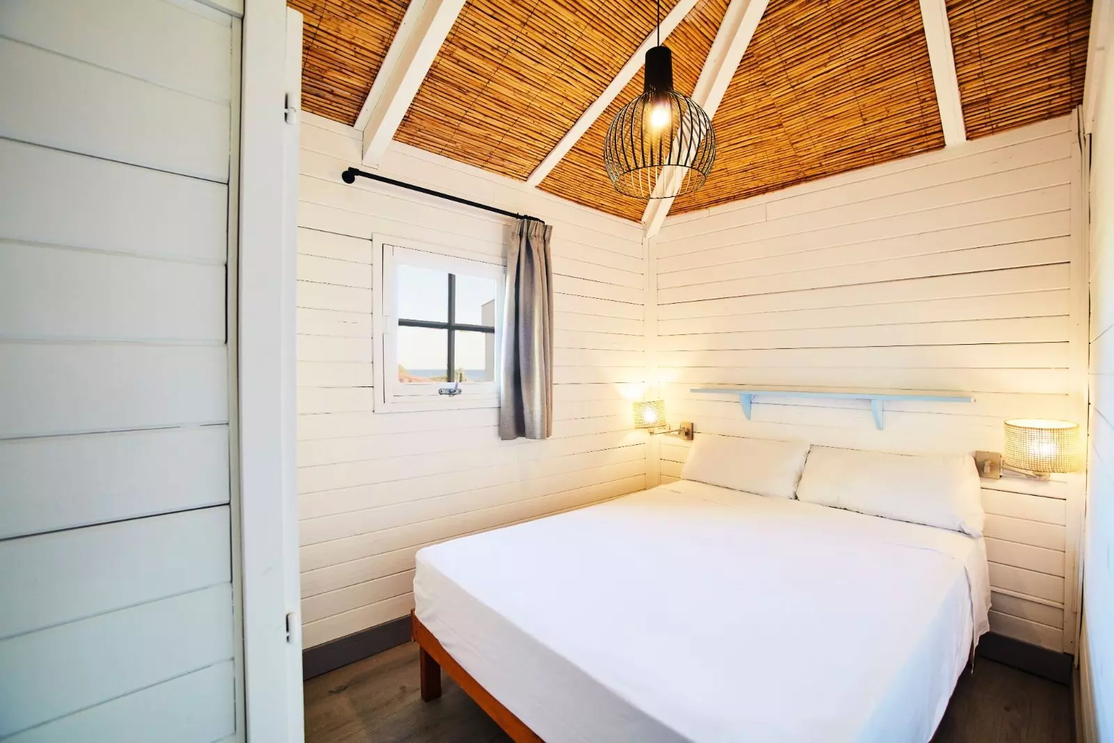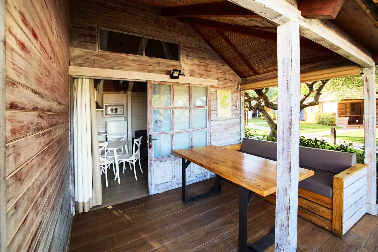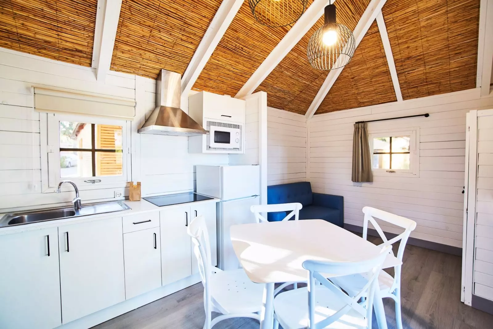 Bungalow en bois avec capacité maximum pour 4 personnes. Composé d'une cuisine-salle à manger totalement équipée avec plats, micro, TV, 2 ou 3 chambres doubles, une salle de bains complète avec douche ou baignoire et eau chaude et une terrasse avec jardin. Les chiens ne sont pas admis.