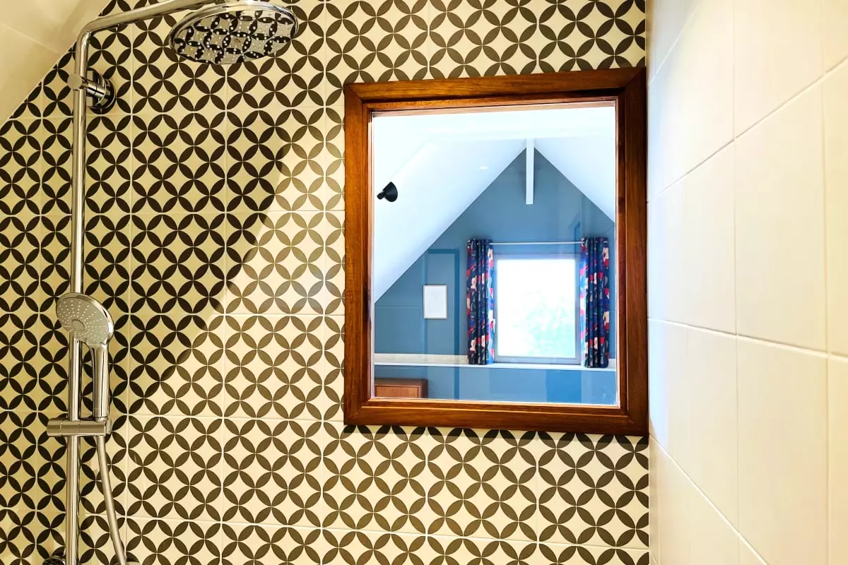 - Une salle de douche de type "Italienne" avec WC qui offre une vue sur les vergers.