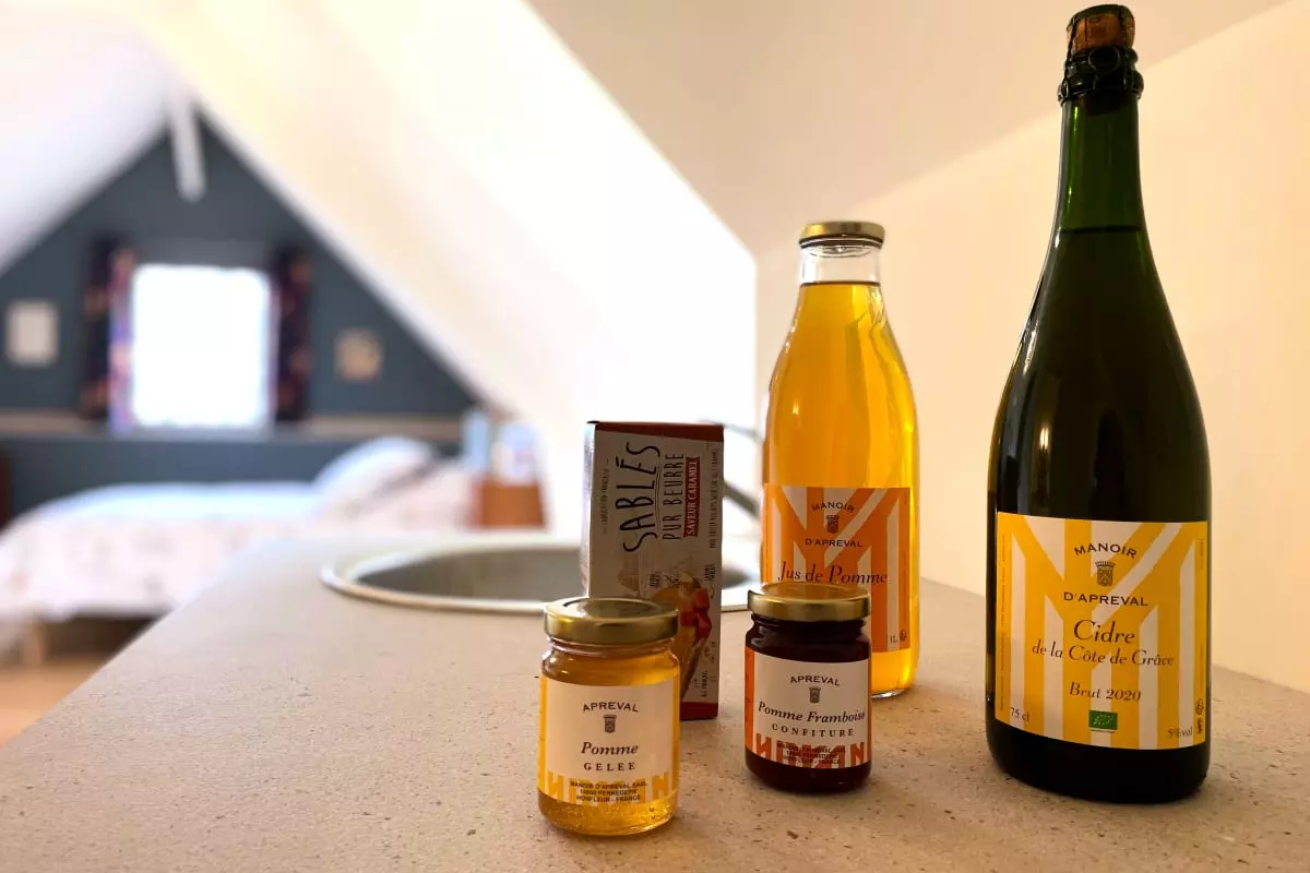 Idéal pour un séjour en famille ou entre amis, nous serons ravis de vous faire vivre une expérience unique en Normandie au cœur du célèbre domaine d'Apreval. Spécialisé dans la culture de la pomme et de la poire, et la fabrication de produits cidricoles, c'est en bord de mer, sur une vingtaine d'hectares, que s'épanouissent les vergers typiques du Pays d'Auge.