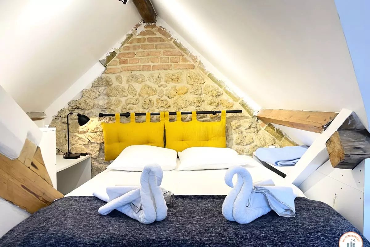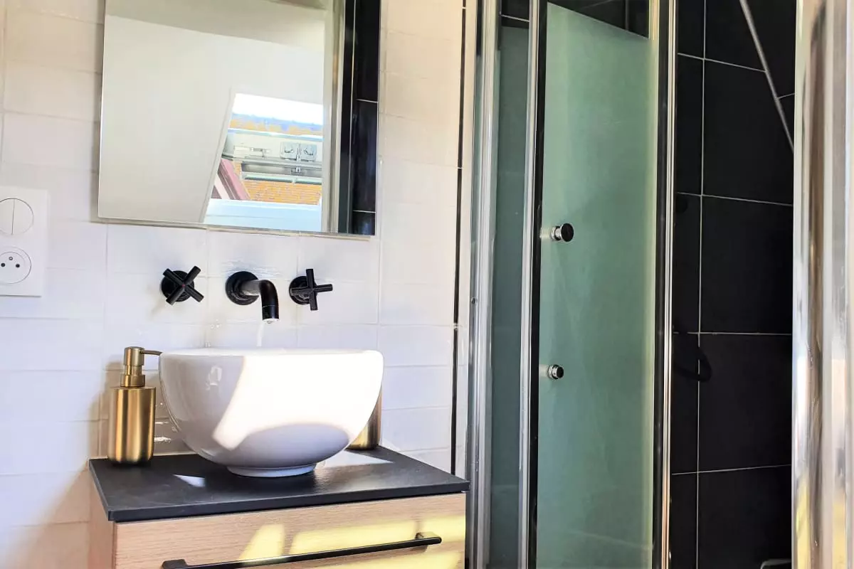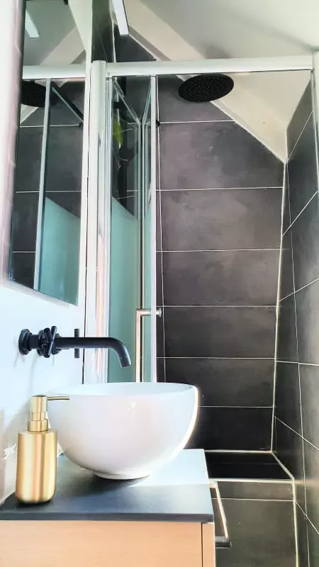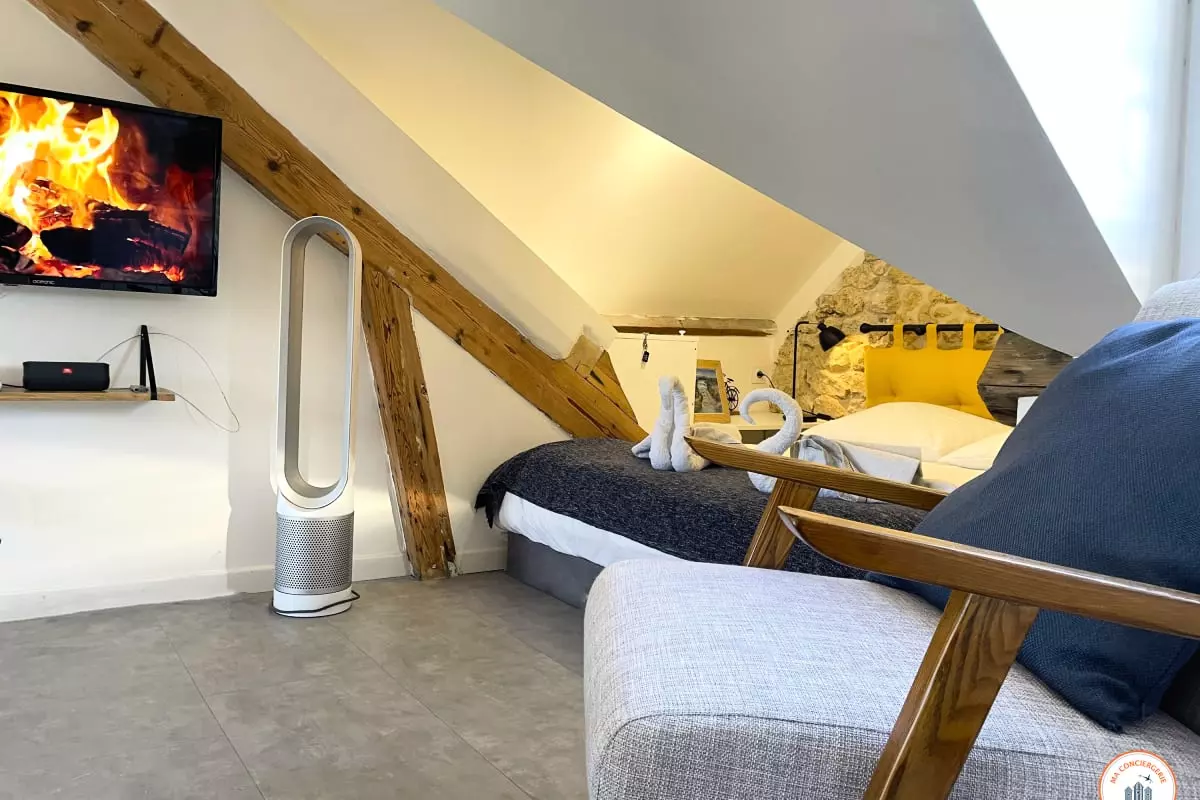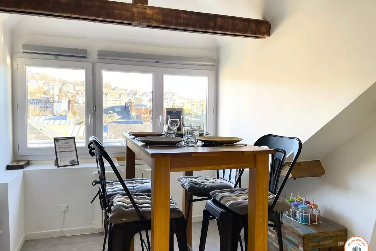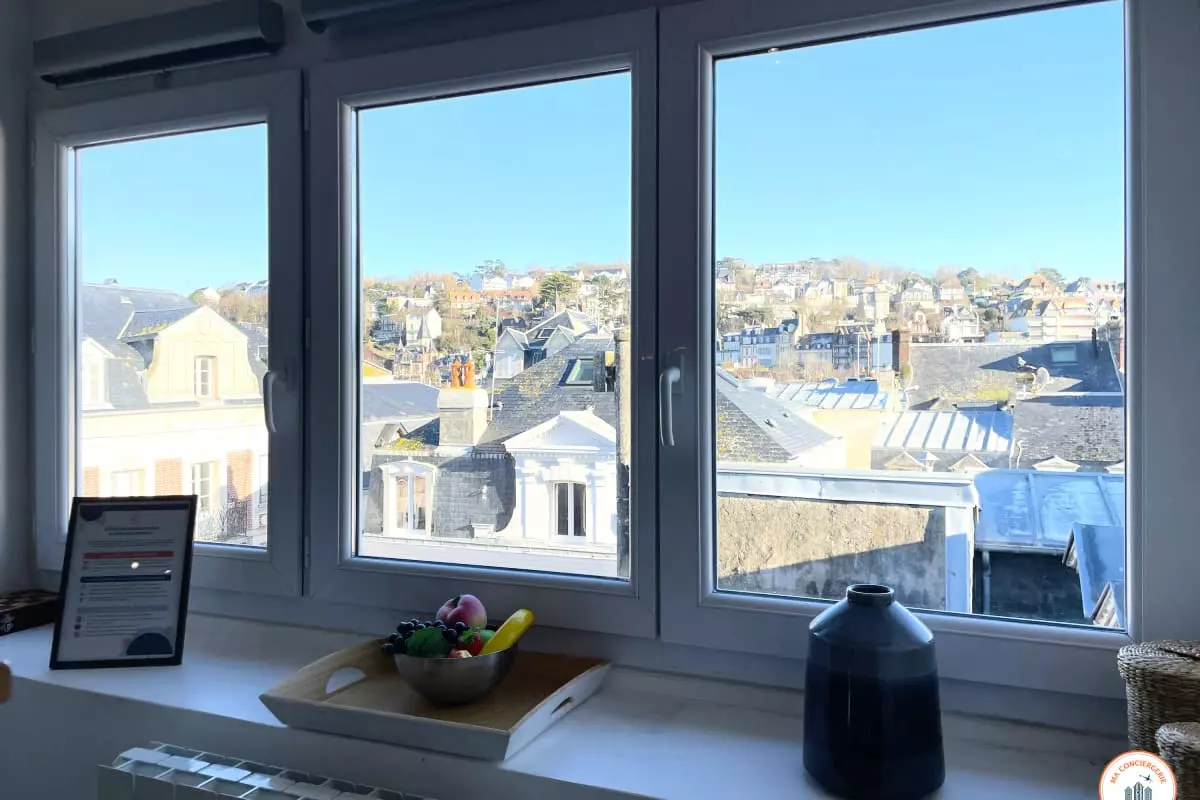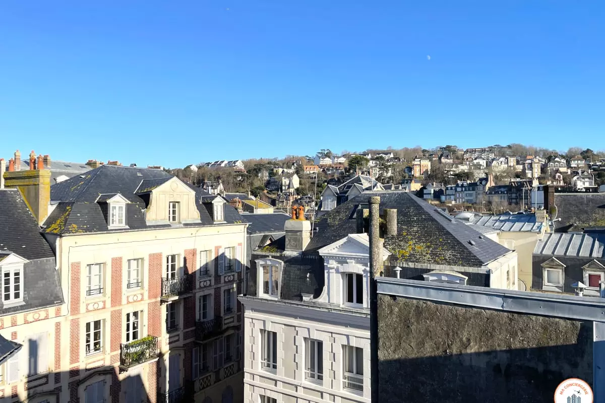 L'appartement se situe au 5e étage (sans ascenseur) d'une résidence calme et sécurisée offrant ainsi une vue imprenable sur les hauteurs de Trouville. A l'intérieur, tout a été pensé pour que vous vous sentiez comme chez vous. Il est composé d’une grande pièce à vivre avec cuisine ouverte (lave-vaisselle, four, machine à café, etc.), d'une belle hauteur sous plafond avec poutres apparentes, d'un coin salon avec TV et canapé convertible haut de gamme (couchage 140x190cm), ainsi que d'un coin chambre équipé d'un lit en 140x200cm (marque Emma, neuf 16/12/2024). La salle de bain complète ce logement de standing avec douche et vasque design, WC, sèche serviette et sèche-cheveux.