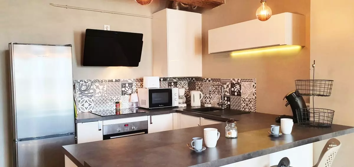 - une cuisine ouverte entiÚrement équipée avec réfrigérateur, four, micro-ondes, lave-vaisselle, machine à café Senséo, et tous les équipements nécessaires pour cuisiner de bons petits plats.