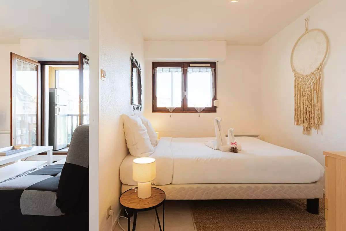 Le couchage principal se compose d'une chambre accueillante dotée d'un lit double de 180x200 pour un confort optimal. Dans le salon, vous trouverez un canapé convertible de 90x190 permettant d'accueillir jusqu'à trois personnes au total pour votre séjour.