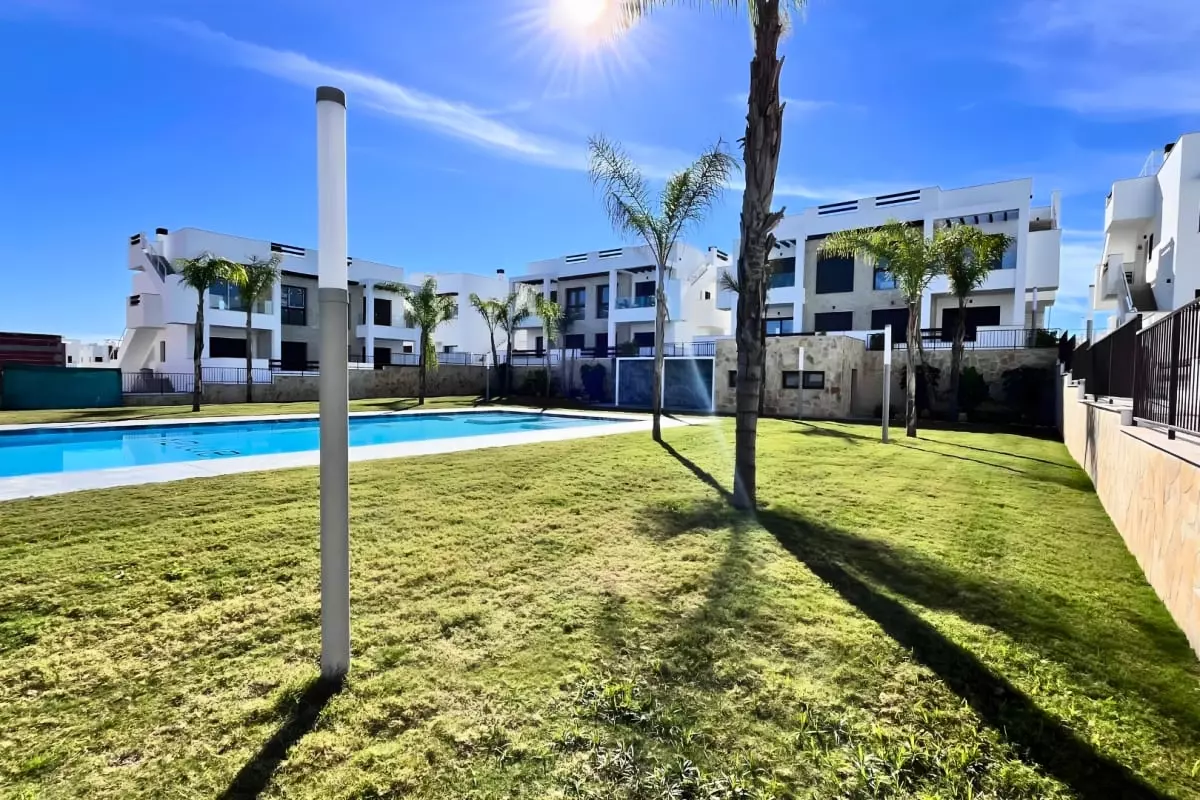 La résidence, moderne et arborée, offre un cadre idéal pour profiter du soleil de la Costa Blanca, avec de vastes jardins, une grande piscine communautaire et des espaces de détente.