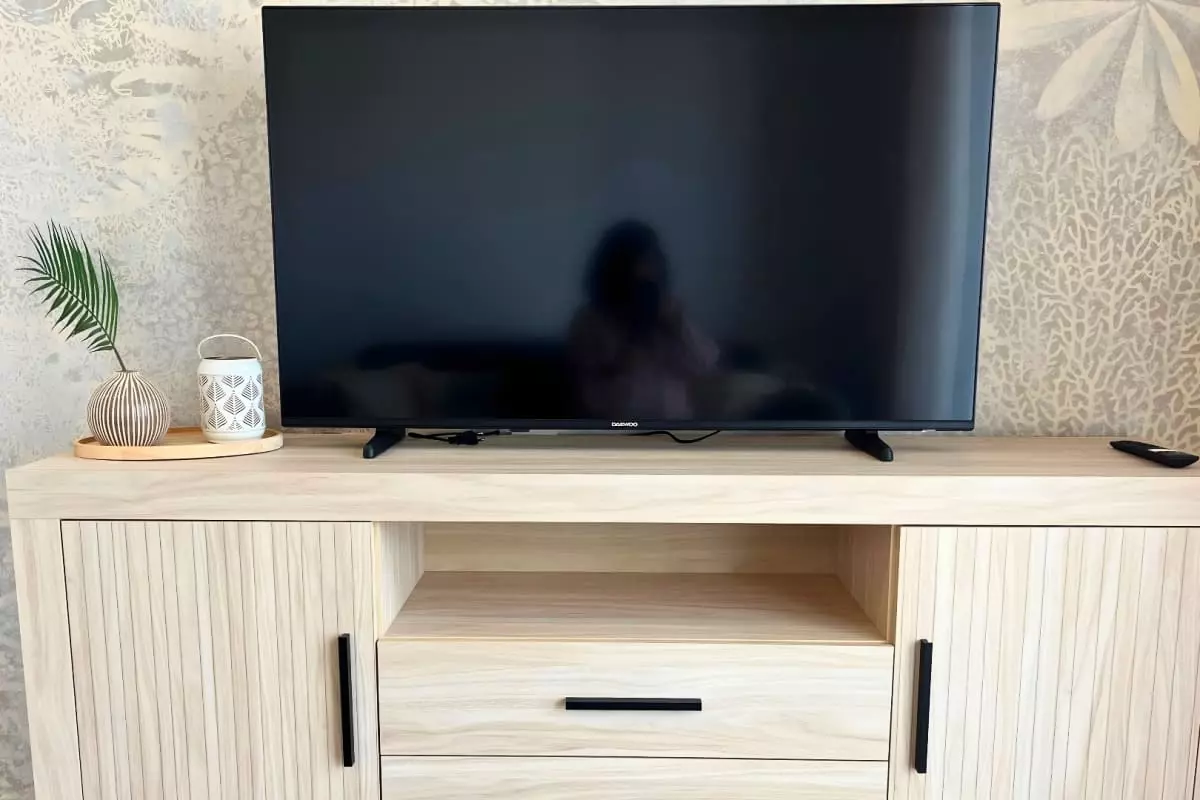 Le logement s’ouvre sur un grand salon séjour confortable avec climatisation et wifi intégrée, idéal pour se détendre en famille, entre amis ou pour télétravailler. La pièce de vie communique avec une cuisine entièrement équipée : four, plaques, lave-vaisselle, grand réfrigérateur, cafetière, grille-pain… tout le nécessaire pour vos repas sur place.