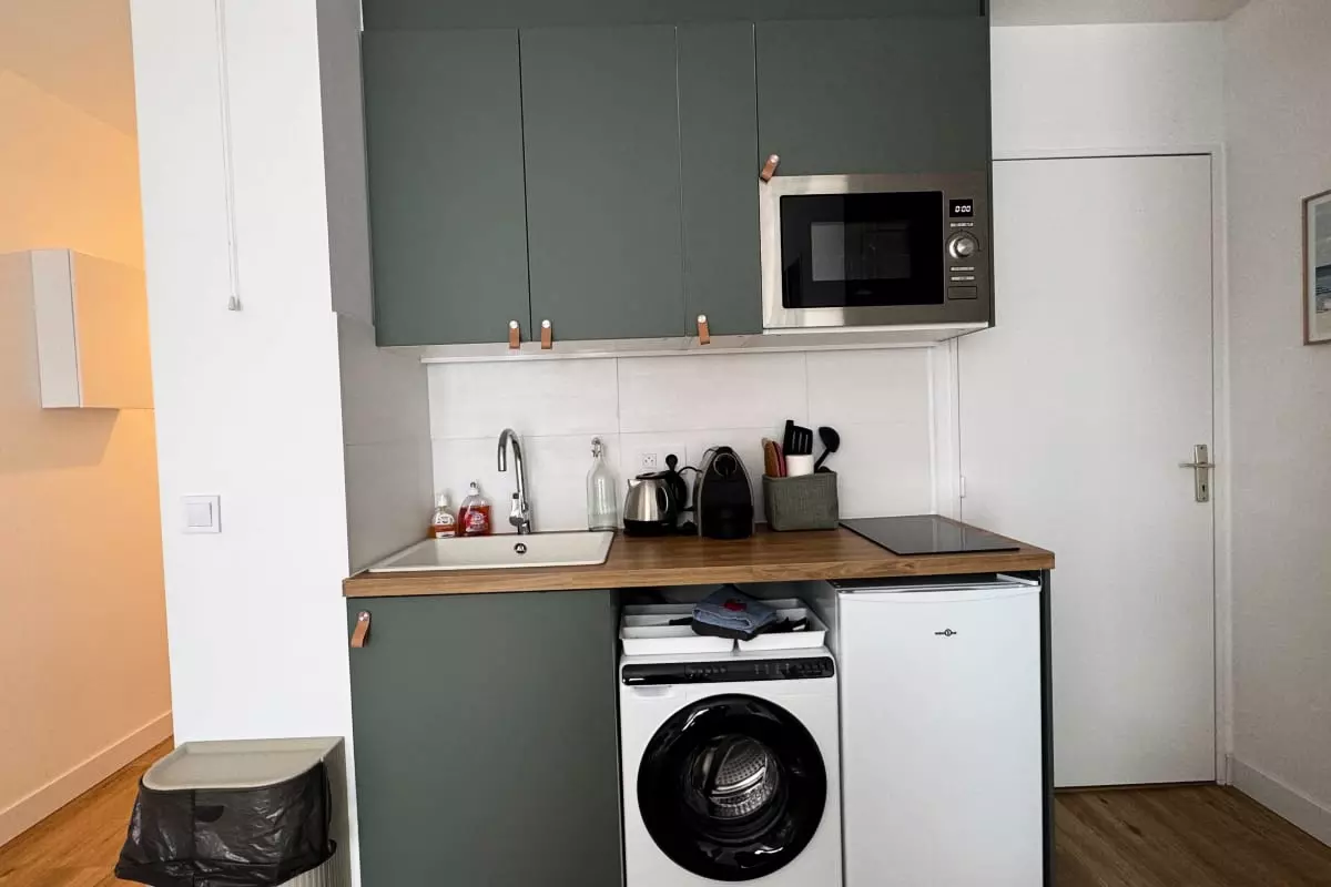 La kitchenette est entièrement équipée avec un four micro-ondes, une bouilloire, une cafetière ainsi qu'un lave-vaisselle pour plus de simplicité.