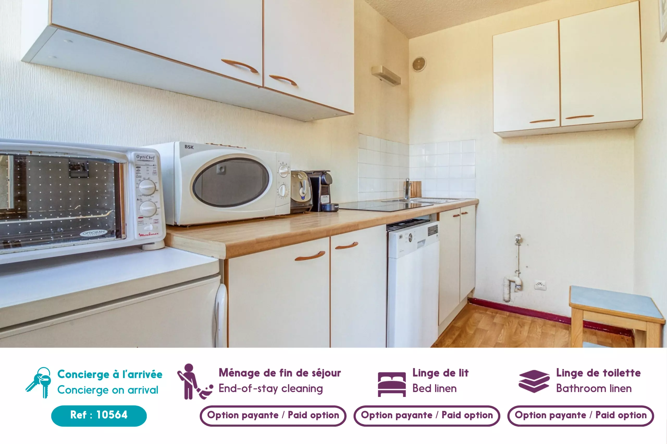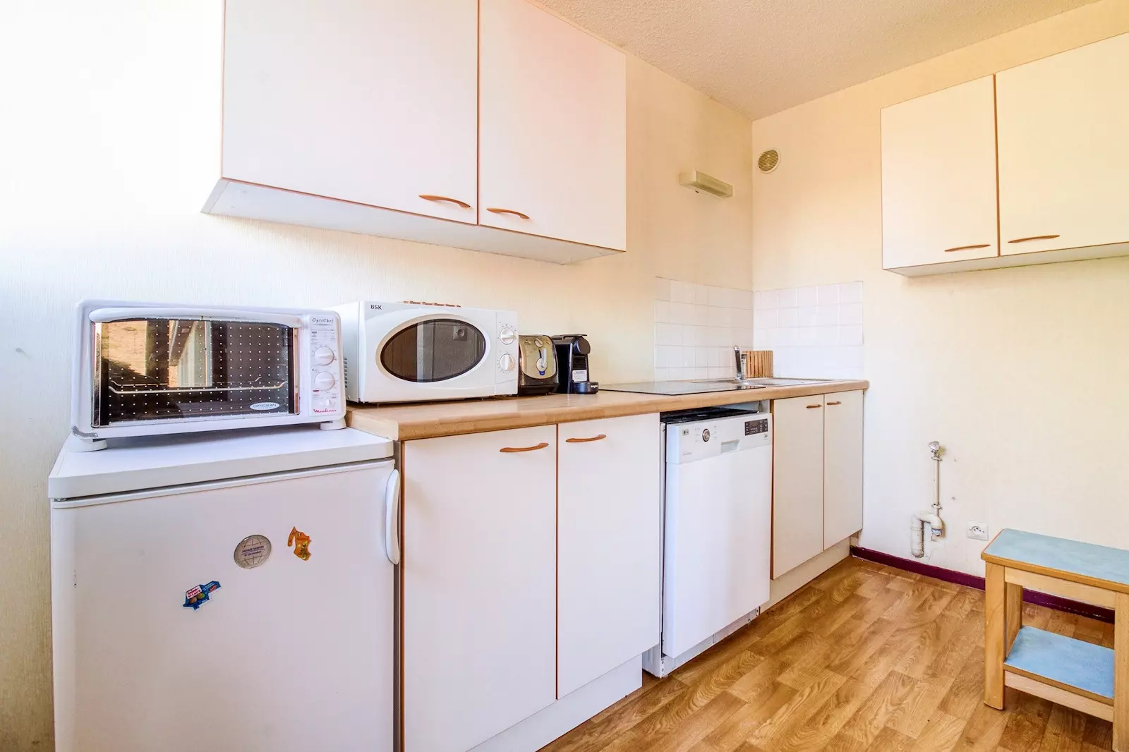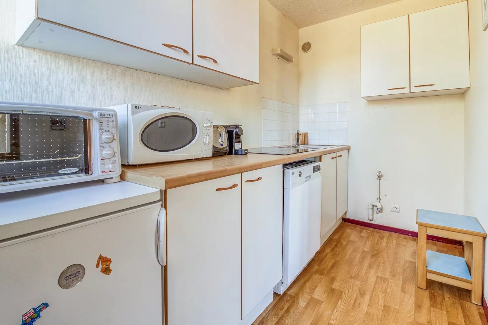 Ce studio accueillant de 31 m² peut accueillir jusqu'à 4 personnes. La cuisine indépendante est équipée d'un micro-ondes, d'un four et de plaques vitrocéramiques, d'un réfrigérateur, d'un lave-vaisselle, d'une cafetière et d'une bouilloire. On trouve ensuite un séjour avec son coin repaos et son salon, disposant d'un canapé lit offrant un couchage pour 2. Une chambre avec un lit superposé ainsi qu'une salle de bain et un WC complètent ce bien.