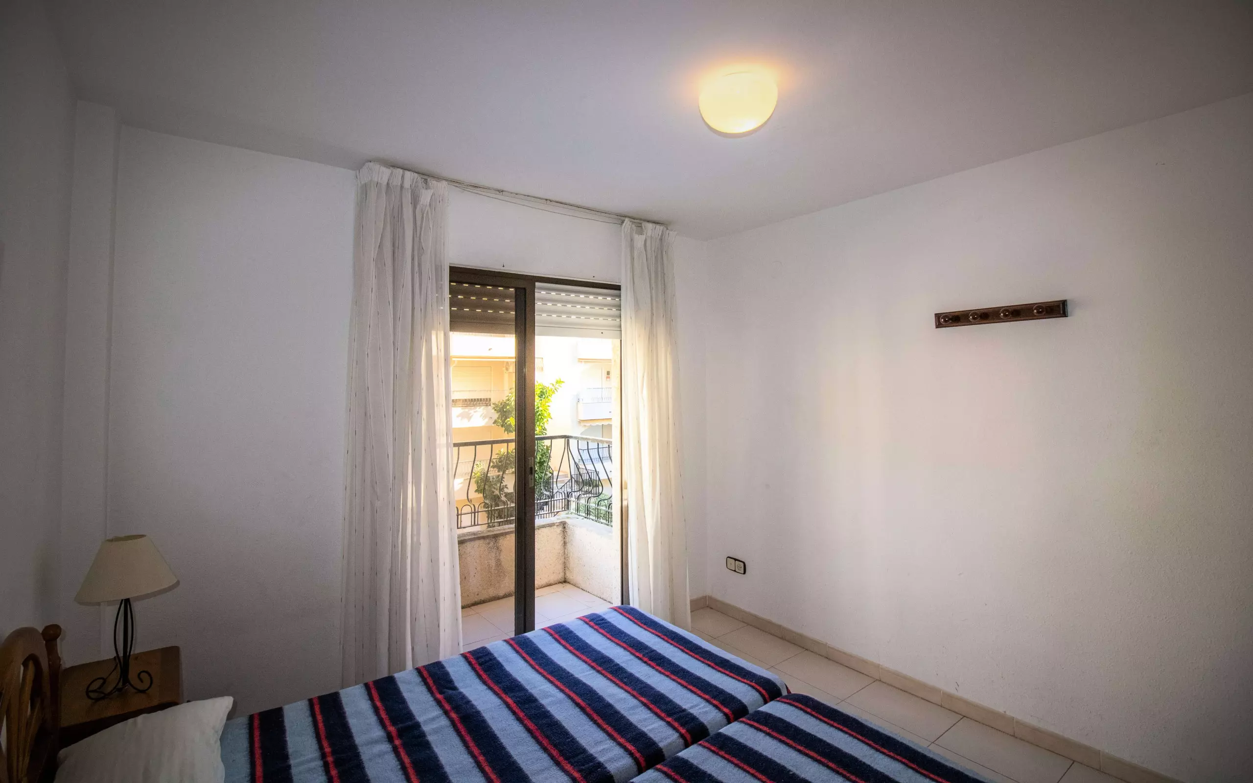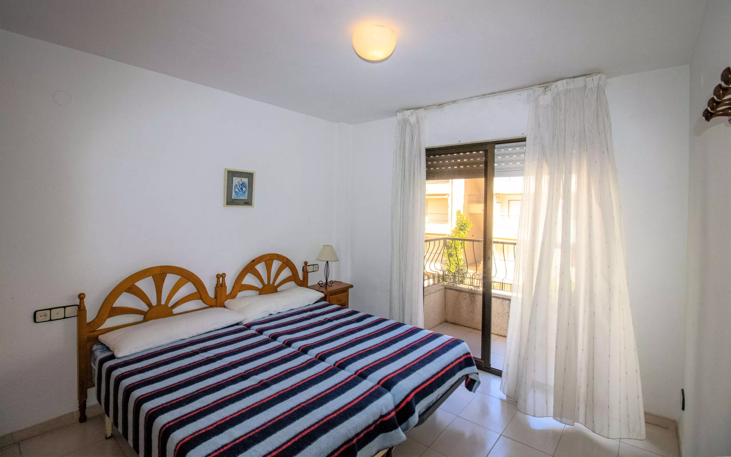 Une chambre à coucher avec deux lits simples, une armoire intégrée et un balcon privé donnant sur la piscine et le jardin.