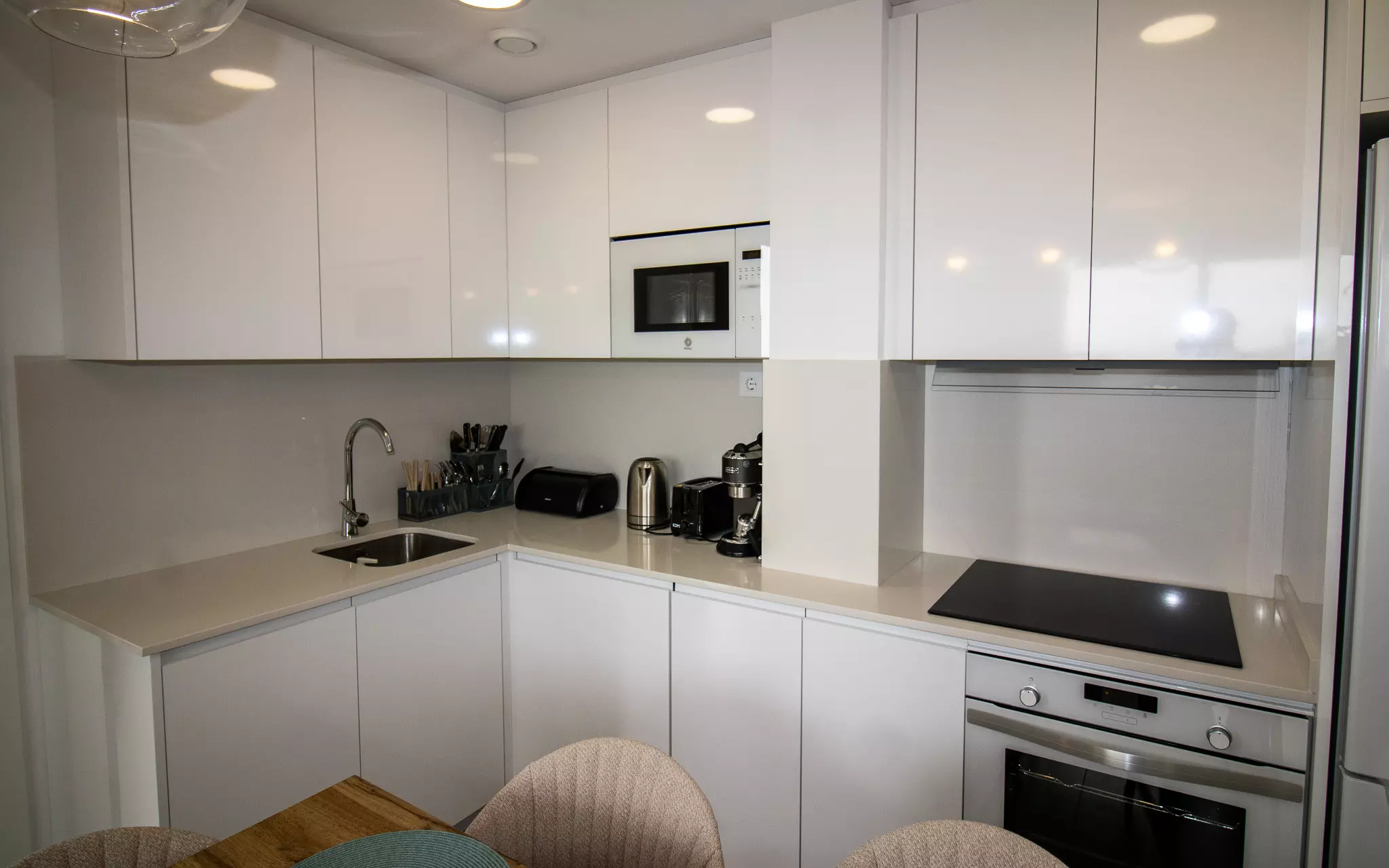 La cuisine américaine, à vitrocéramique, est équipée avec réfrigérateur, micro-ondes, four, congélateur, lave-vaisselle, vaisselle/couverts, ustensiles/cuisine, cafetière et grille pain.