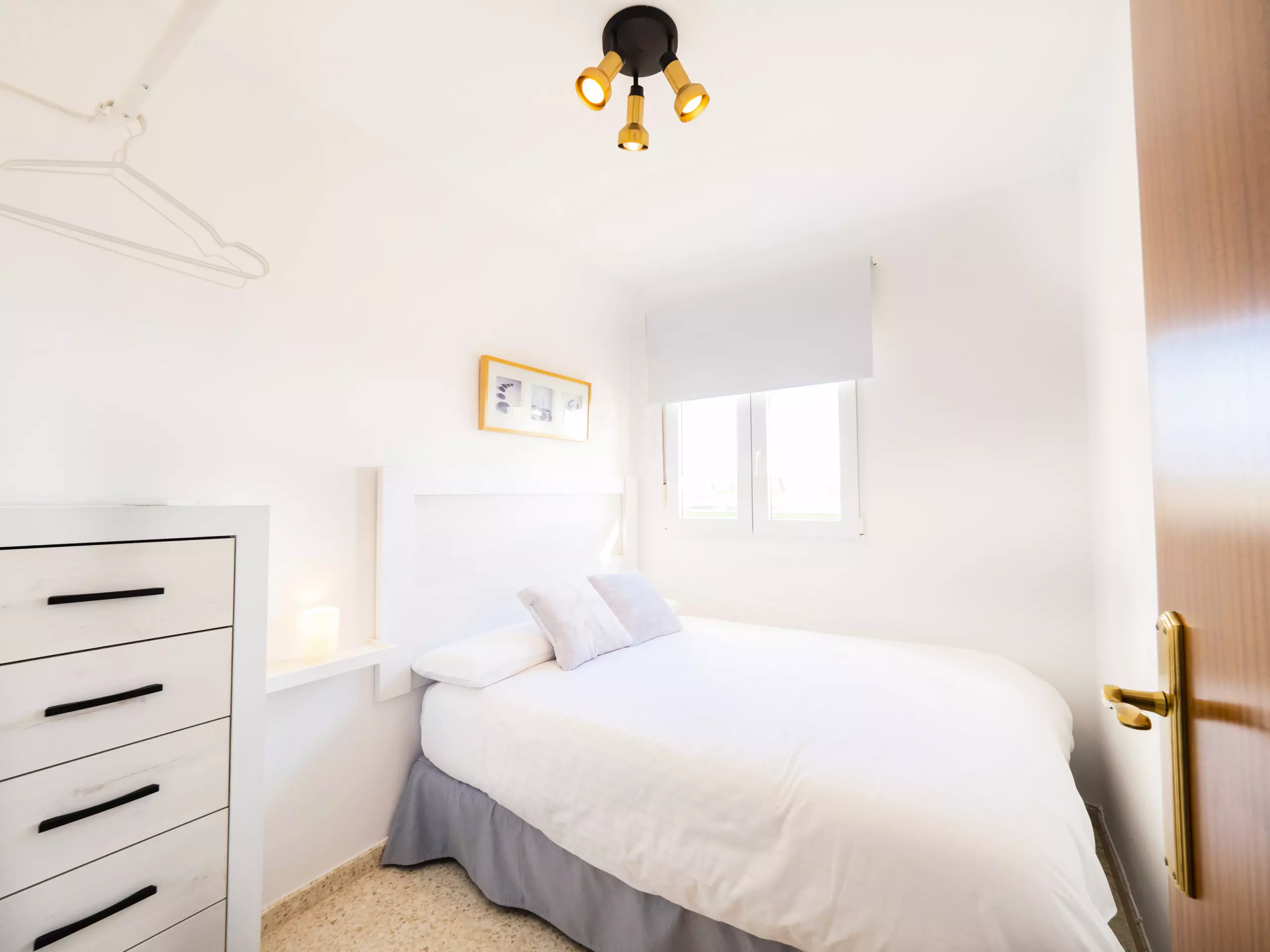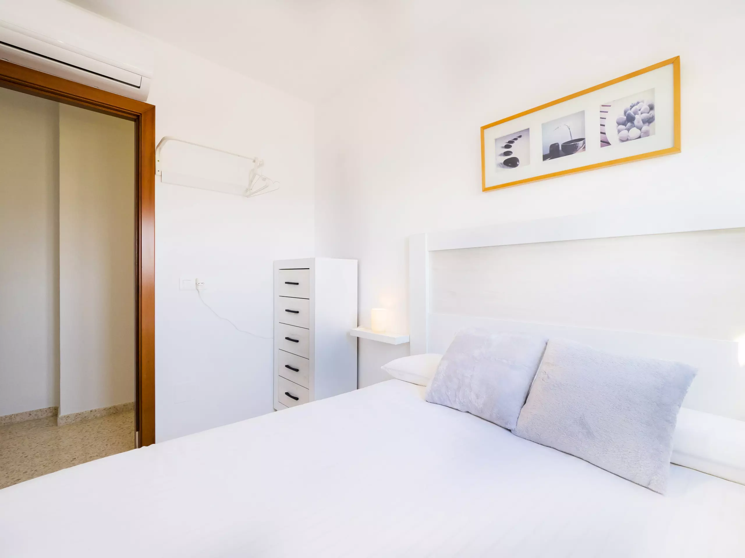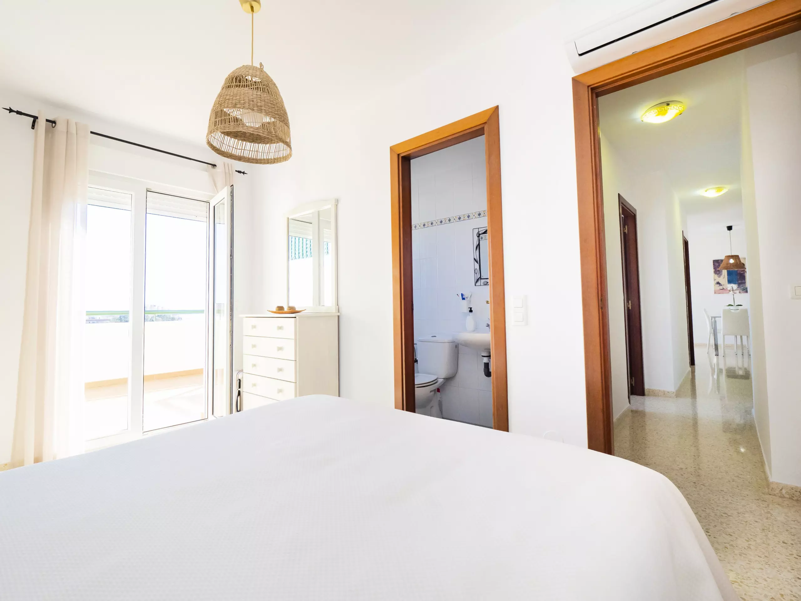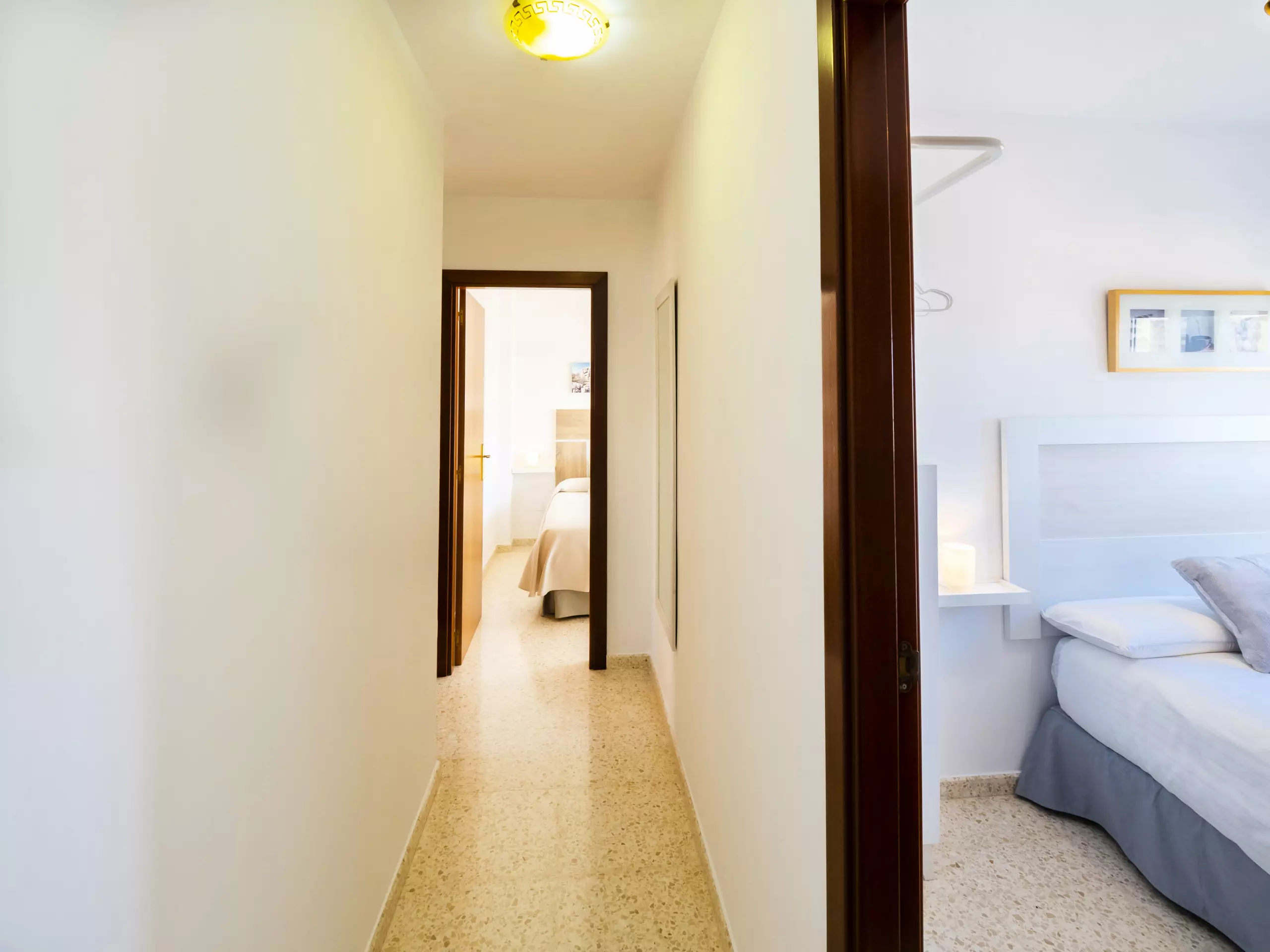 L'appartement dispose de trois chambres, toutes avec des lits doubles et des armoires pour ranger vos bagages. L'une d'entre elles a un accès direct à la terrasse et une salle de bain attenante avec une douche, idéale pour le confort et la confidentialité des familles avec enfants. De plus, il y a une salle de bain complète supplémentaire avec baignoire, située dans le couloir qui relie les chambres. ??