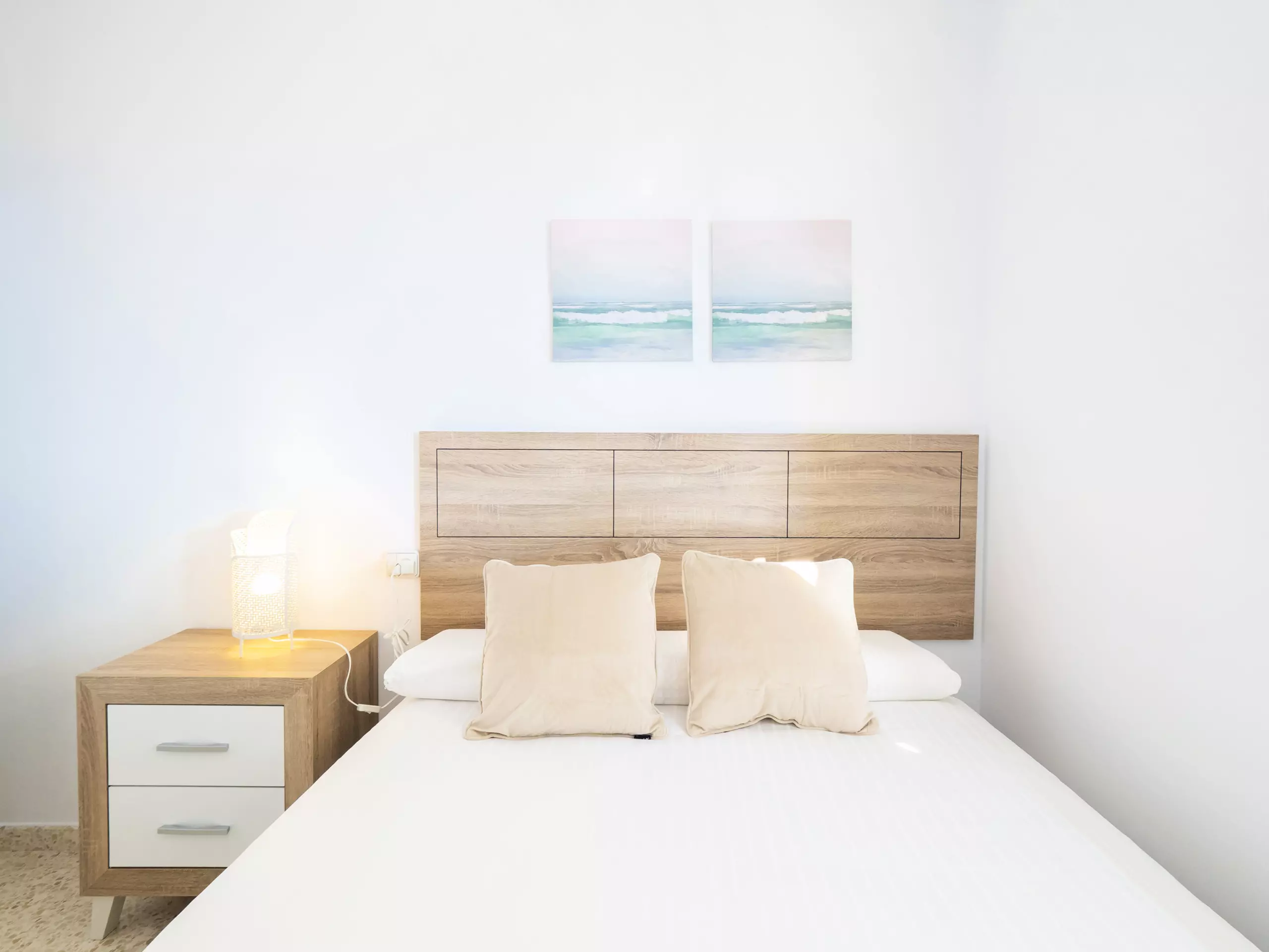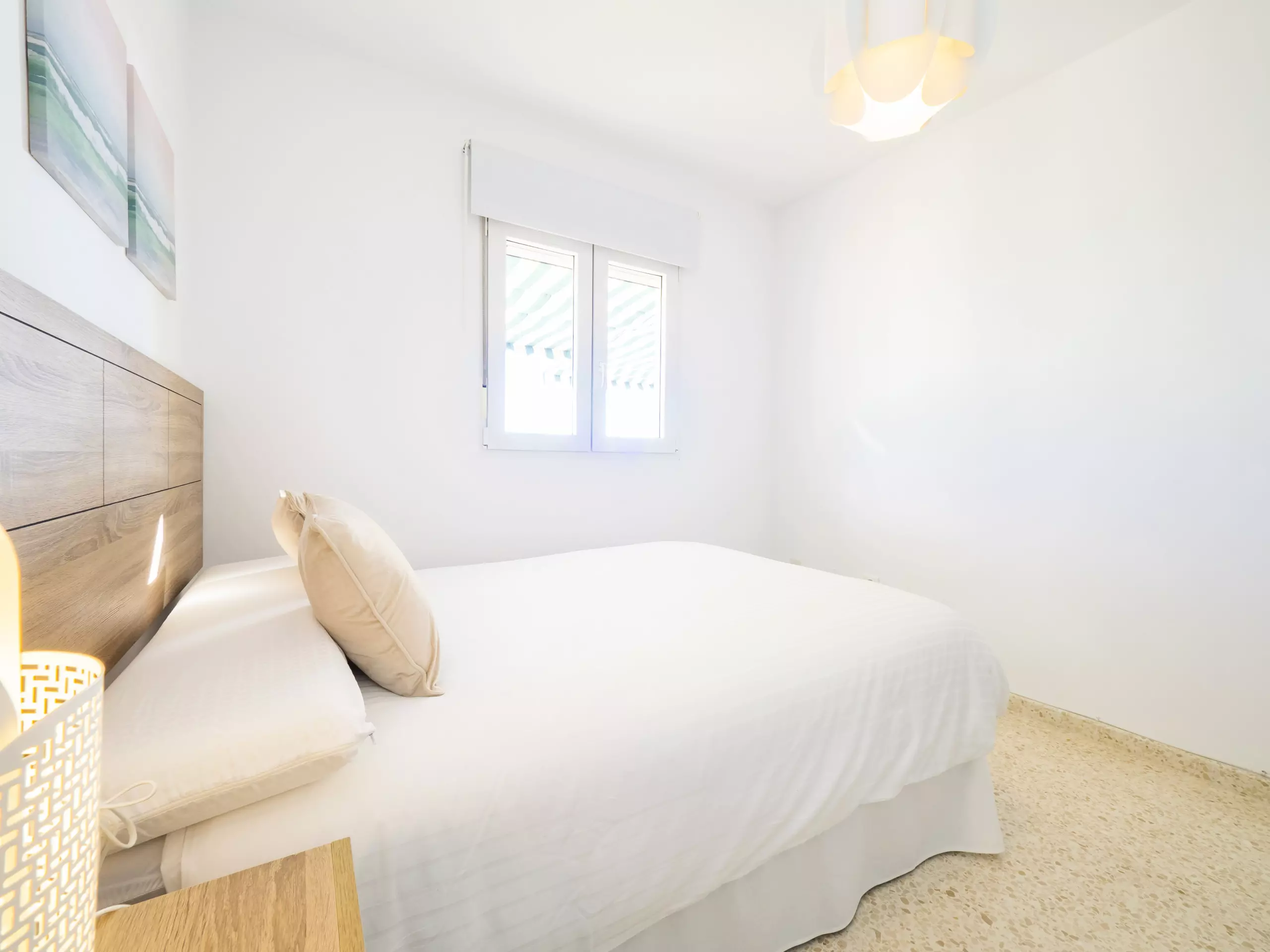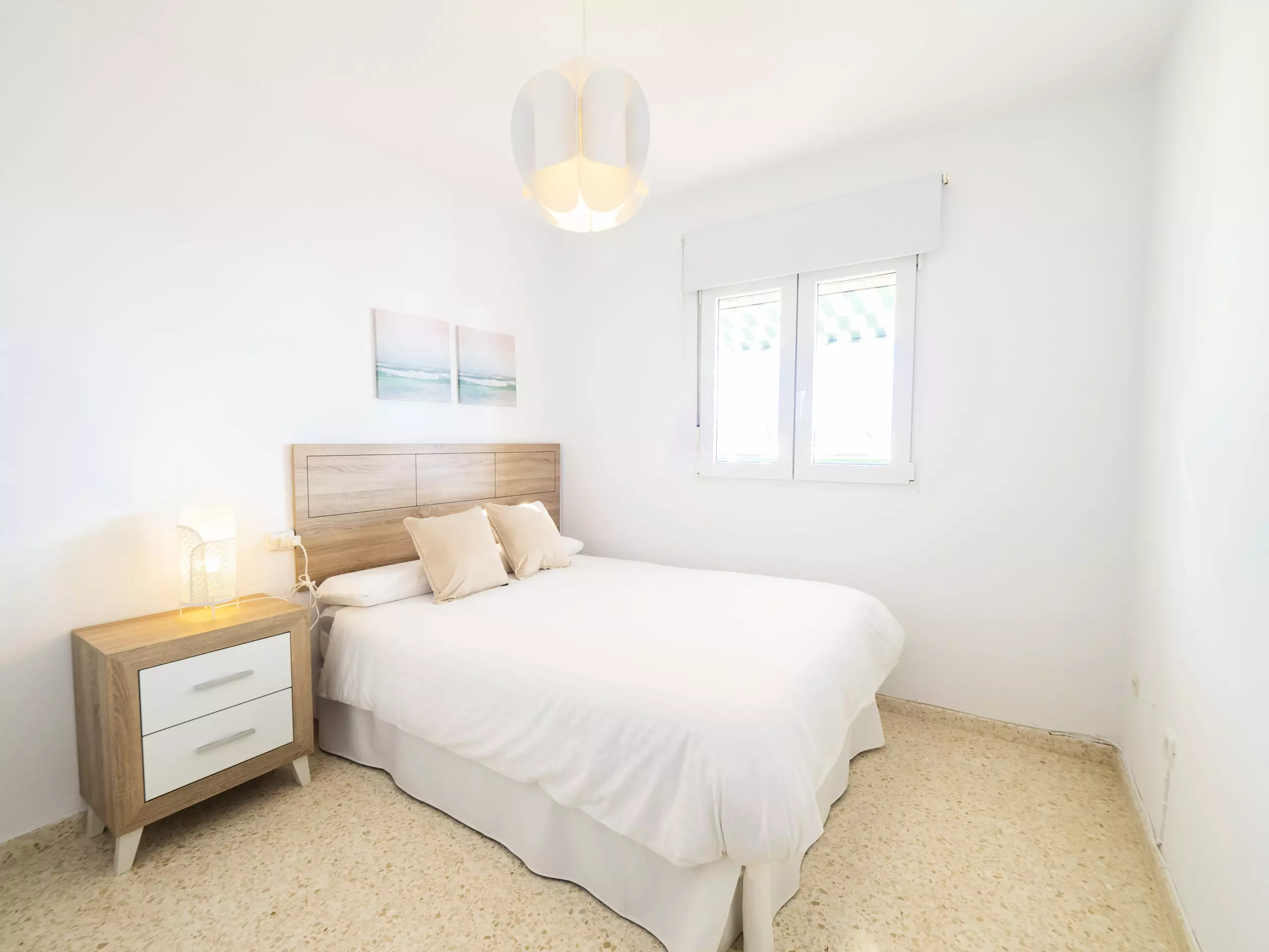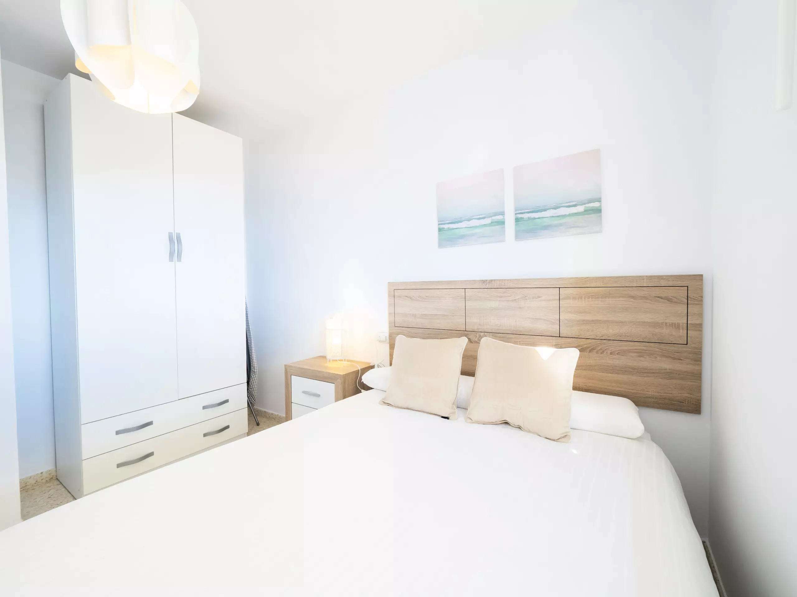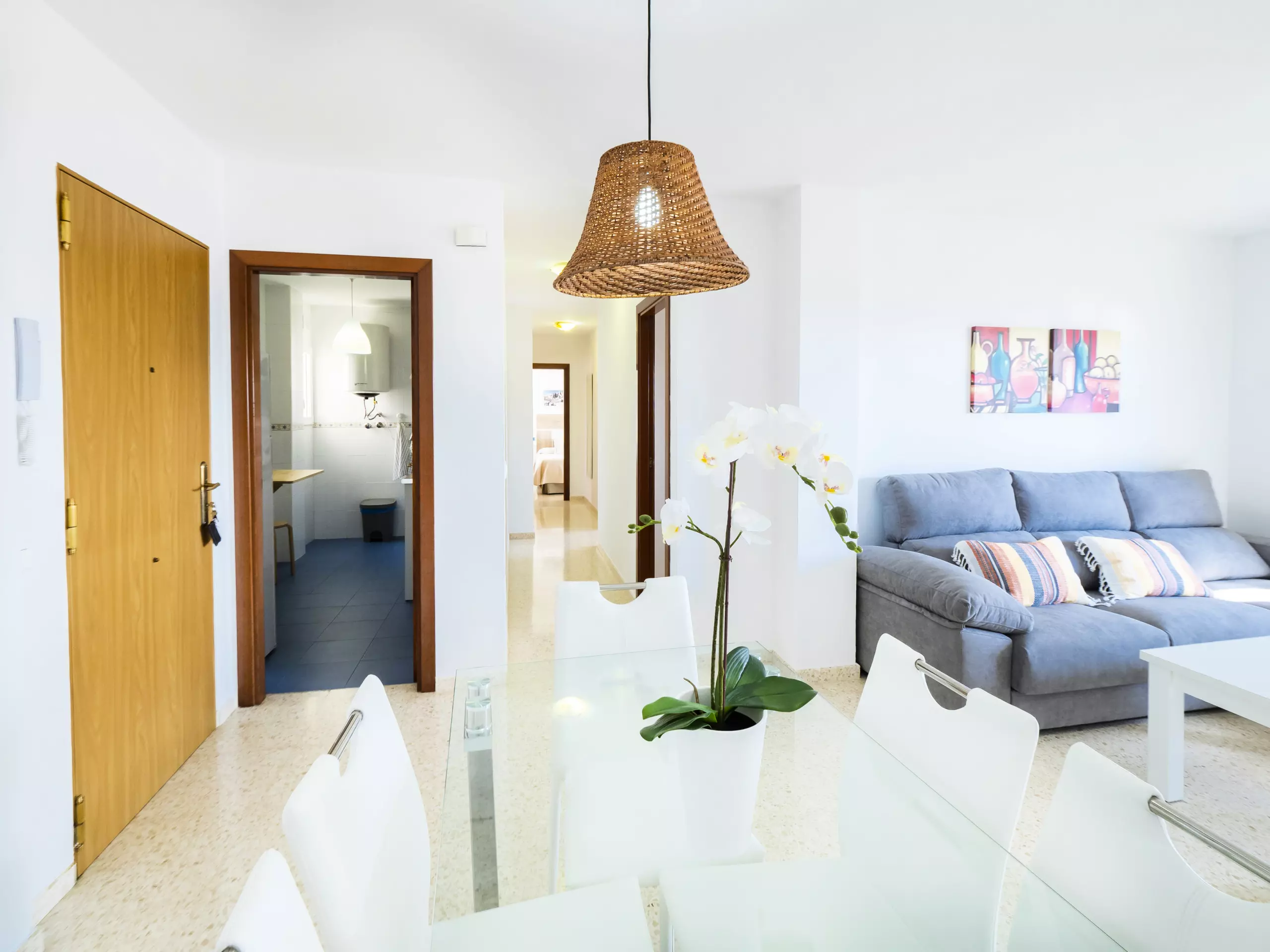 L'appartement dispose de trois chambres, toutes avec des lits doubles et des armoires pour ranger vos bagages. L'une d'entre elles a un accès direct à la terrasse et une salle de bain attenante avec une douche, idéale pour le confort et la confidentialité des familles avec enfants. De plus, il y a une salle de bain complète supplémentaire avec baignoire, située dans le couloir qui relie les chambres. ??