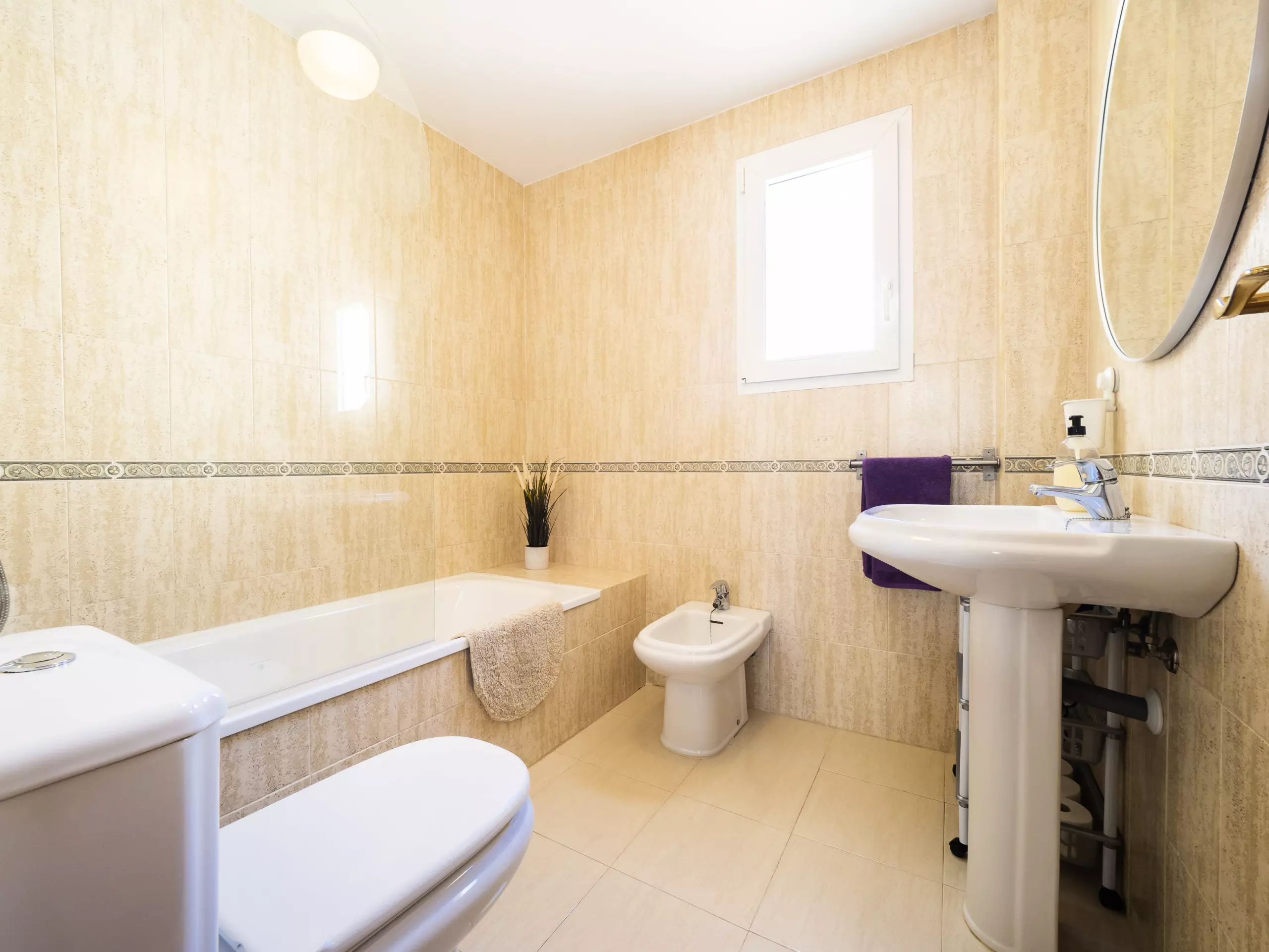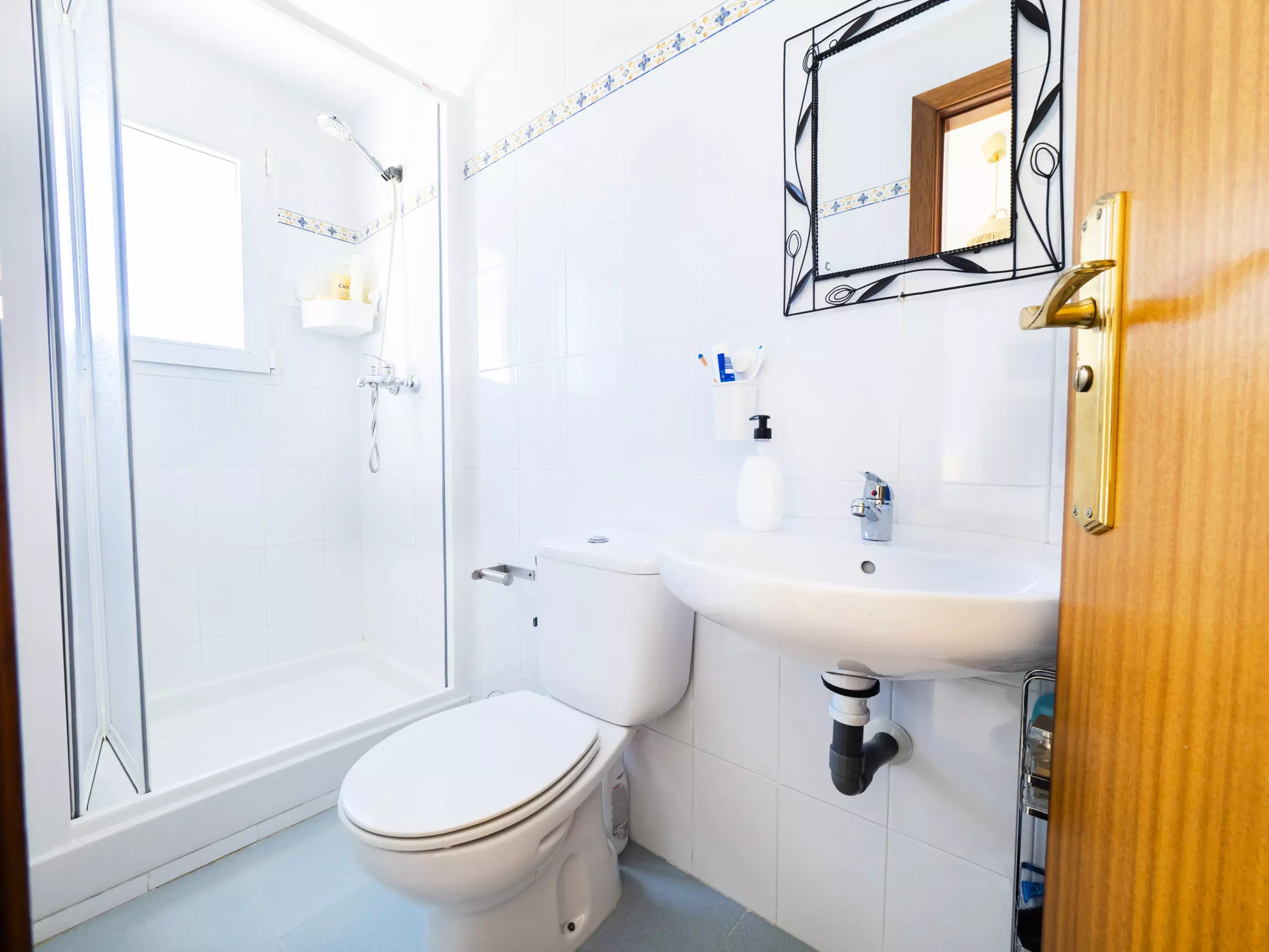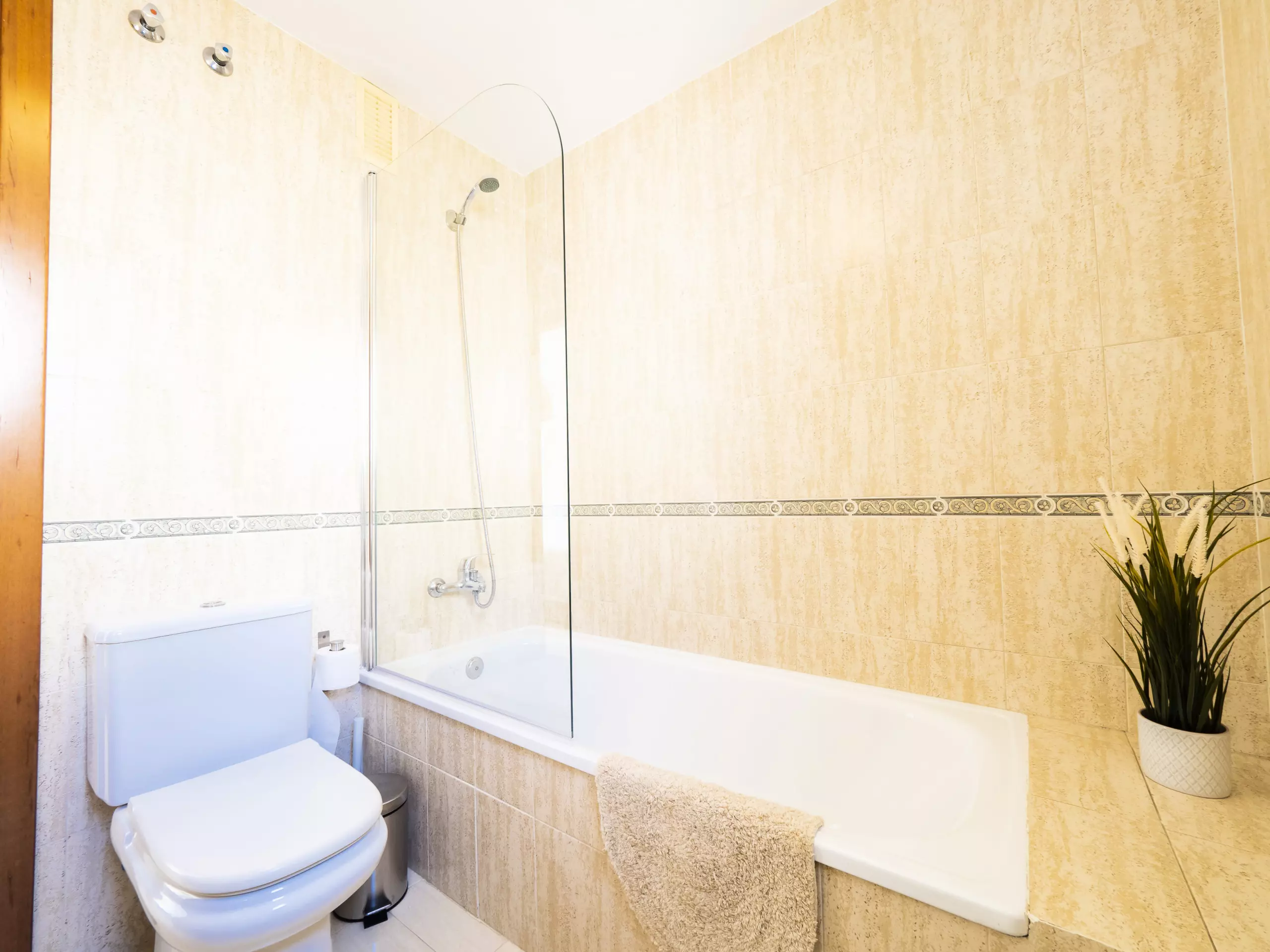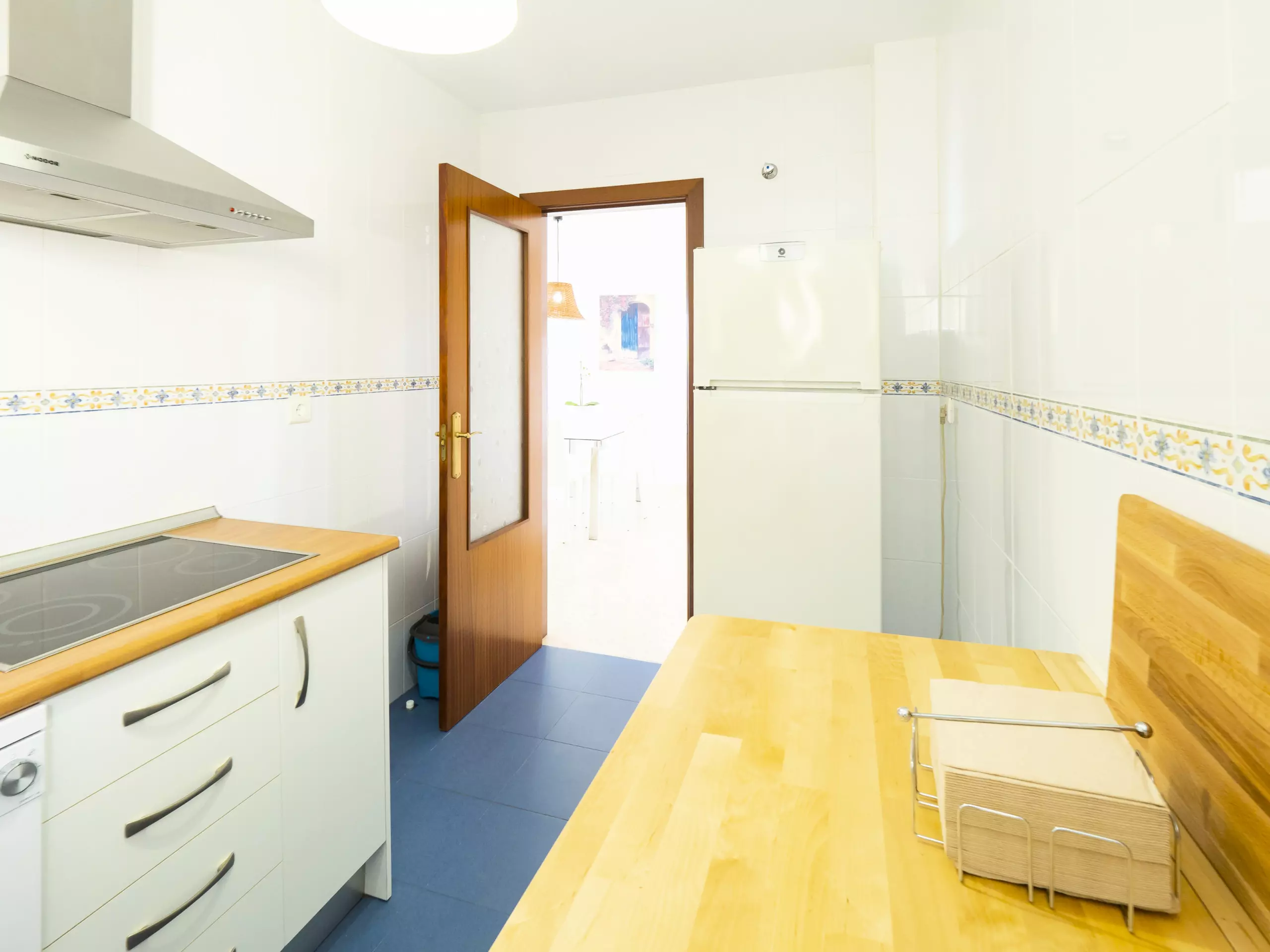 L'appartement dispose de trois chambres, toutes avec des lits doubles et des armoires pour ranger vos bagages. L'une d'entre elles a un accès direct à la terrasse et une salle de bain attenante avec une douche, idéale pour le confort et la confidentialité des familles avec enfants. De plus, il y a une salle de bain complète supplémentaire avec baignoire, située dans le couloir qui relie les chambres. ??