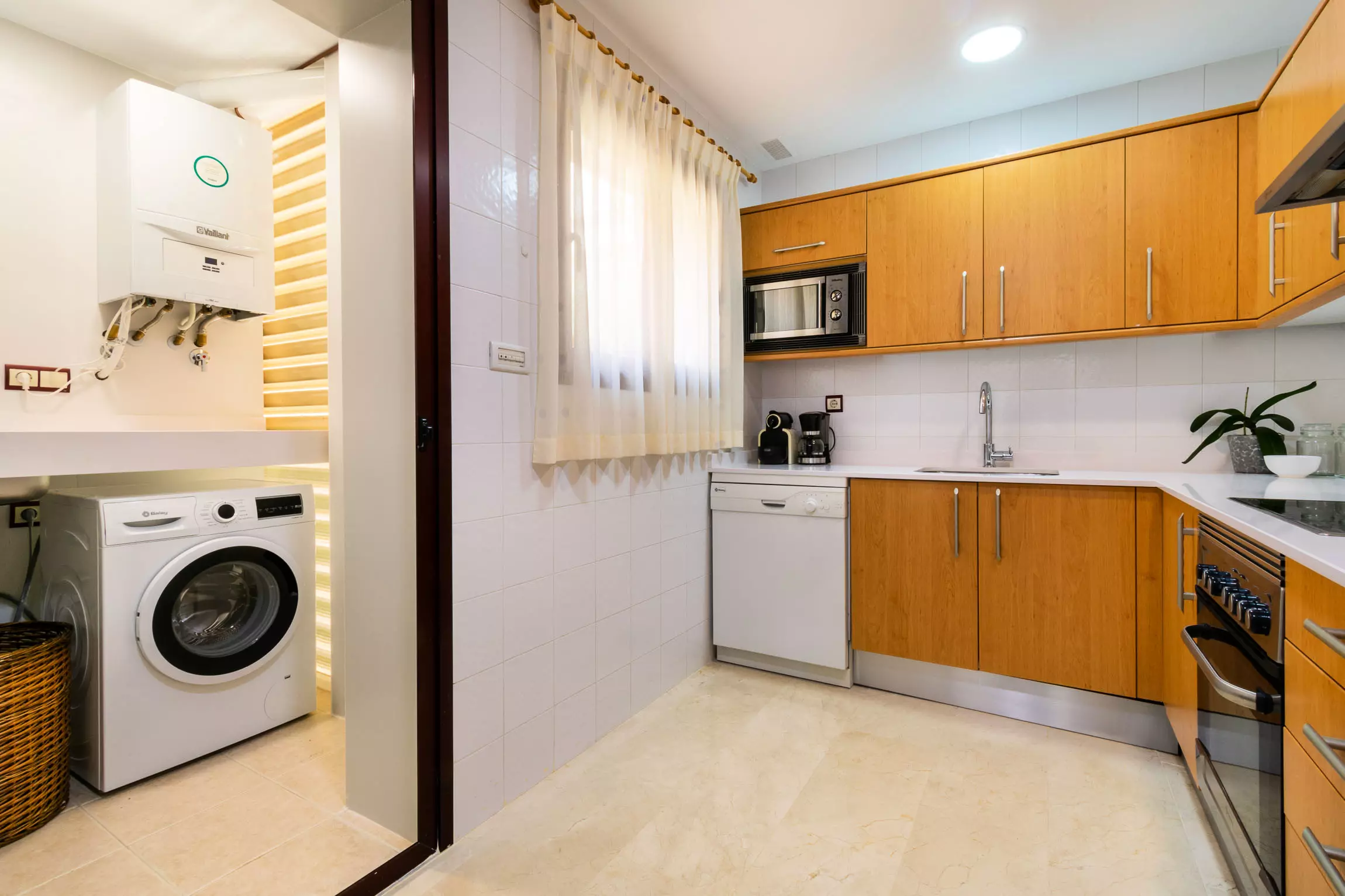 La cuisine indépendante, à vitrocéramique, est équipée avec réfrigérateur, micro-ondes, four, congélateur, lave-vaisselle, vaisselle/couverts, ustensiles/cuisine, cafetière, grille pain, bouilloire et presse-agrumes.