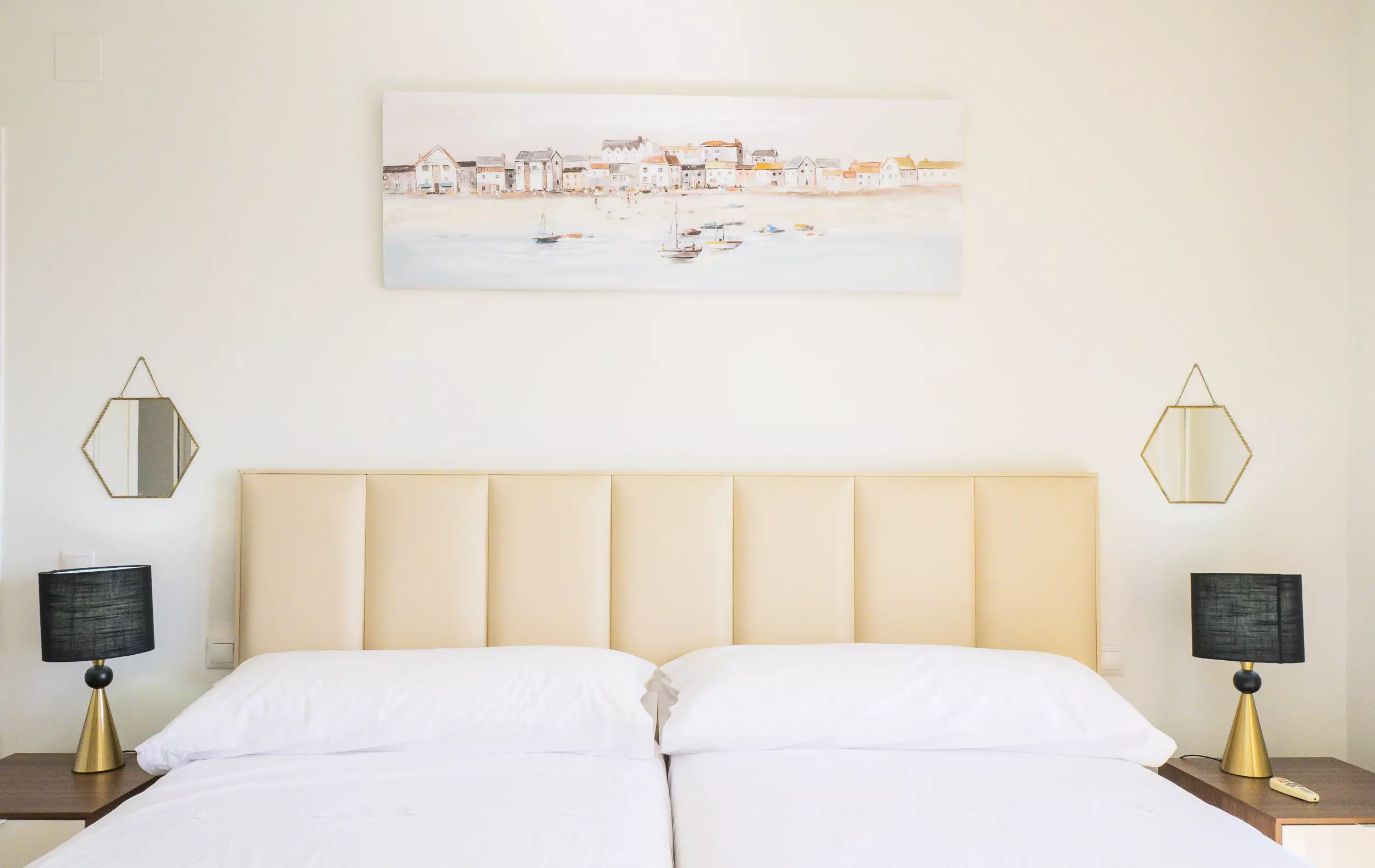 La chambre principale avec deux lits simples de 1,05 m et une salle de bain attenante.