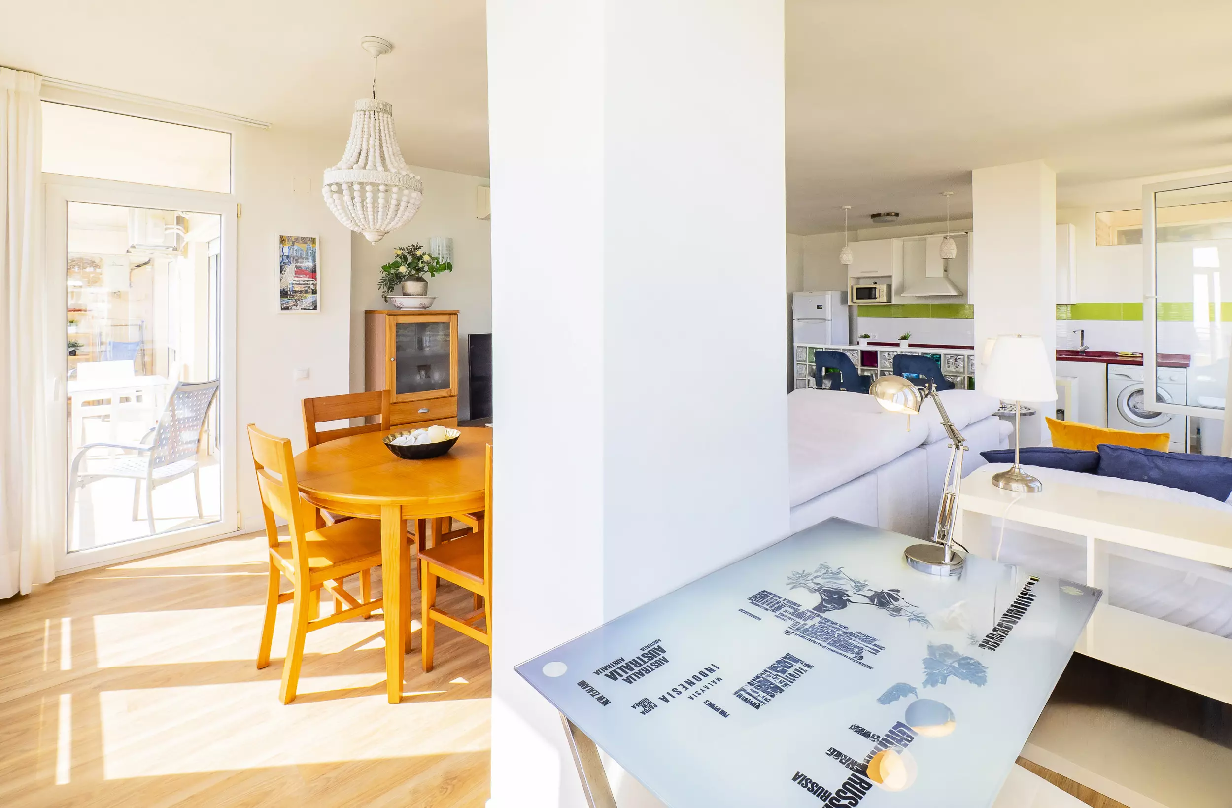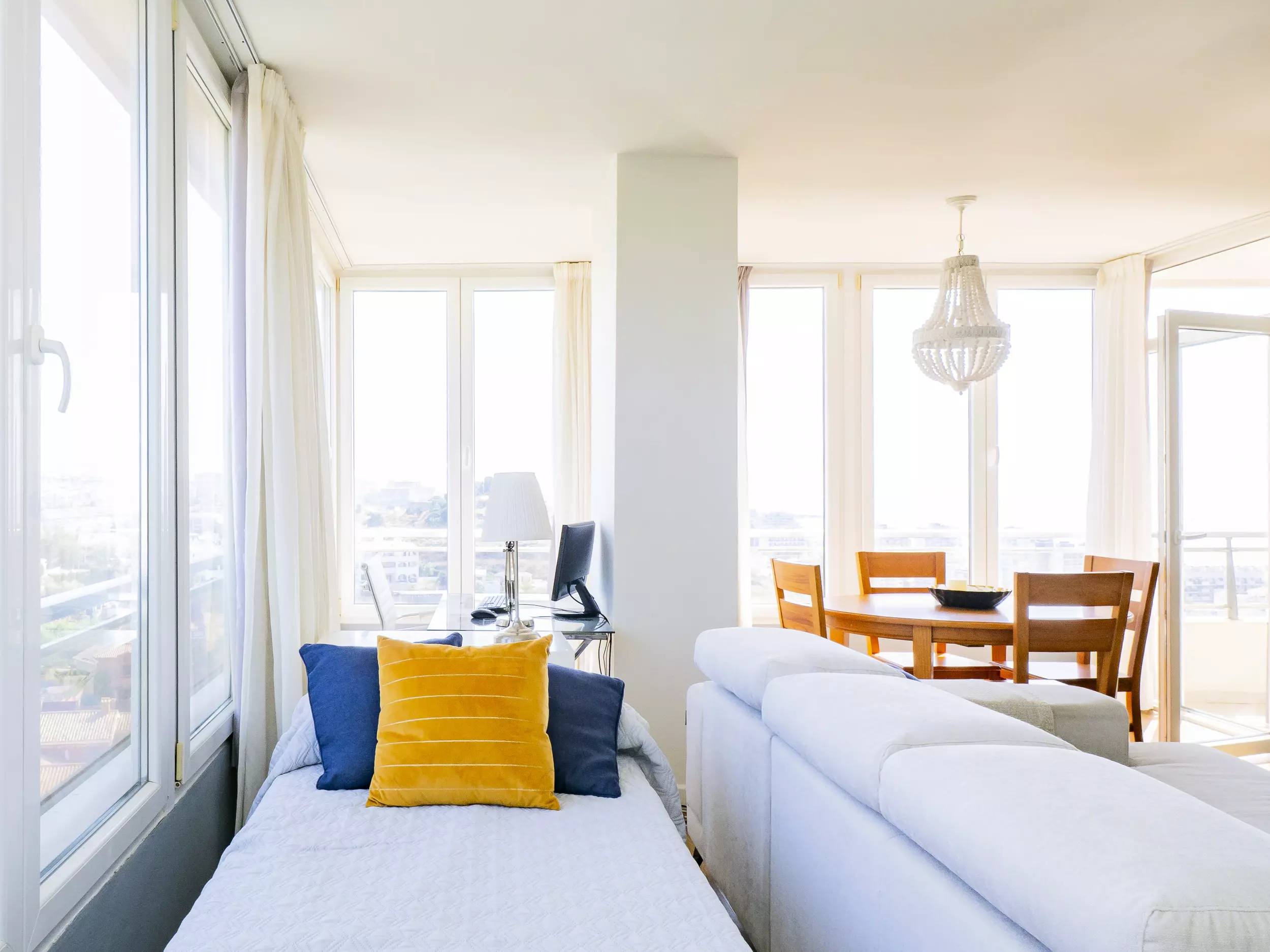 ? Le salon-salle à manger, avec double vitrage, garantit le silence et le confort thermique, et intègre une cuisine entièrement équipée, une zone de télévision, une table de salle à manger et un espace supplémentaire avec un lit individuel et un bureau, idéal pour le télétravail avec votre ordinateur portable.