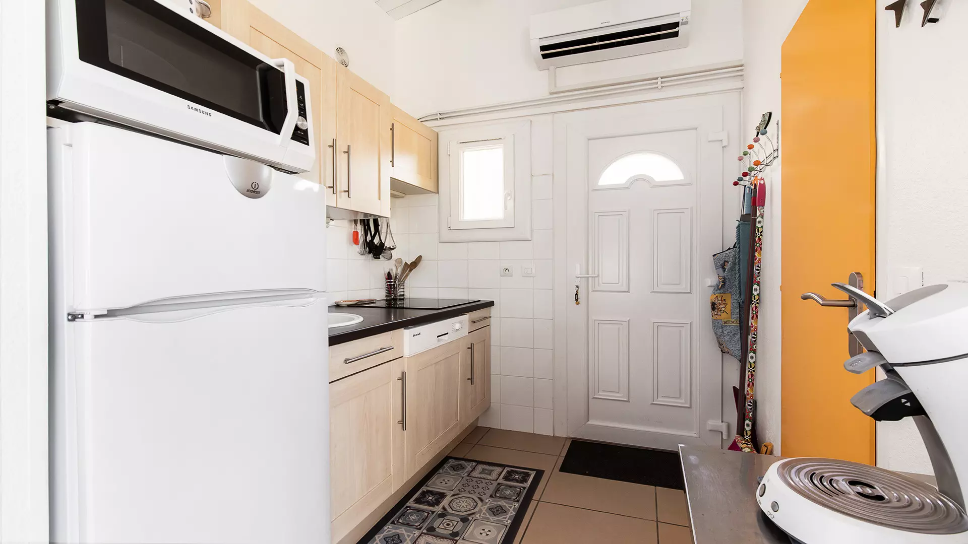 - Coin cuisine équipée d'un micro-ondes, un lave-vaisselle, un four électrique, une cafetière, une bouilloire et un lave-linge.