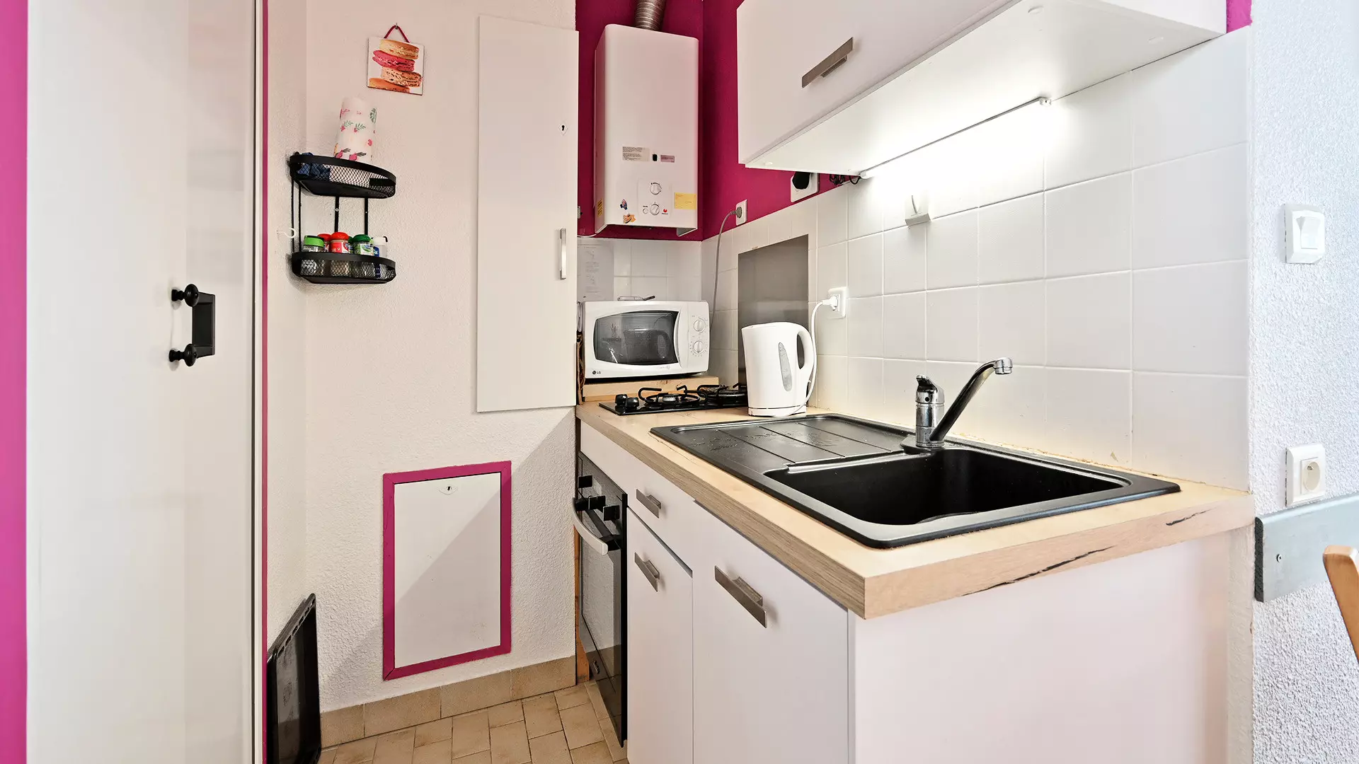 - Kitchenette équipée : réfrigérateur, four, micro-ondes, bouilloire, couverts, cafetière, ustensiles de cuisine et lave-linge.