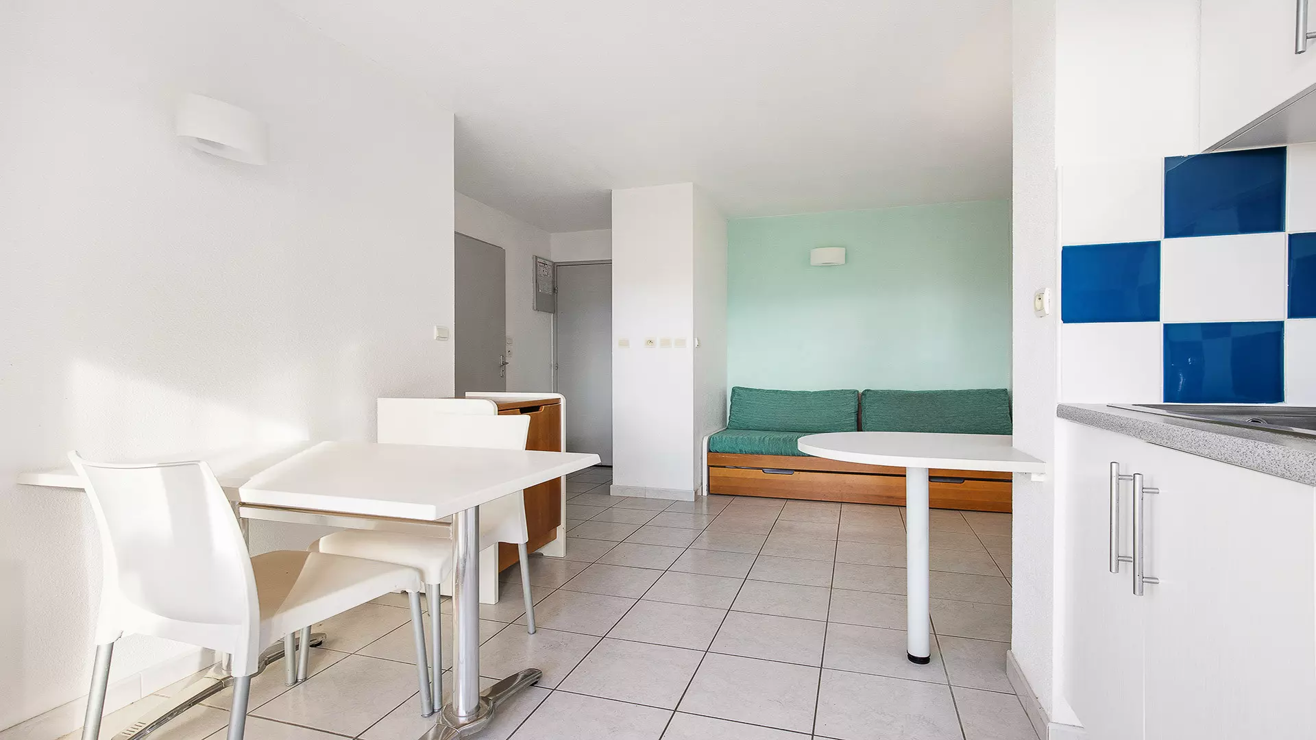 - Séjour lumineux avec canapé-lit gigogne (2x1 pers, 80x190) TV et une table à manger ;