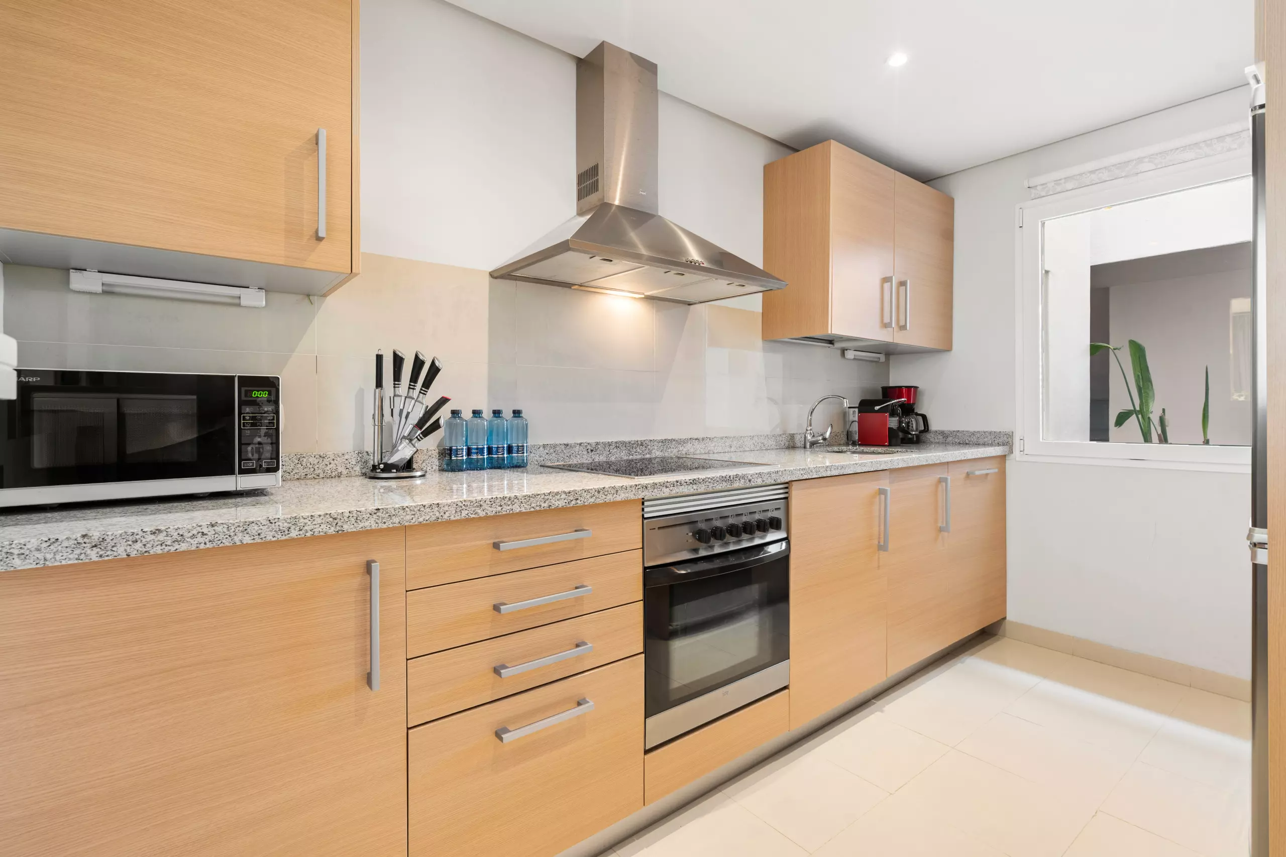 La cuisine indépendante, à induction, est équipée avec réfrigérateur, micro-ondes, four, congélateur, lave-vaisselle, vaisselle/couverts, ustensiles/cuisine, cafetière, grille pain et bouilloire.
