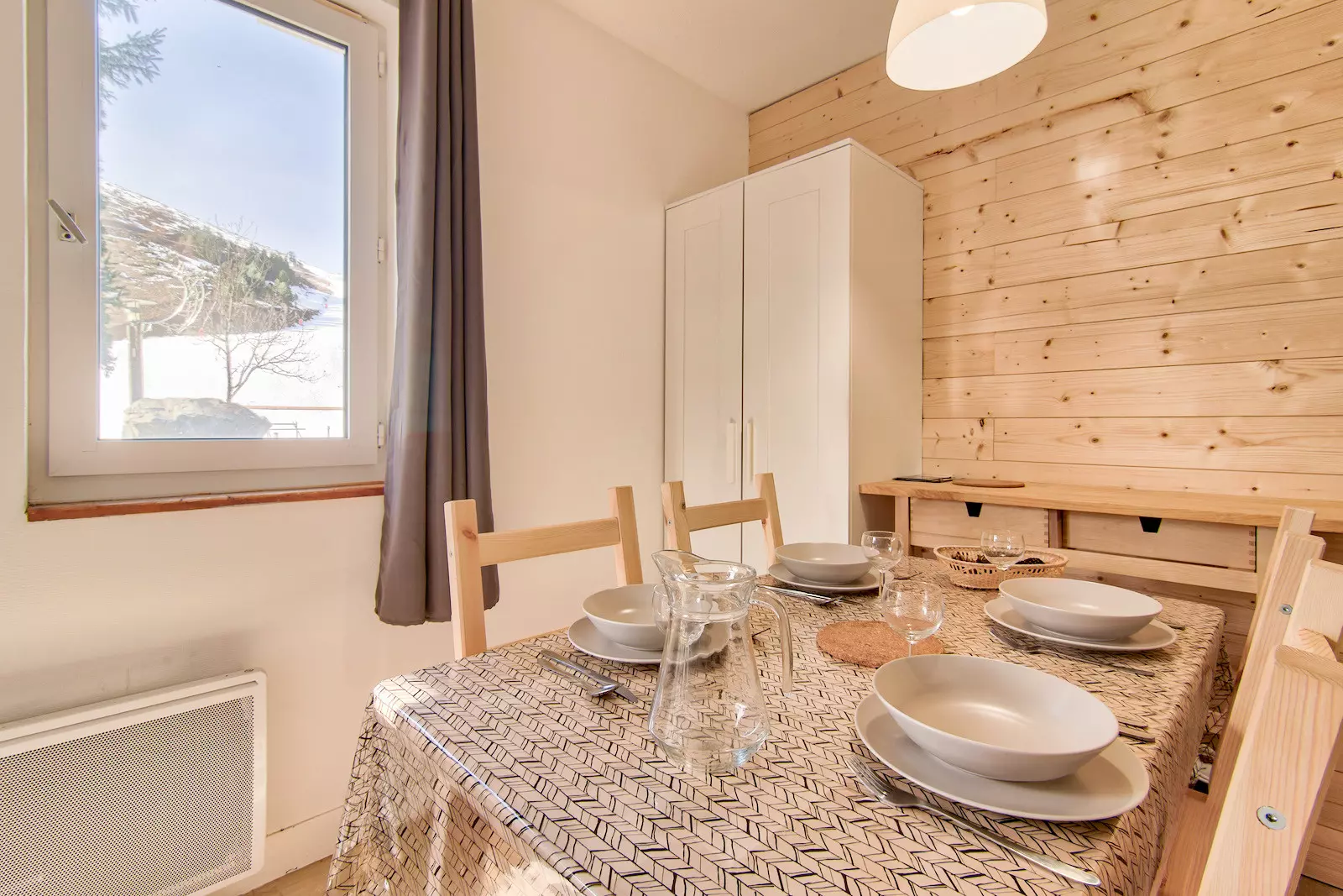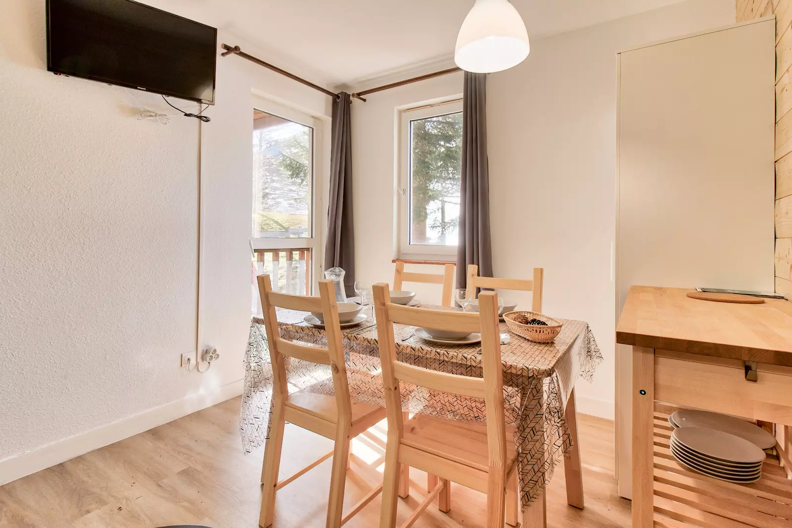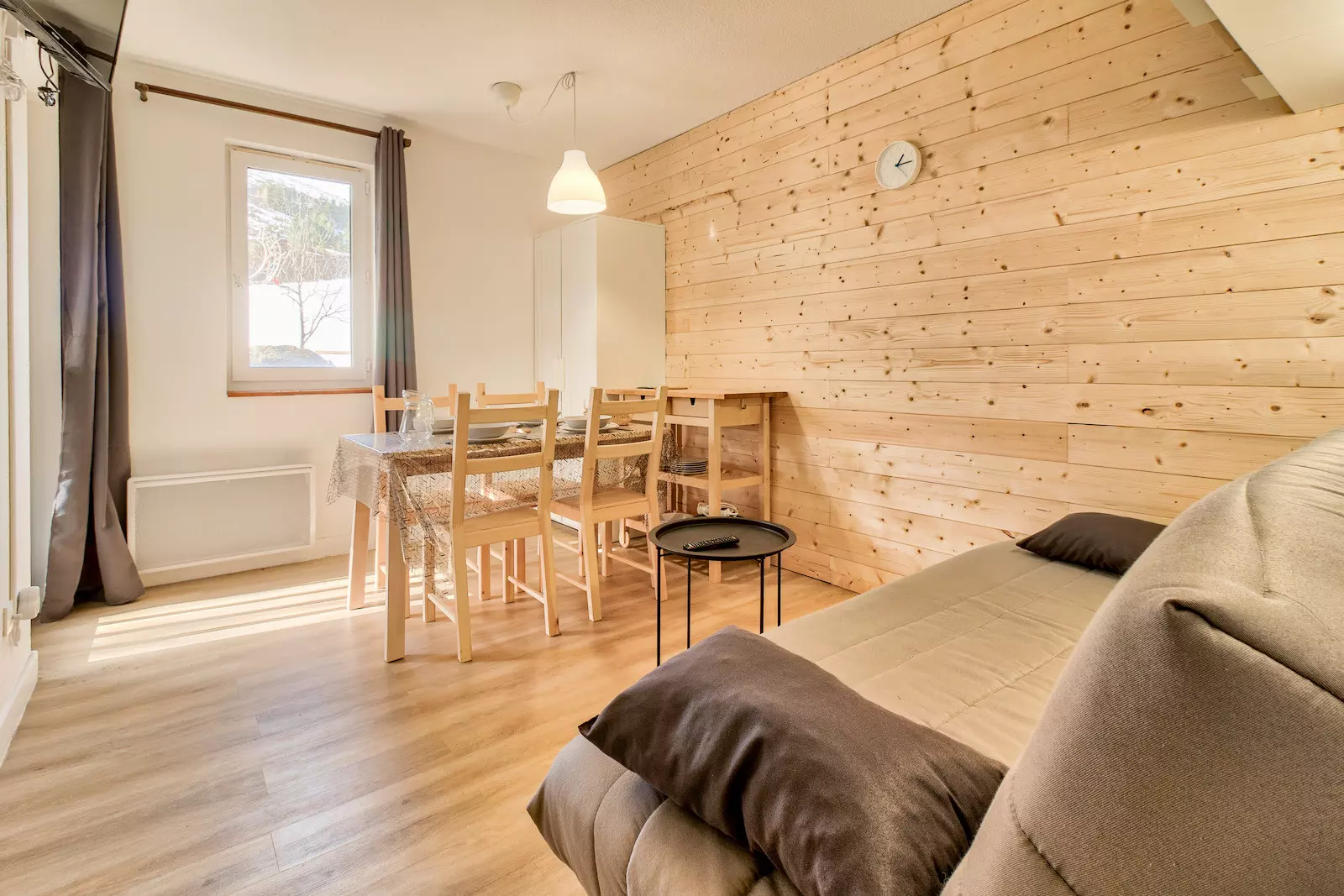 Cet appartement pour 4 accueillant et lumineux de 24 m² dans la résidence des Gourgs blancs, dispose d'une cuisine américaine équipée d'un four et de plaques à induction, d'un réfrigérateur et d'une cafetière. Elle s'ouvre sur un séjour avec son coin repas, et son salon, avec notamment un canapé lit offrant un couchage pour 2.