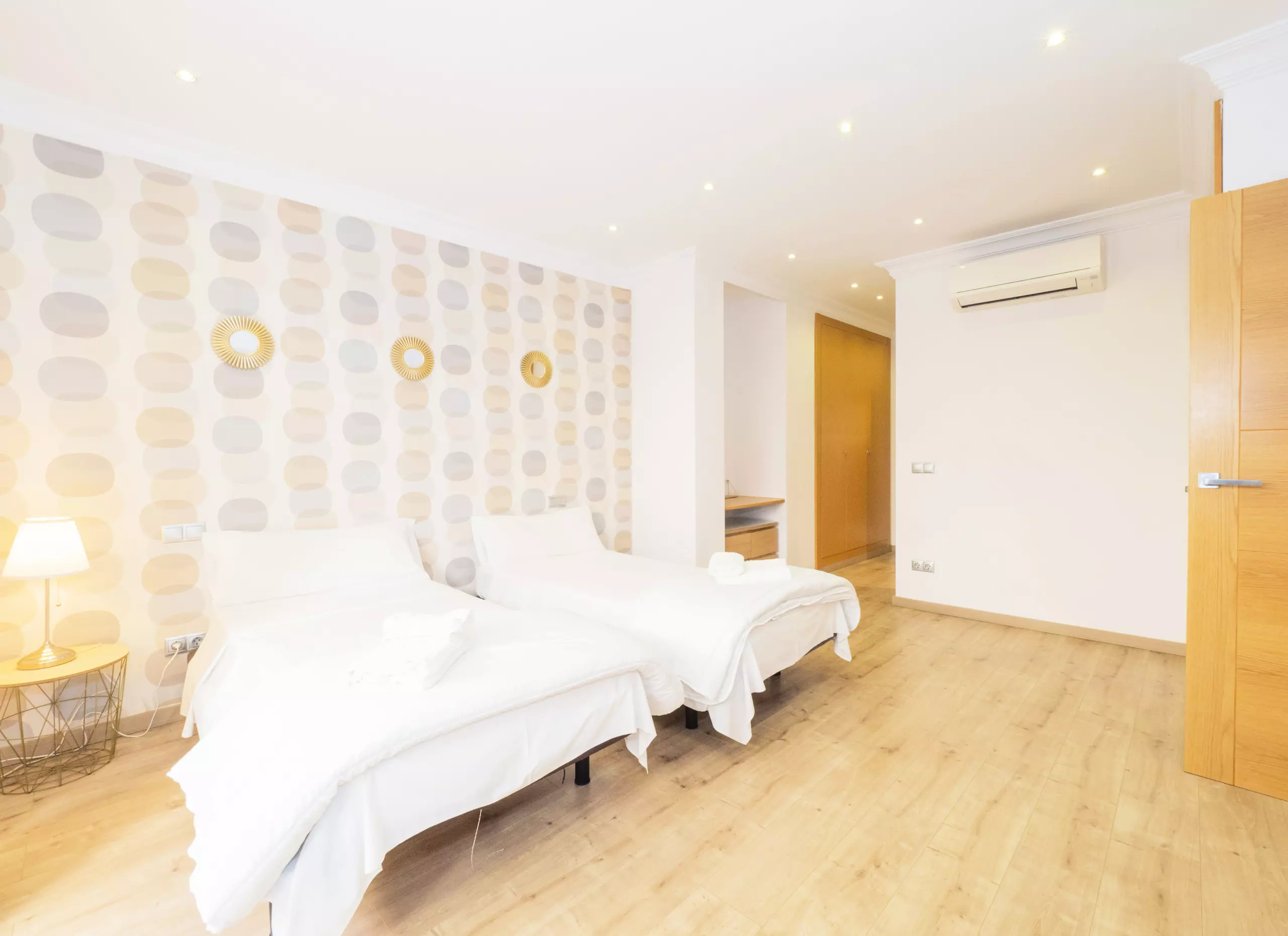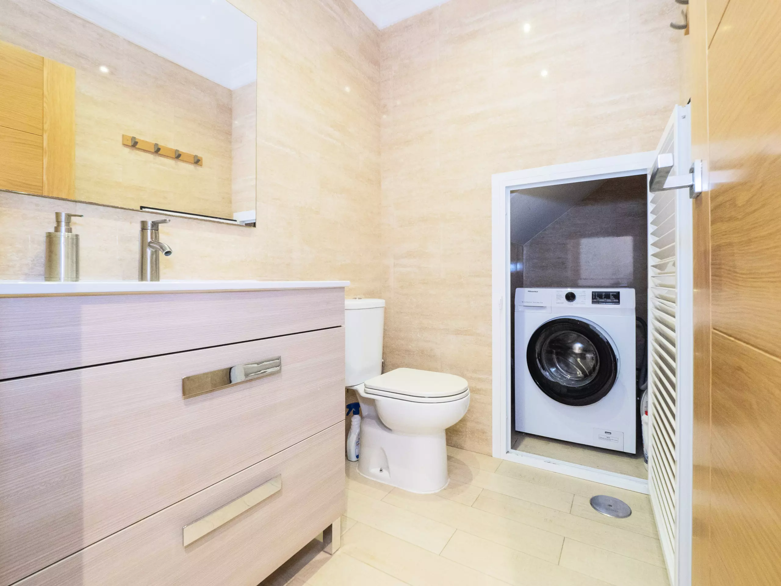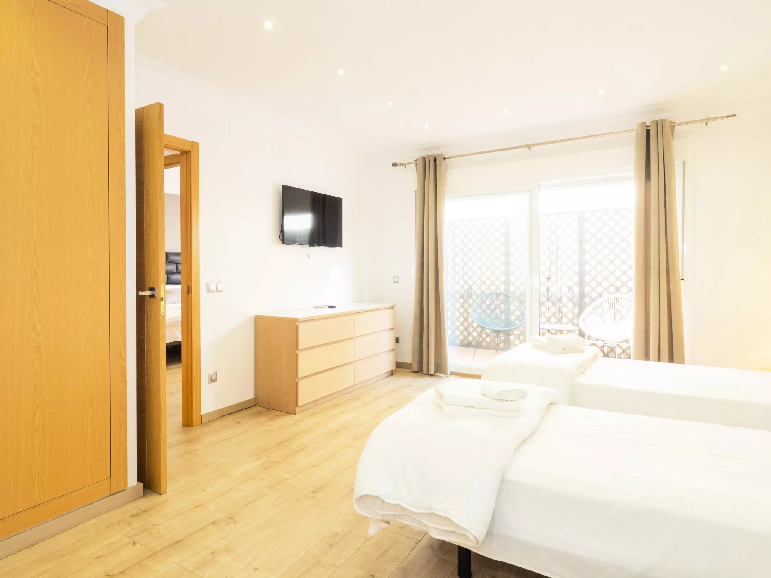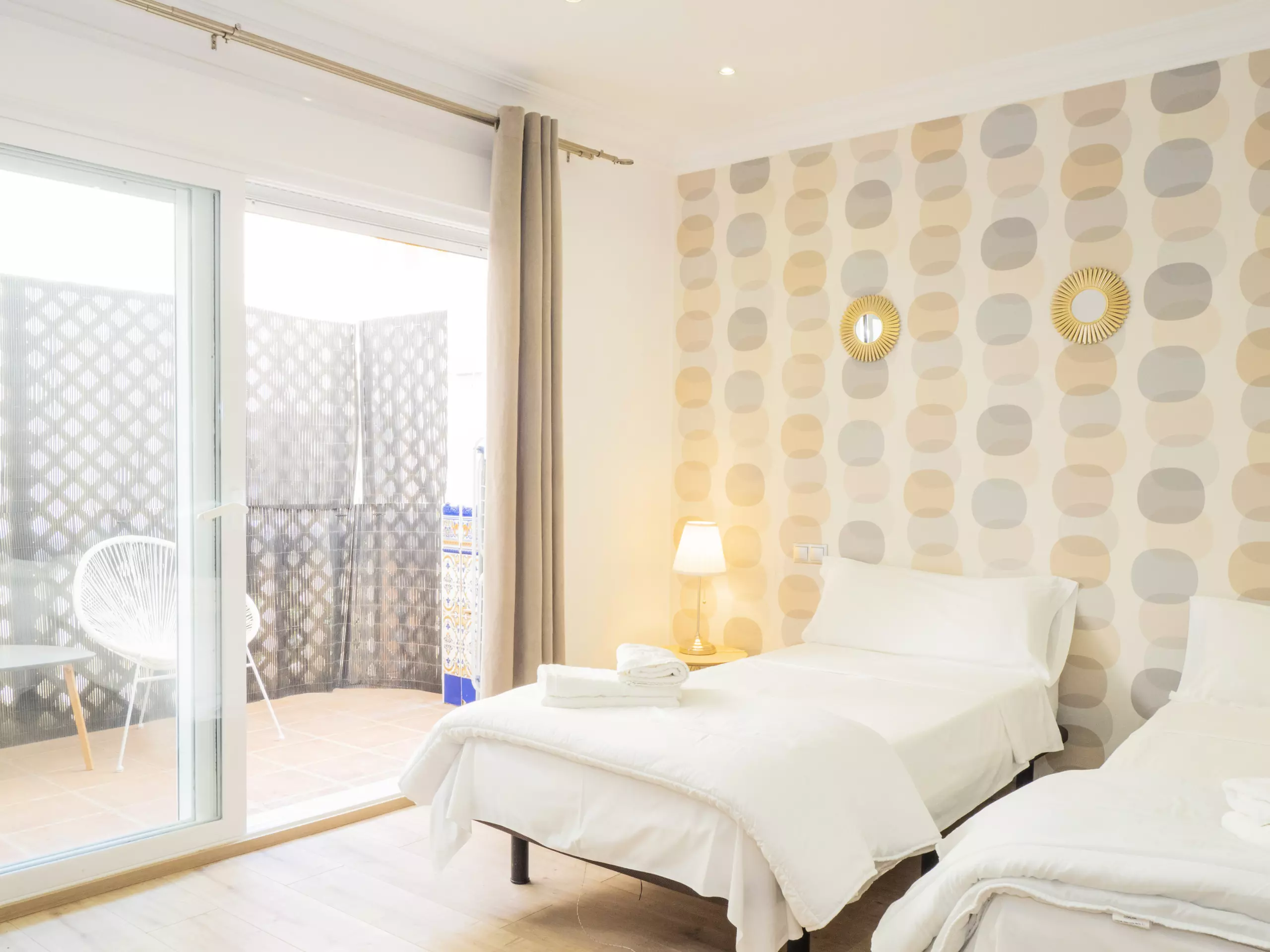 Un couloir relie le salon aux chambres et une salle de bain complète avec machine à laver pour votre commodité. L'appartement dispose de deux chambres spacieuses avec salle de bain privative : une avec un lit Queen Size et une baignoire, et l'autre avec deux lits individuels et une douche. La chambre avec lits individuels dispose d'une terrasse parfaite pour se détendre en lisant ou en prenant un thé ??.
