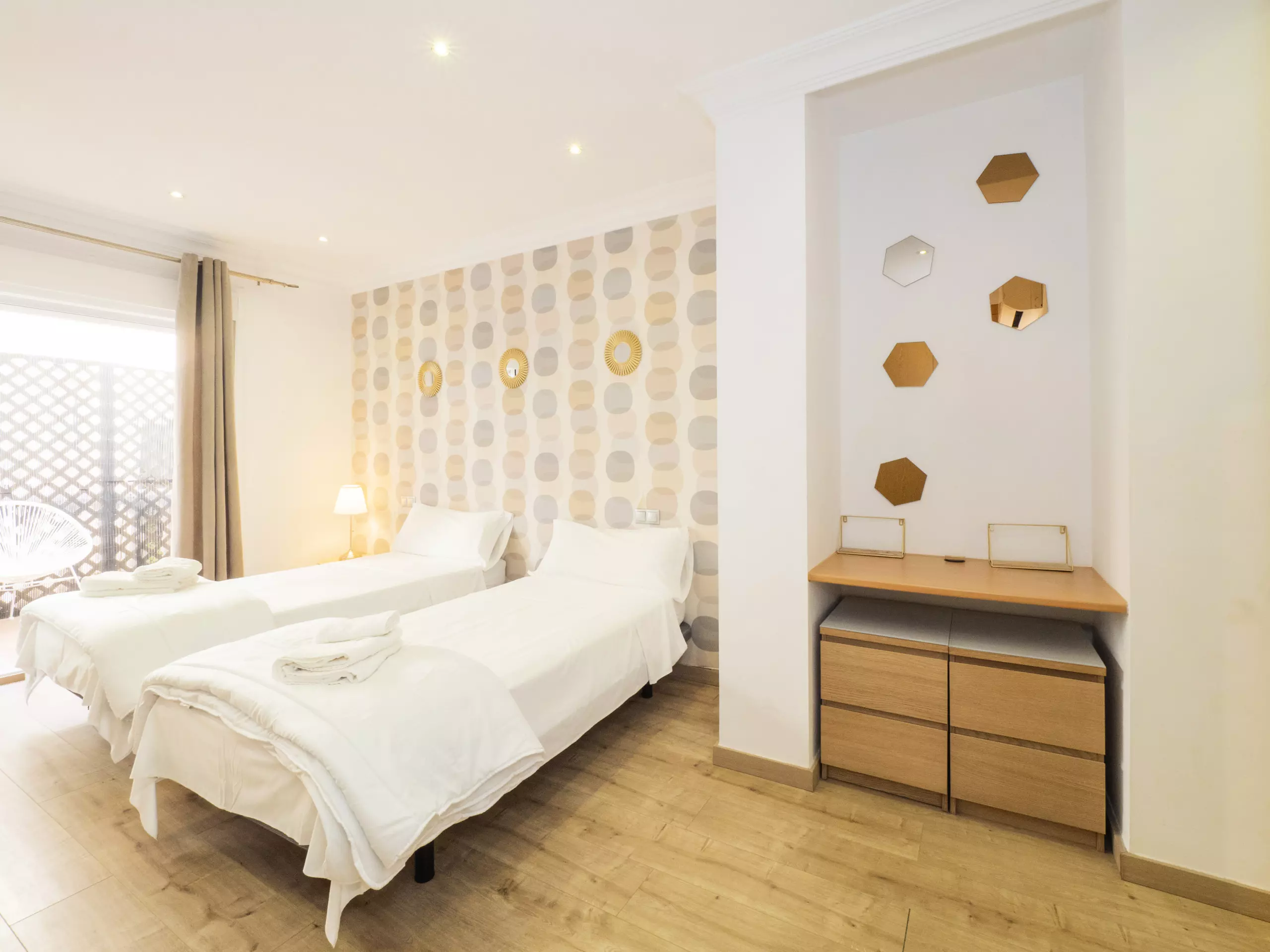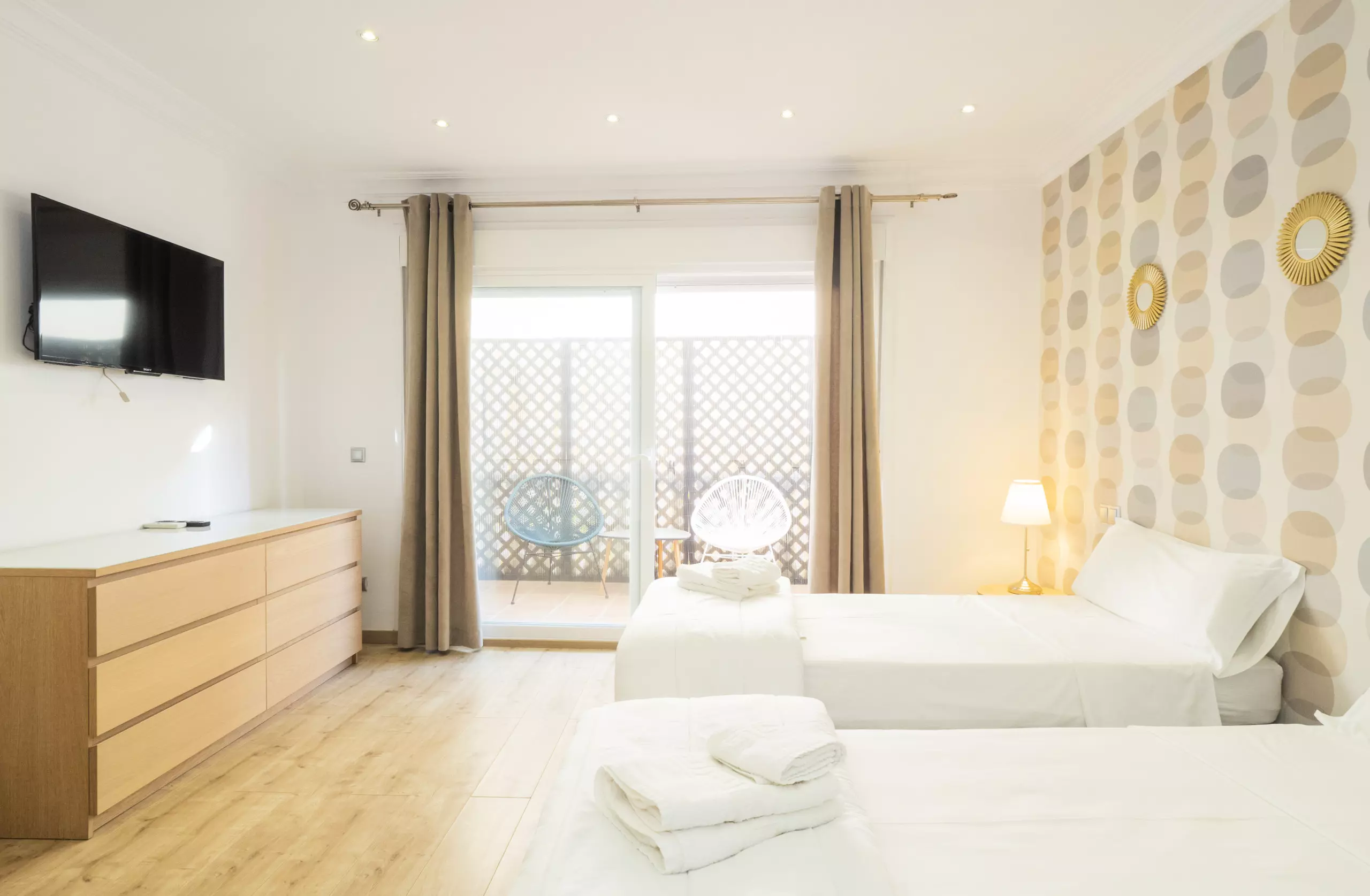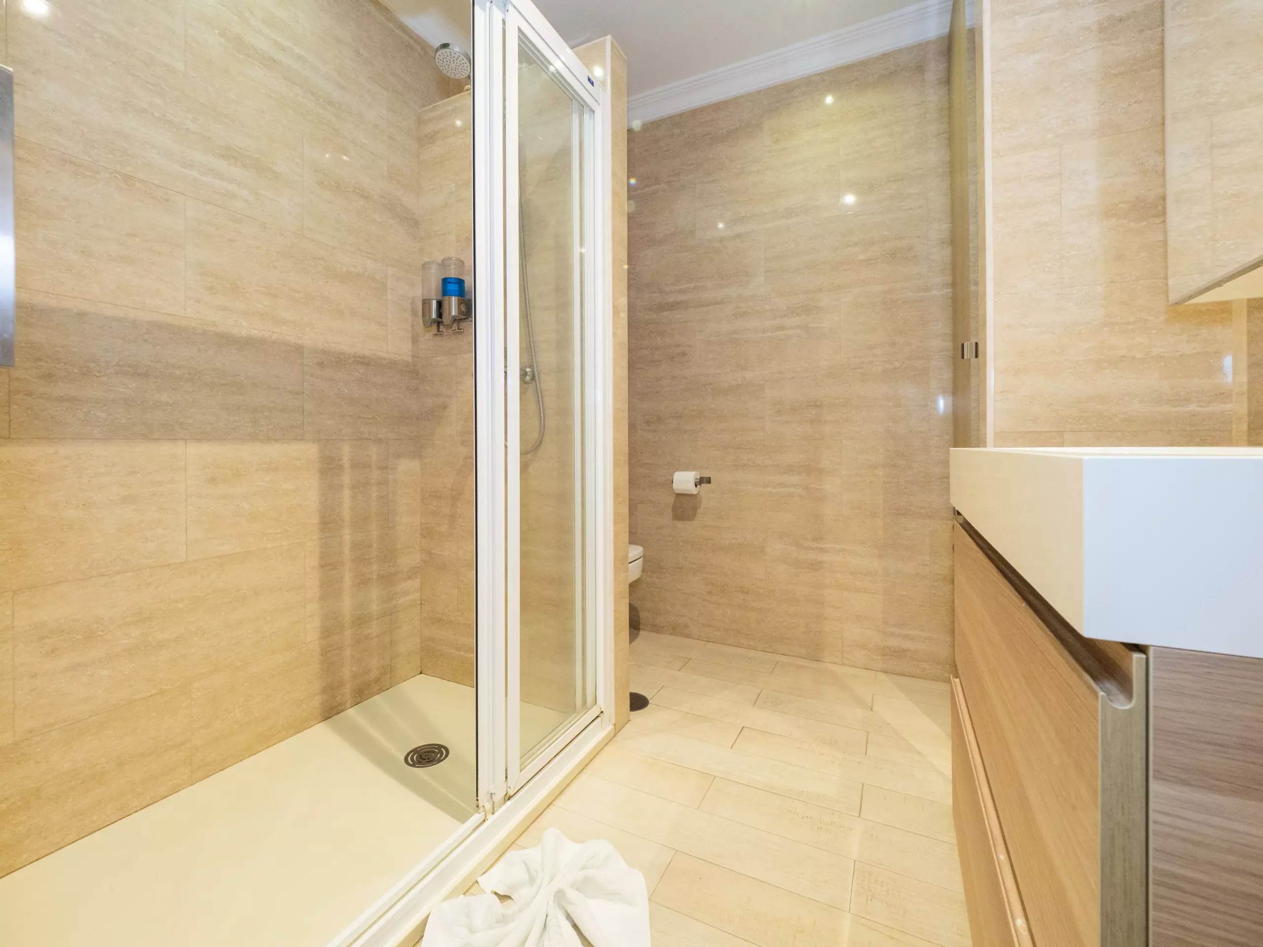 Un couloir relie le salon aux chambres et une salle de bain complète avec machine à laver pour votre commodité. L'appartement dispose de deux chambres spacieuses avec salle de bain privative : une avec un lit Queen Size et une baignoire, et l'autre avec deux lits individuels et une douche. La chambre avec lits individuels dispose d'une terrasse parfaite pour se détendre en lisant ou en prenant un thé ??.