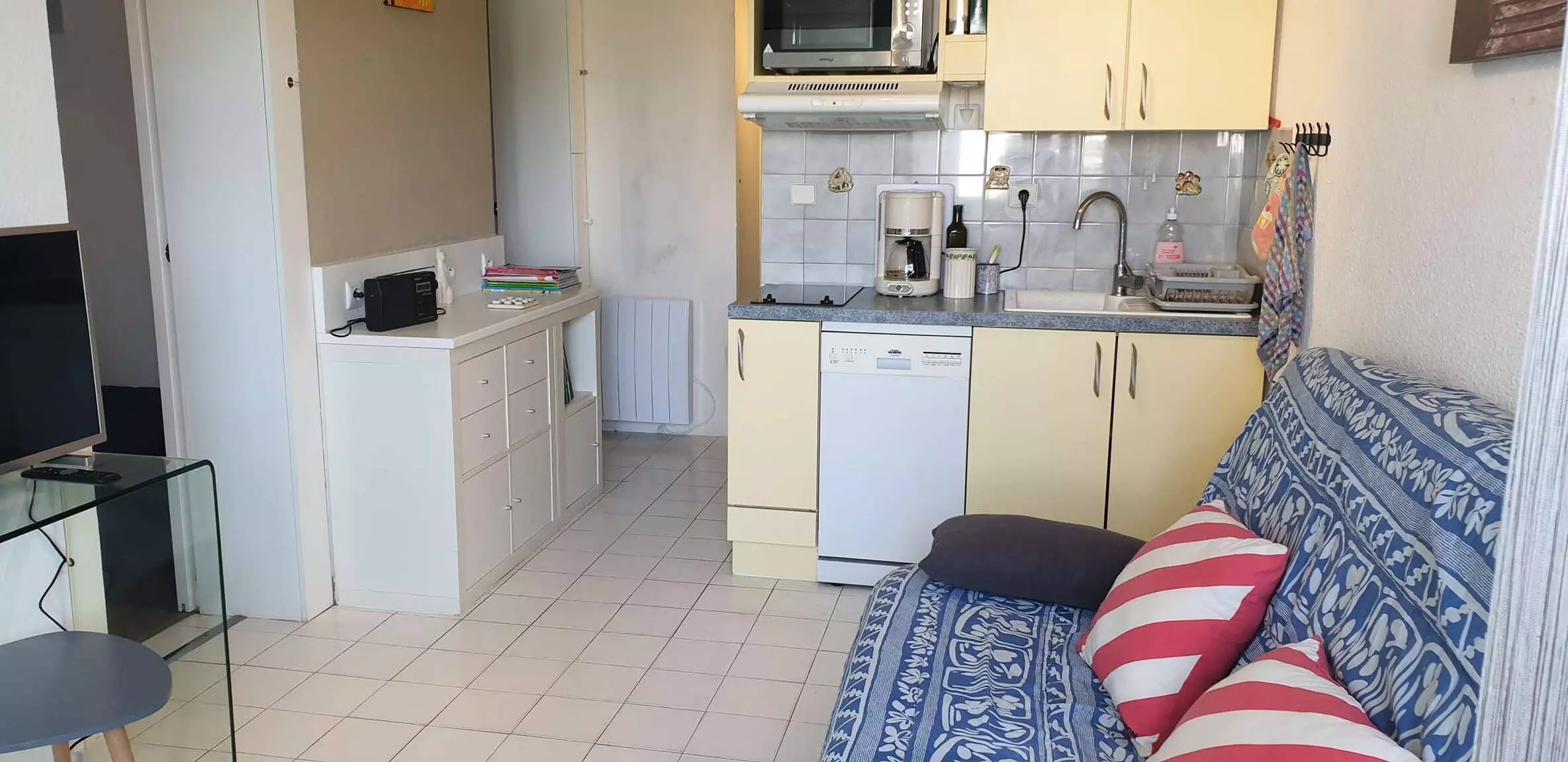 Le Groupe Neptune Immobilier vous propose en location vacances cet appartement 2 pièces cabine au premier étage d'une résidence sécurisé, climatisé, situé quartier du couchant et à une dizaine minutes à pied de la plage. Il est composé d'une entrée, d'un wc indépendant, d'une salle d'eau avec douche, lavabo une vasque et machine à laver. D'une kitchenette comprenant un micro-ondes, un lave vaisselle, une cafetière, un grille pain, une bouilloire, frigo et congélateur. D'un séjour avec télévision. Une première chambre avec 2 lits superposés (90), une deuxième chambre cabine avec lit double (140). Pour finir une terrasse avec chaises et table pour profiter de l'extérieur. Piscine collective