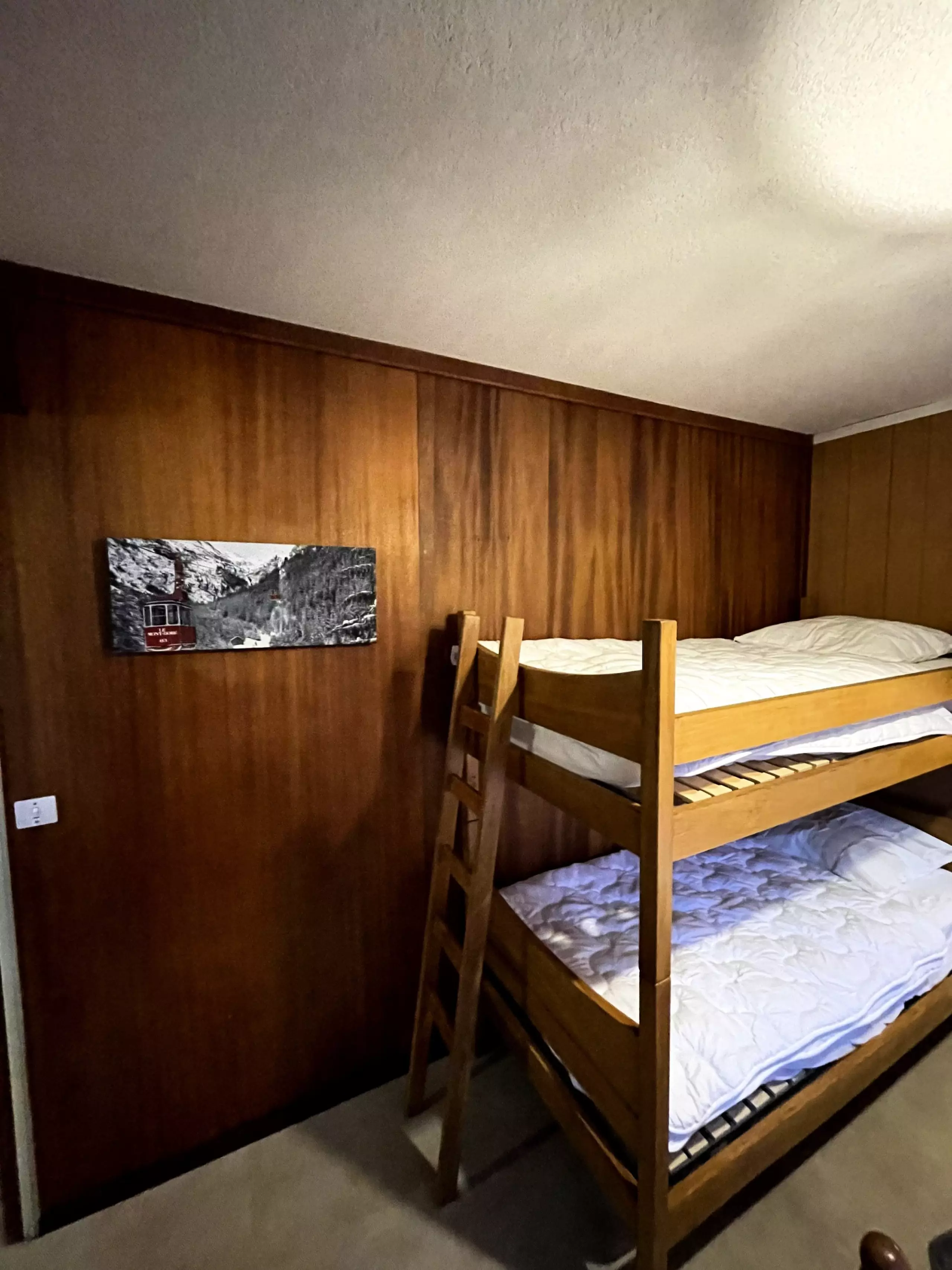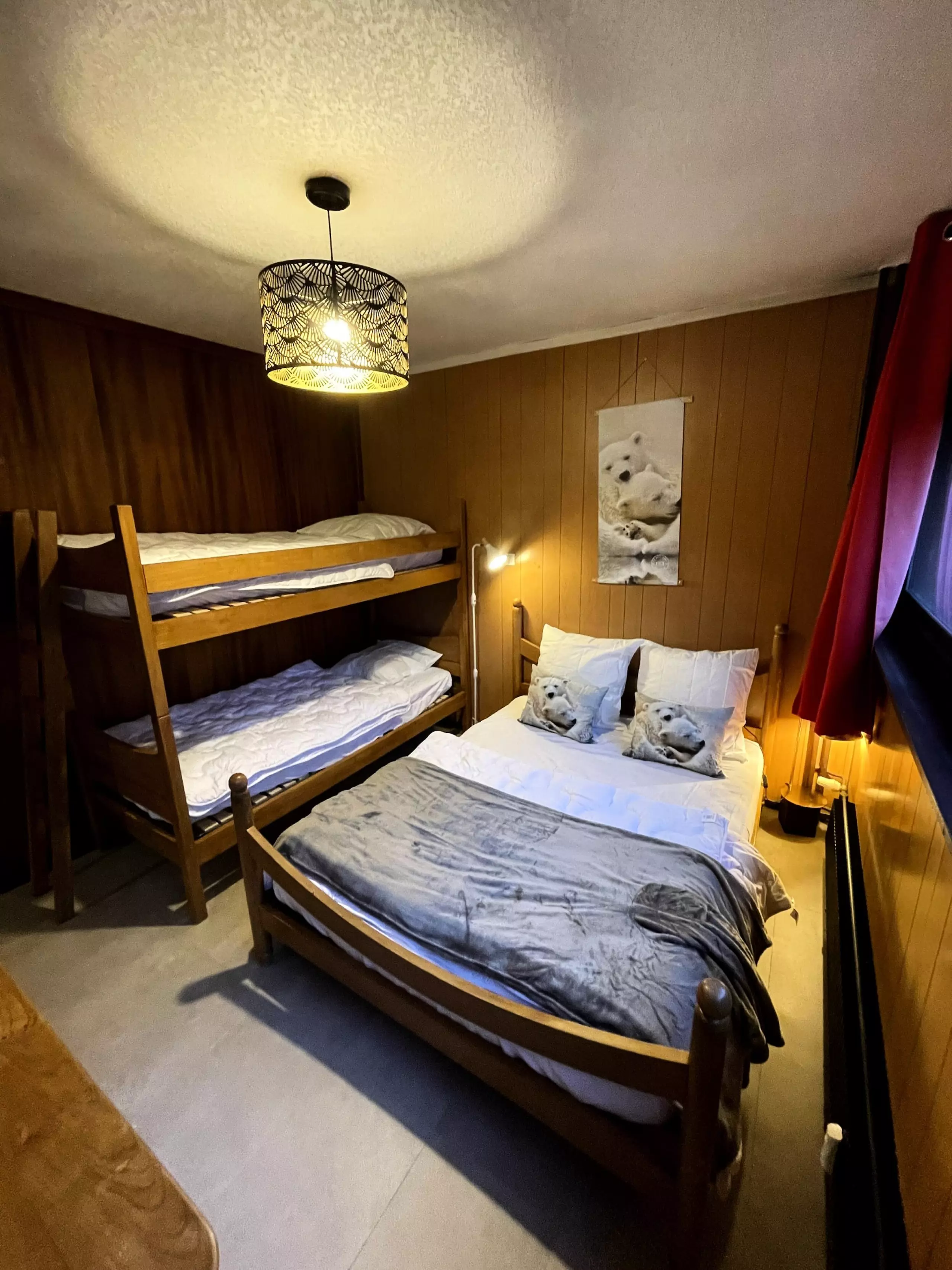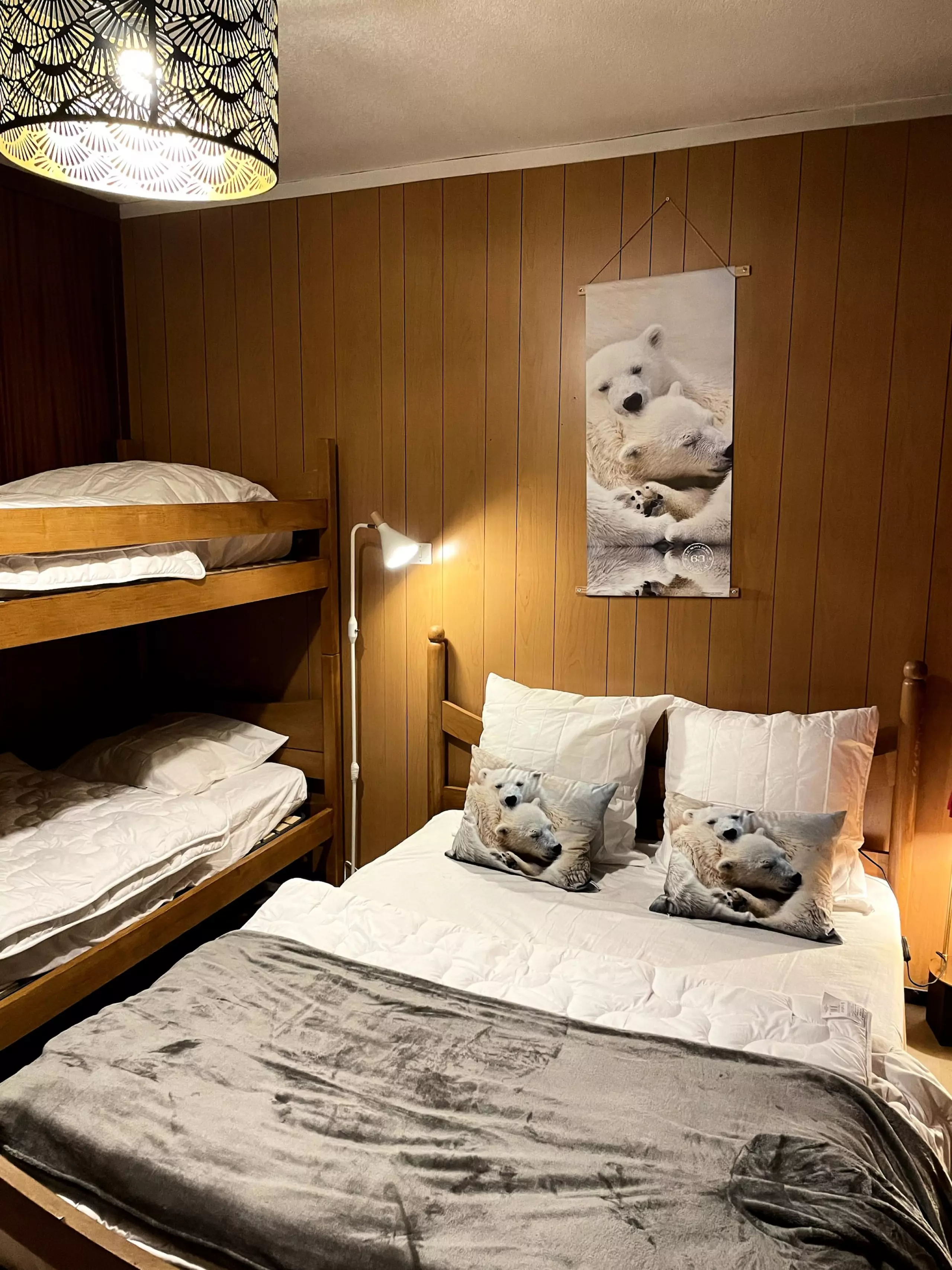 L'appartement comprend une chambre avec 1 lit double, 2 lits simples et 1 lit superposé, permettant d'accueillir jusqu'à 4 voyageurs dans une configuration adaptable et confortable.