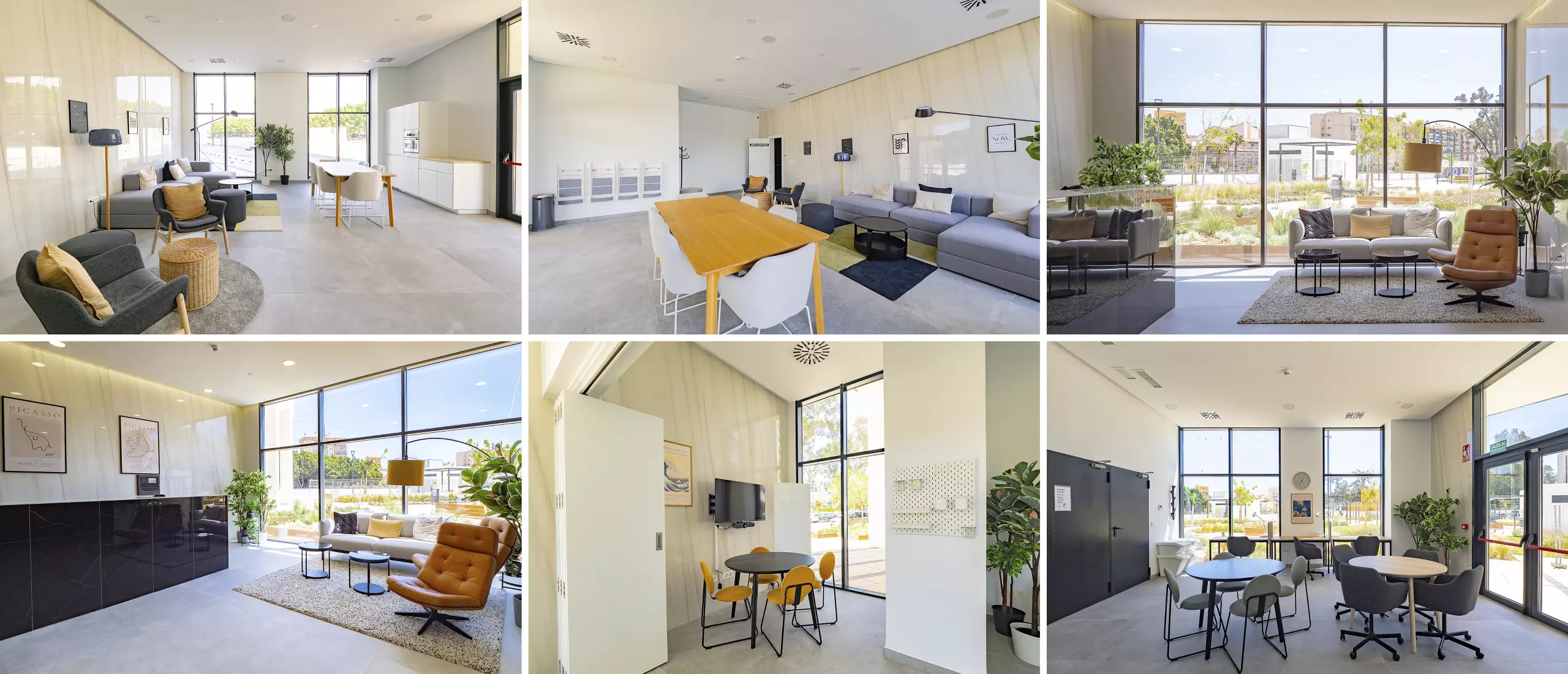 Parmi les commodités du bâtiment, les invités peuvent profiter d'une piscine communautaire sur le toit (30e étage) avec des chaises longues et une vue panoramique, bien que cette piscine restera fermée du 15 septembre au 31 mai. De plus, il y a des espaces multifonctionnels au rez-de-chaussée qui comprennent une salle de projection, un espace de coworking, une salle de sport et une zone pour enfants avec des jeux, tout accessible via une application innovante et soumis à réservation et à une capacité limitée.