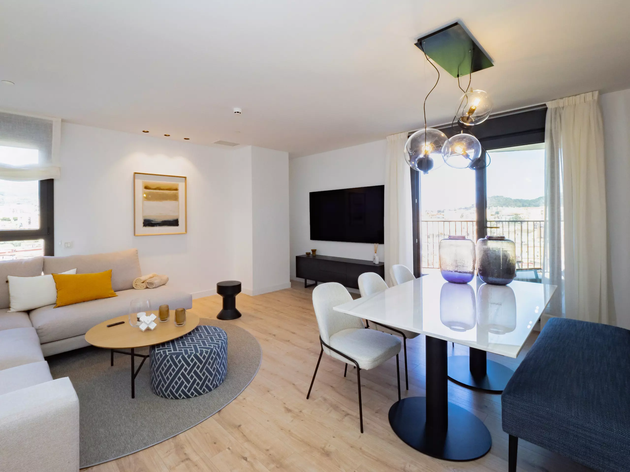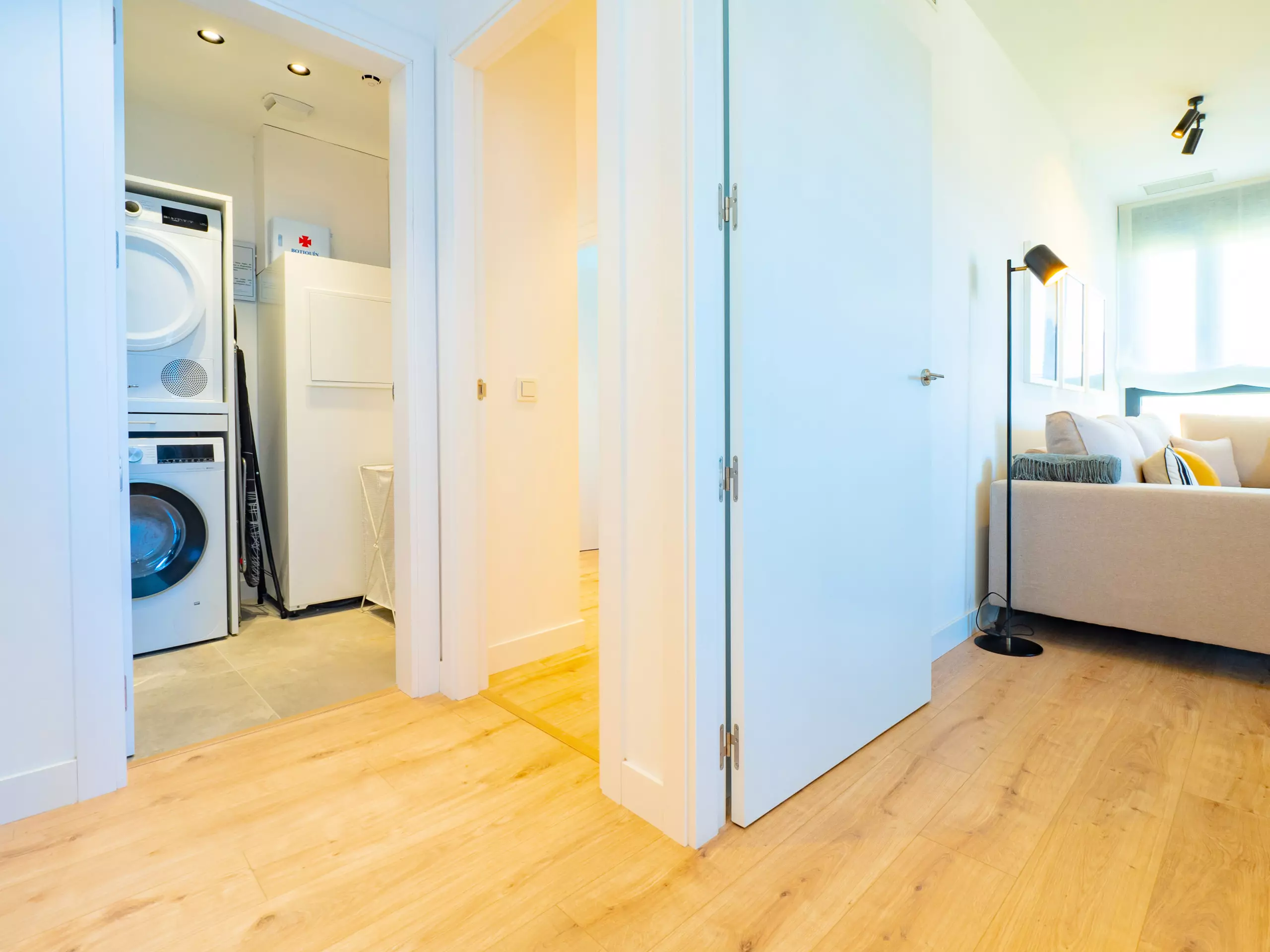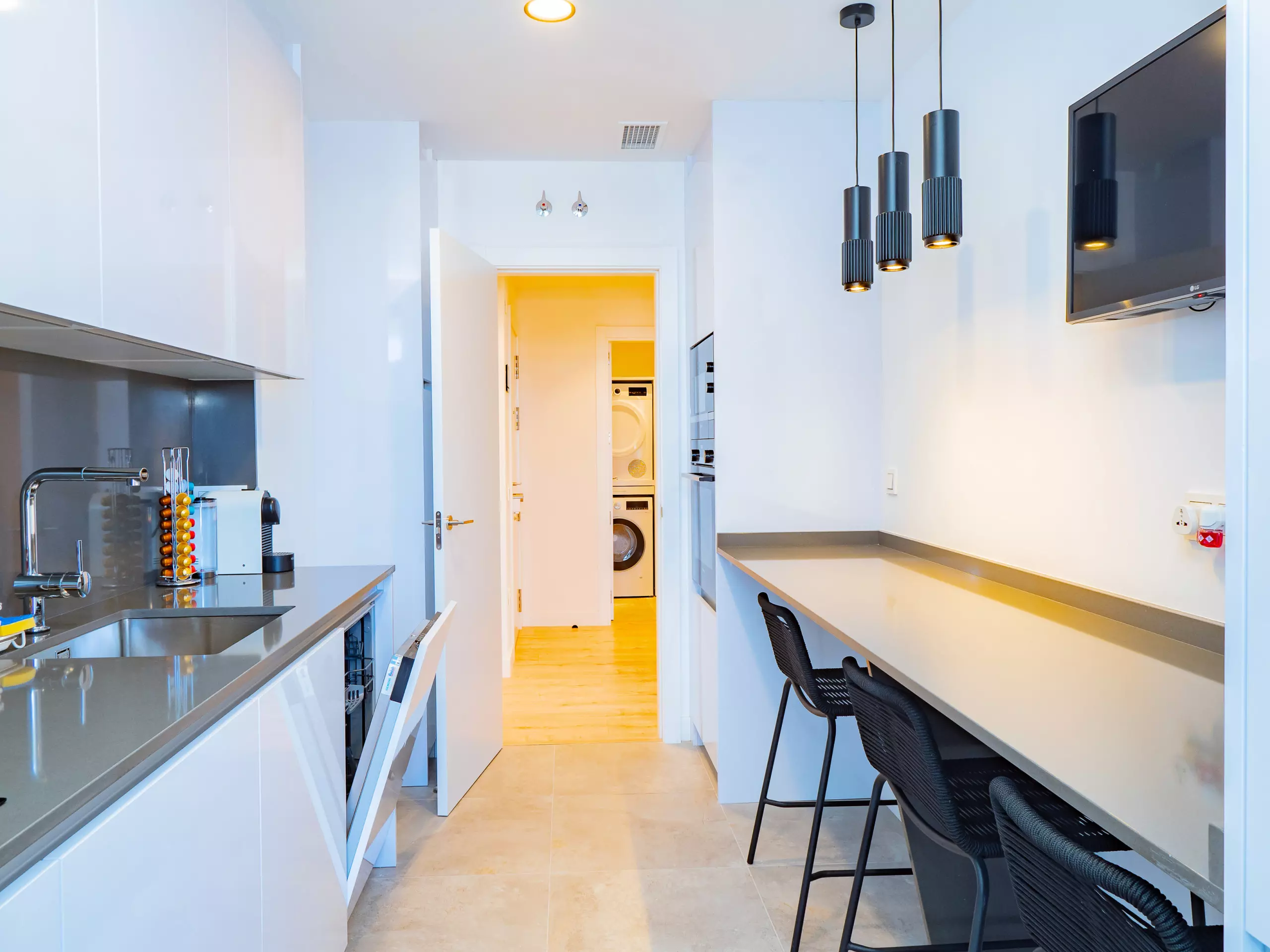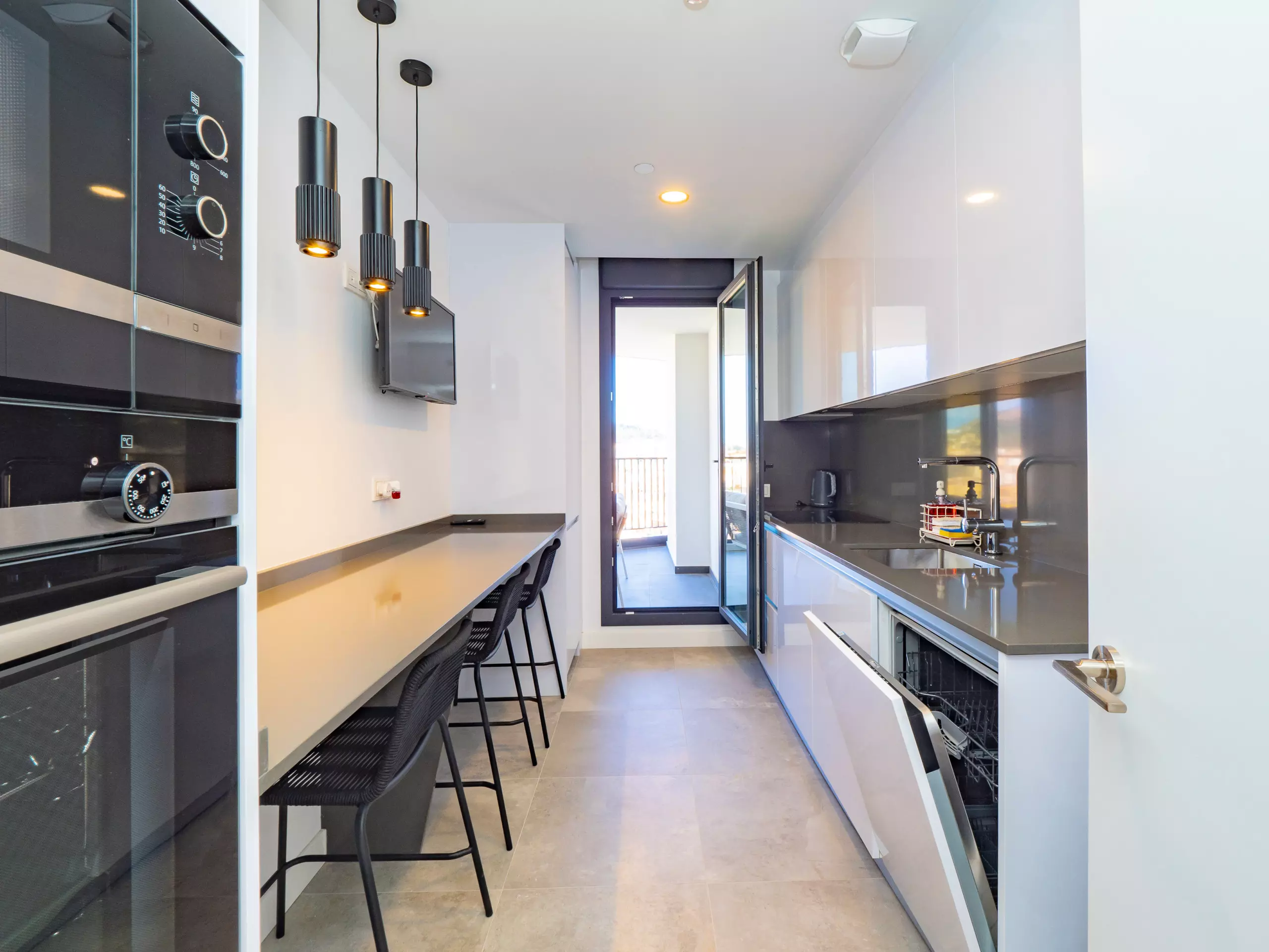 L'appartement dispose d'une cuisine indépendante entièrement équipée avec des appareils électroménagers modernes tels que réfrigérateur, micro-ondes, four, lave-vaisselle, cafetière et plus encore, parfaite pour préparer vos plats préférés. Le salon-salle à manger est spacieux et lumineux, équipé d'une Smart TV pour le divertissement en streaming, et s'ouvre sur une terrasse de 12 m² où vous pourrez profiter du lever du soleil sur la ville. De plus, il dispose d'un lave-linge, sèche-linge, fer à repasser, chauffage central et climatisation dans tout l'espace pour votre confort pendant toute l'année.