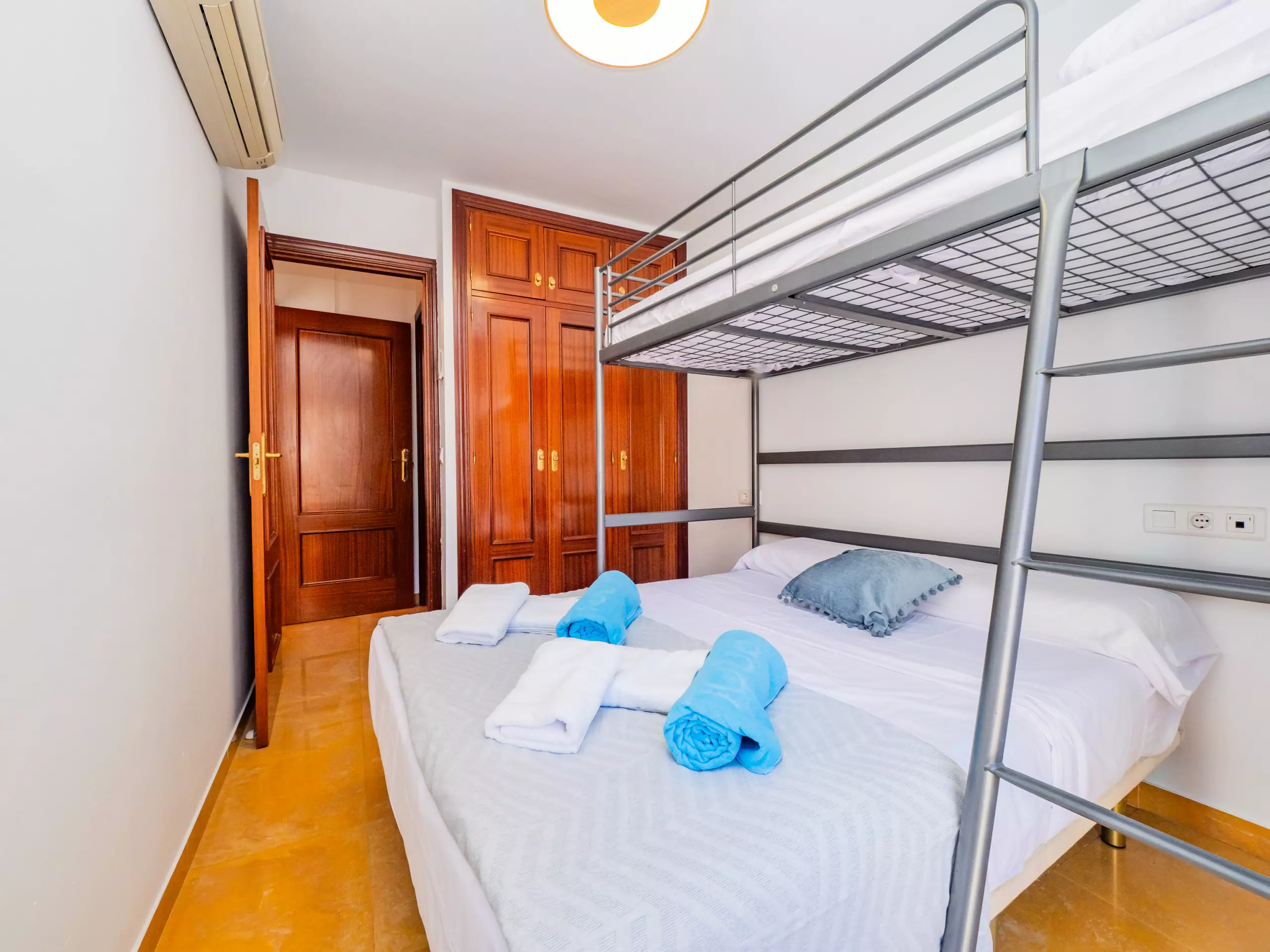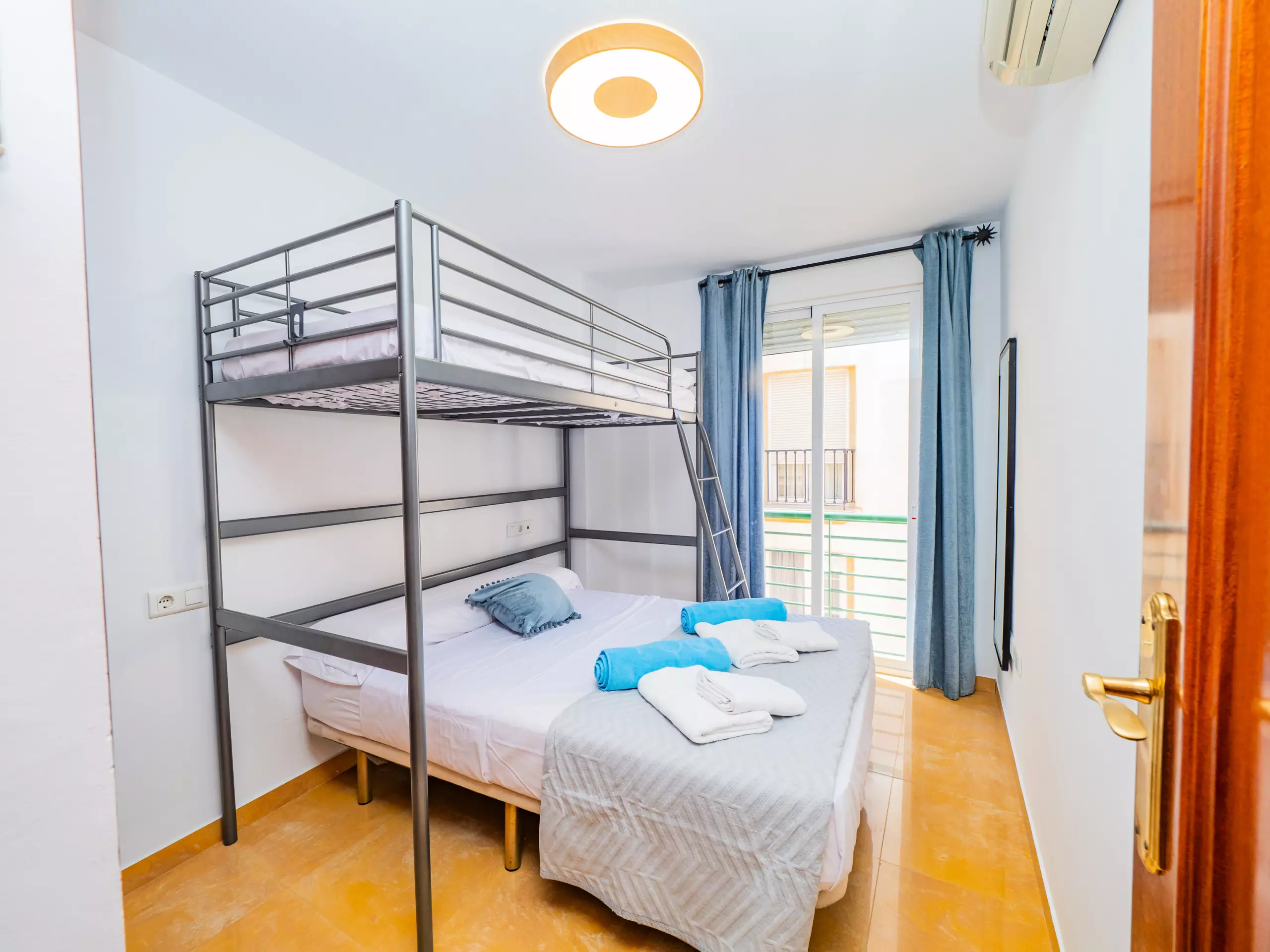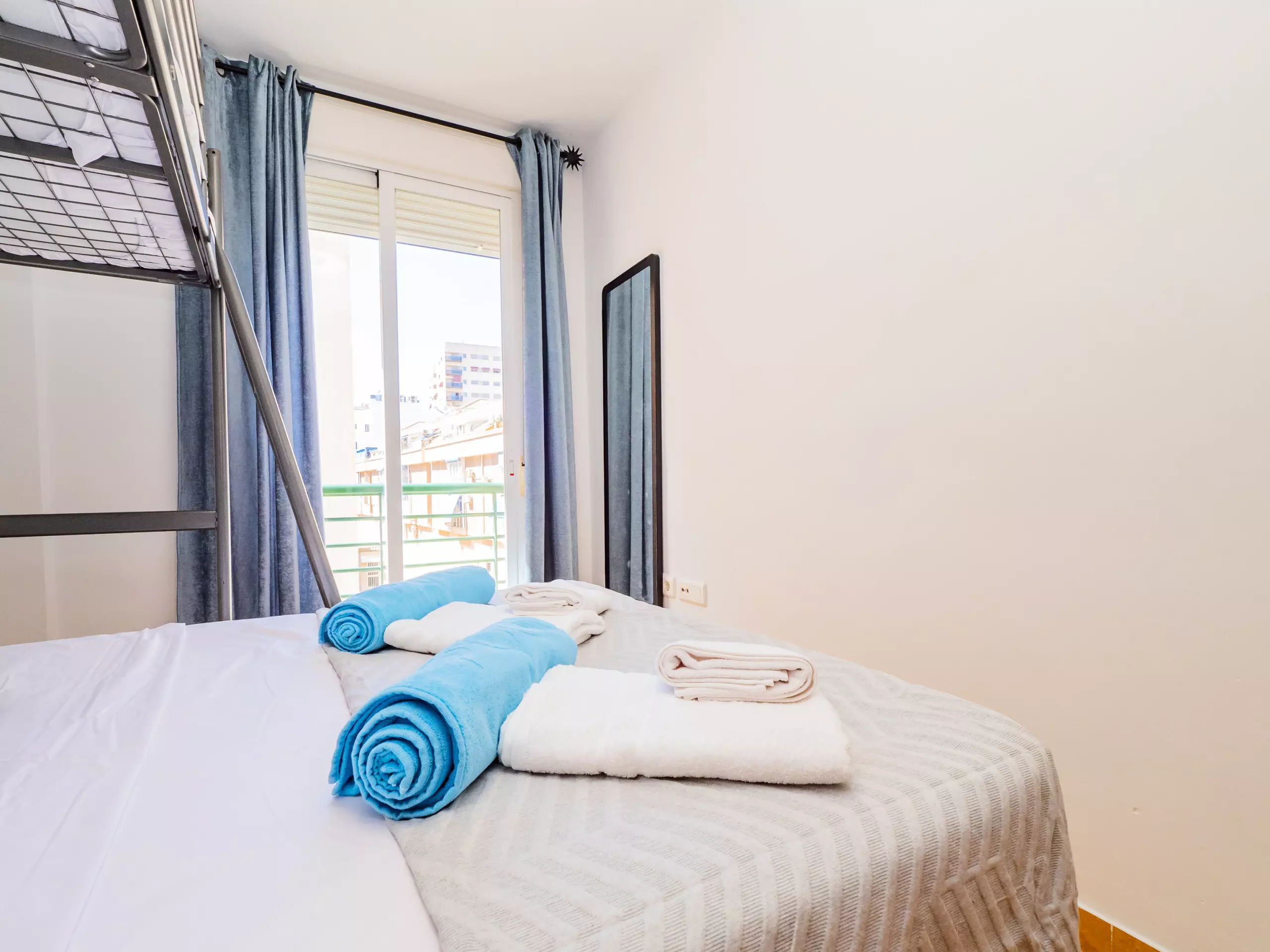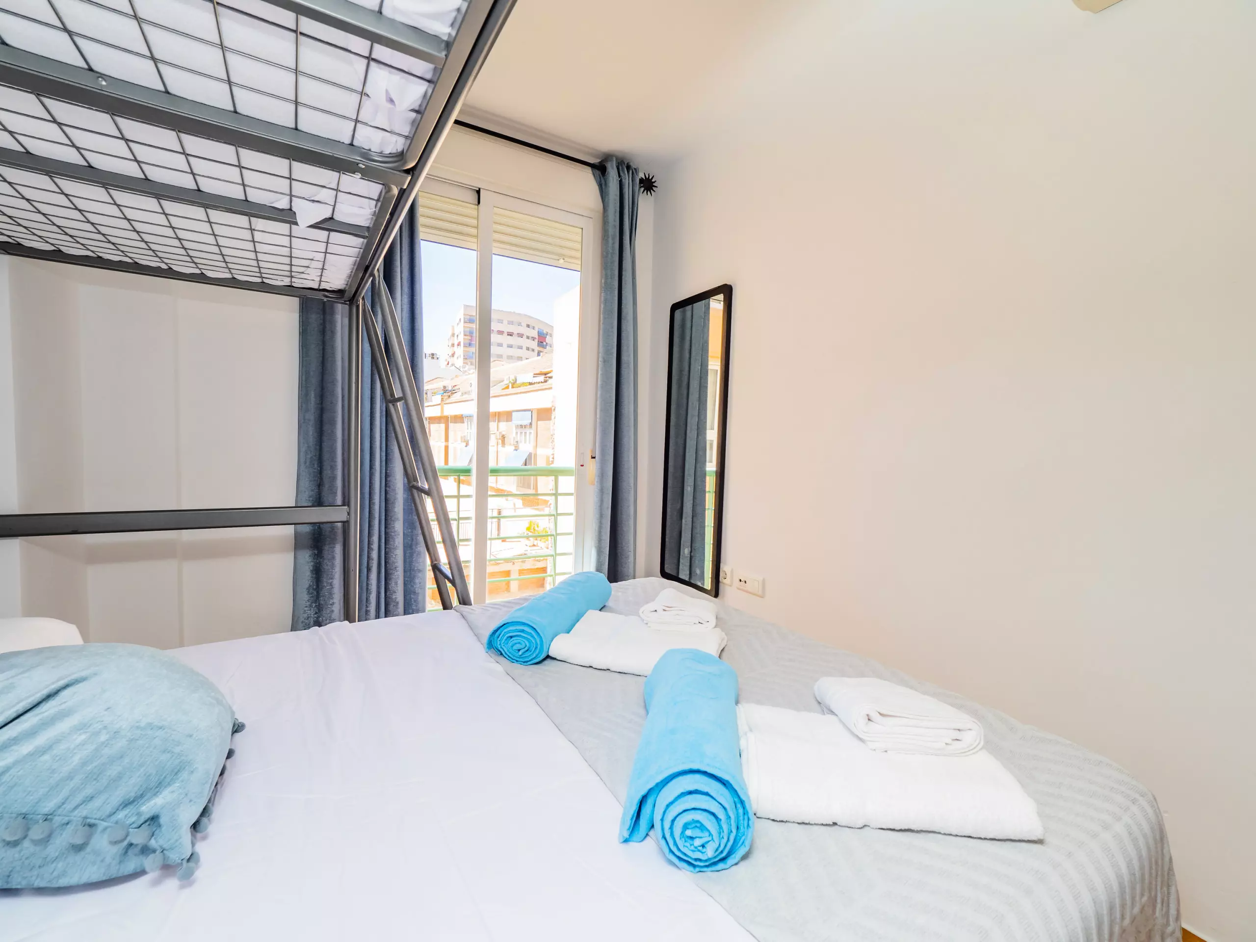 La chambre dispose d'un lit superposé pour trois personnes, avec un lit matrimonial en bas et une fenêtre extérieure qui apporte un bon éclairage naturel et des vues urbaines. De plus, elle comprend un placard intégré pour maintenir vos bagages bien rangés. La salle de bain dispose d'une baignoire de petite taille pour votre confort.