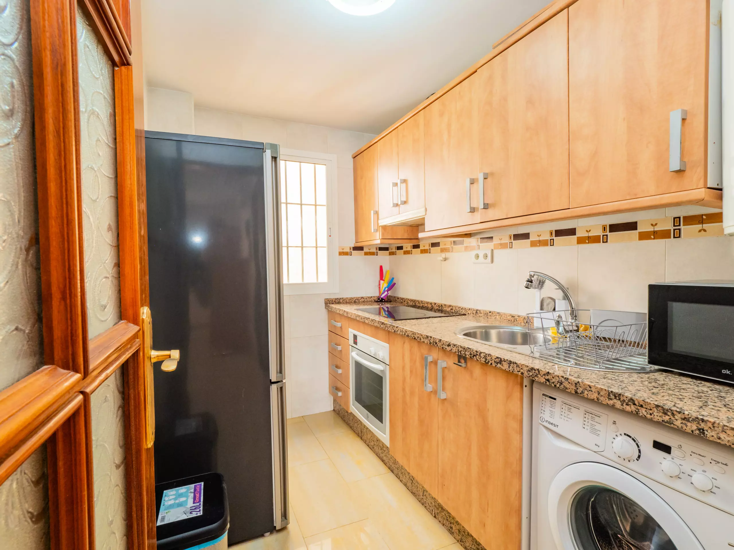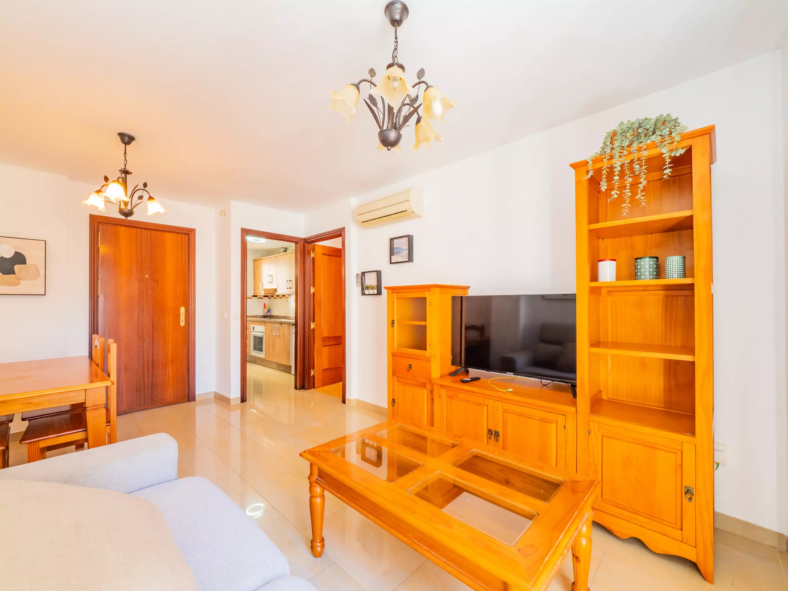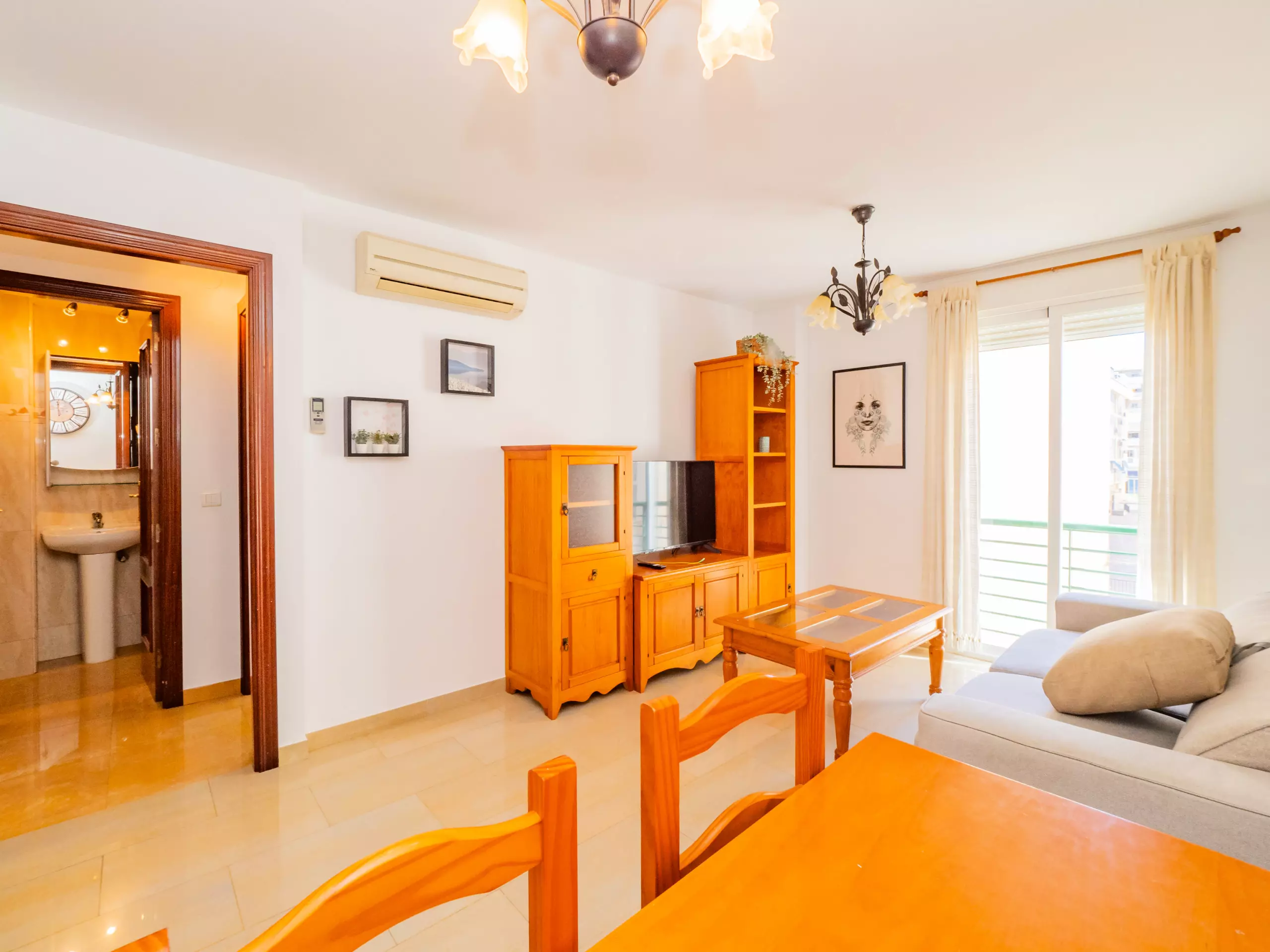 L'appartement se trouve au deuxième étage sans ascenseur et dispose de la climatisation dans le salon et la chambre pour votre confort. À l'entrée, vous accueille un grand salon-salle à manger avec un canapé confortable, parfait pour se détendre après une journée d'exploration ou planifier vos prochaines aventures. La cuisine indépendante est équipée d'une plaque vitrocéramique, d'un réfrigérateur, d'un micro-ondes, d'un four, d'un congélateur, d'une machine à laver et de tous les ustensiles nécessaires, bien que nous vous recommandions de profiter de l'offre gastronomique locale.