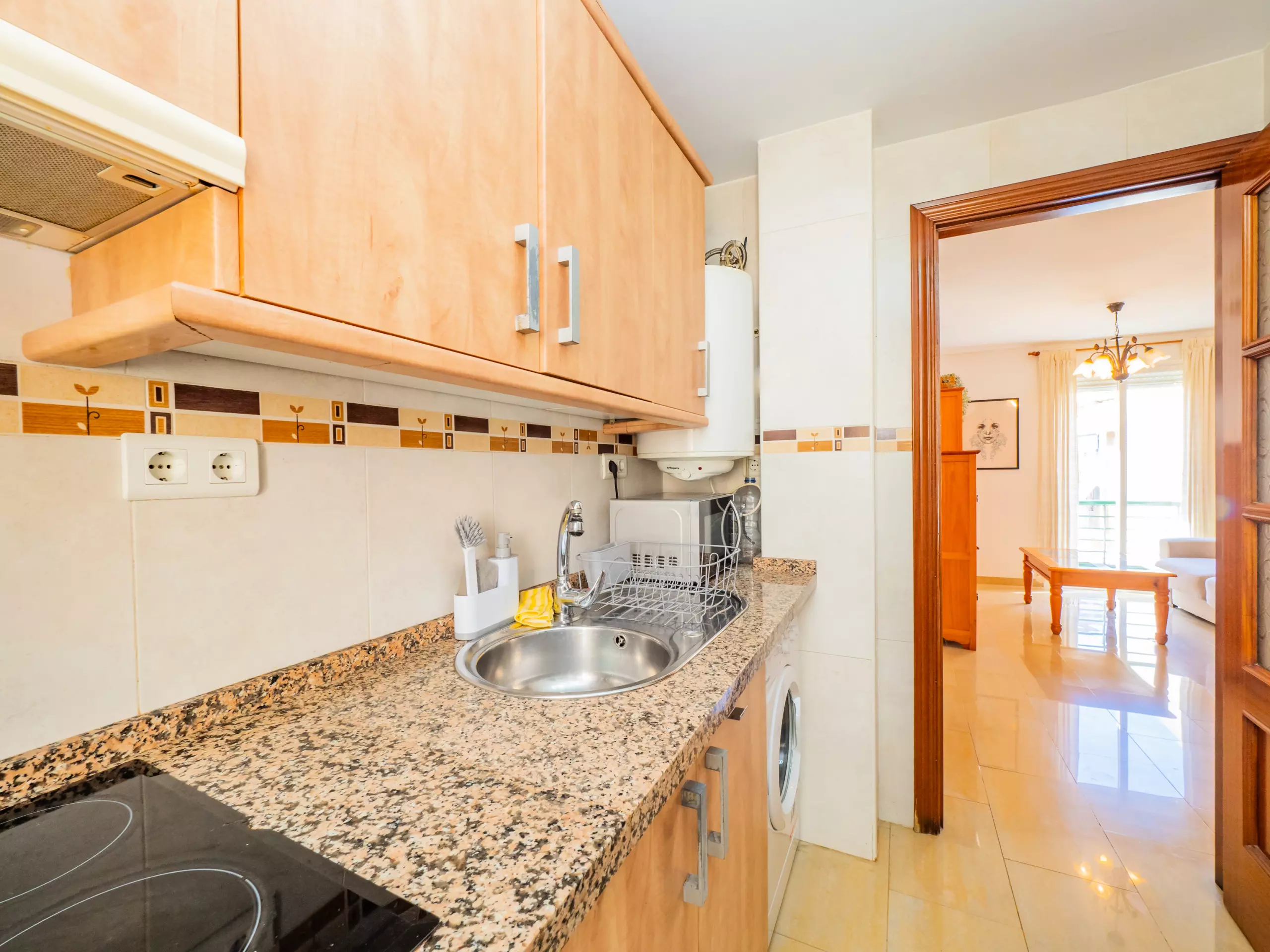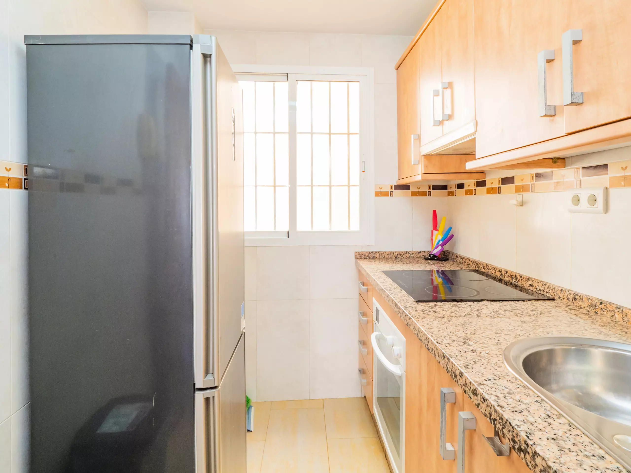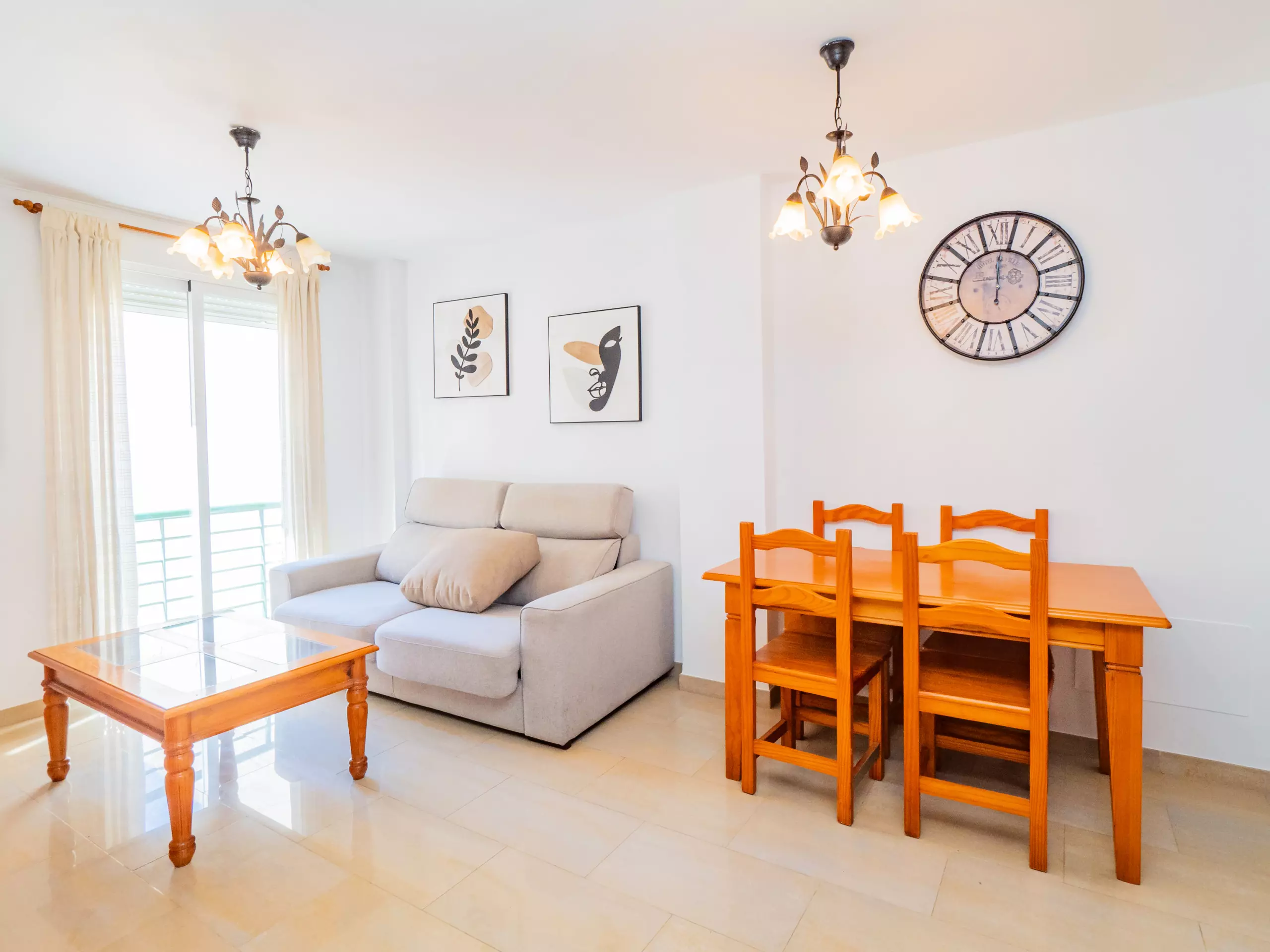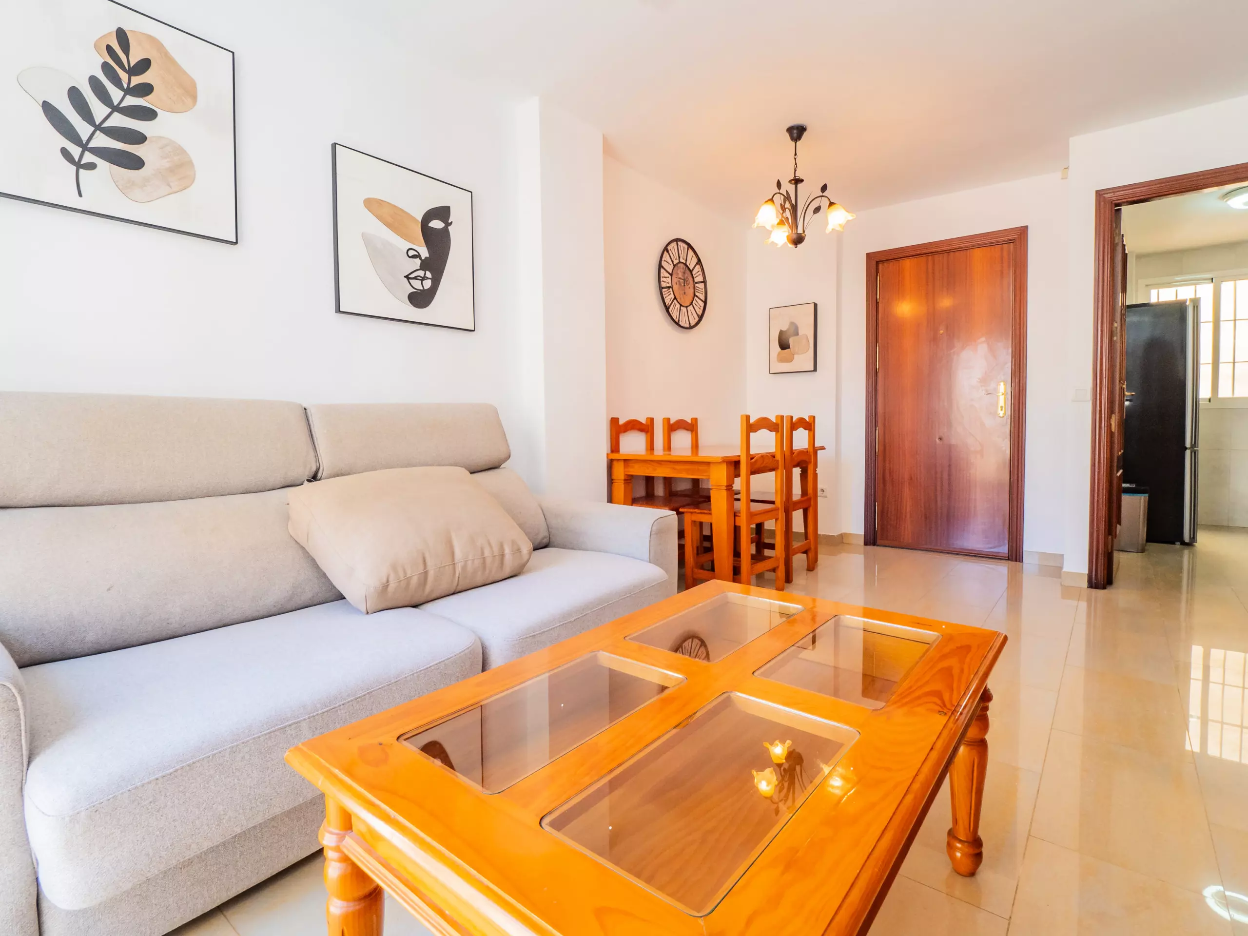 L'appartement se trouve au deuxième étage sans ascenseur et dispose de la climatisation dans le salon et la chambre pour votre confort. À l'entrée, vous accueille un grand salon-salle à manger avec un canapé confortable, parfait pour se détendre après une journée d'exploration ou planifier vos prochaines aventures. La cuisine indépendante est équipée d'une plaque vitrocéramique, d'un réfrigérateur, d'un micro-ondes, d'un four, d'un congélateur, d'une machine à laver et de tous les ustensiles nécessaires, bien que nous vous recommandions de profiter de l'offre gastronomique locale.