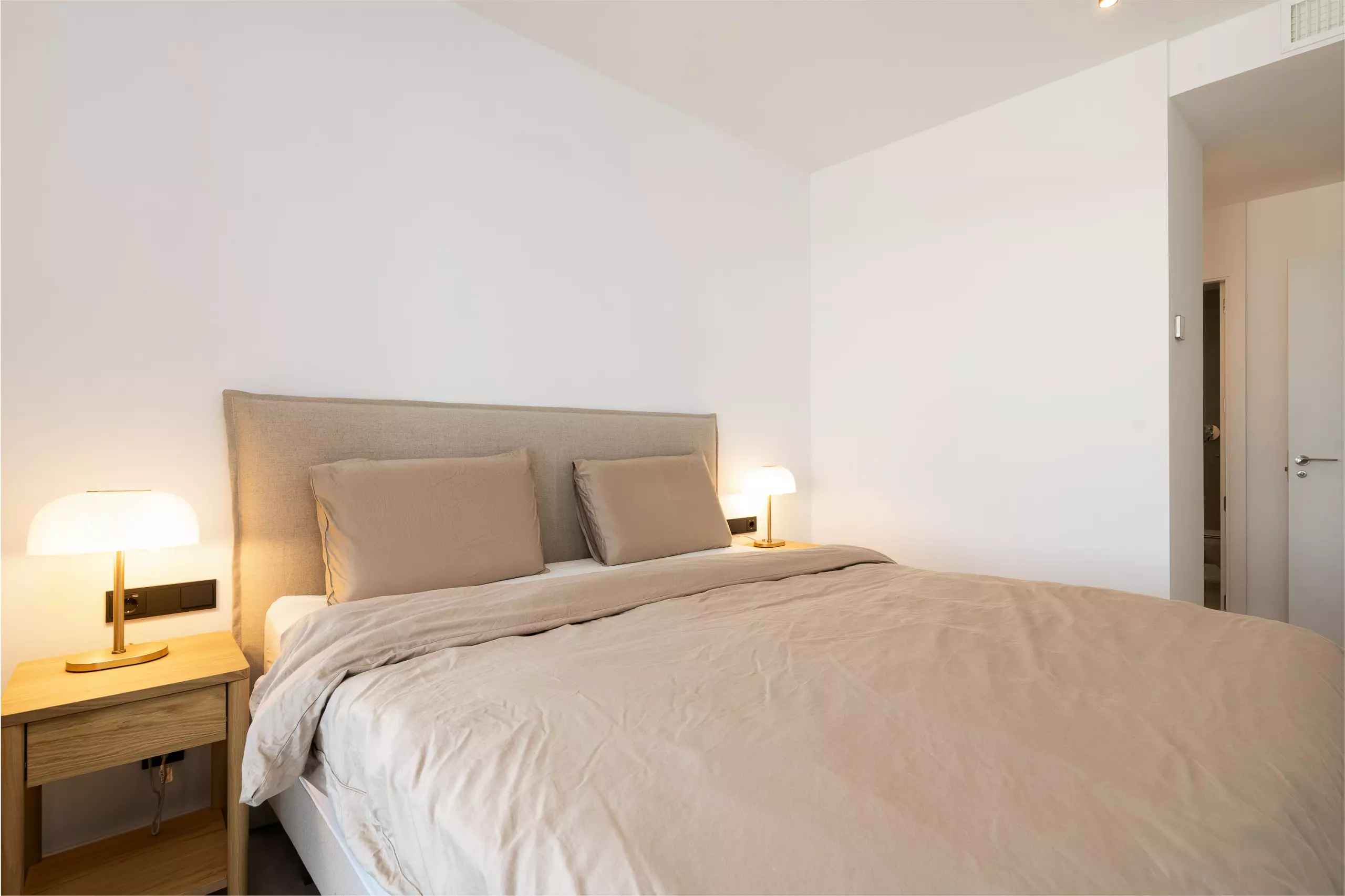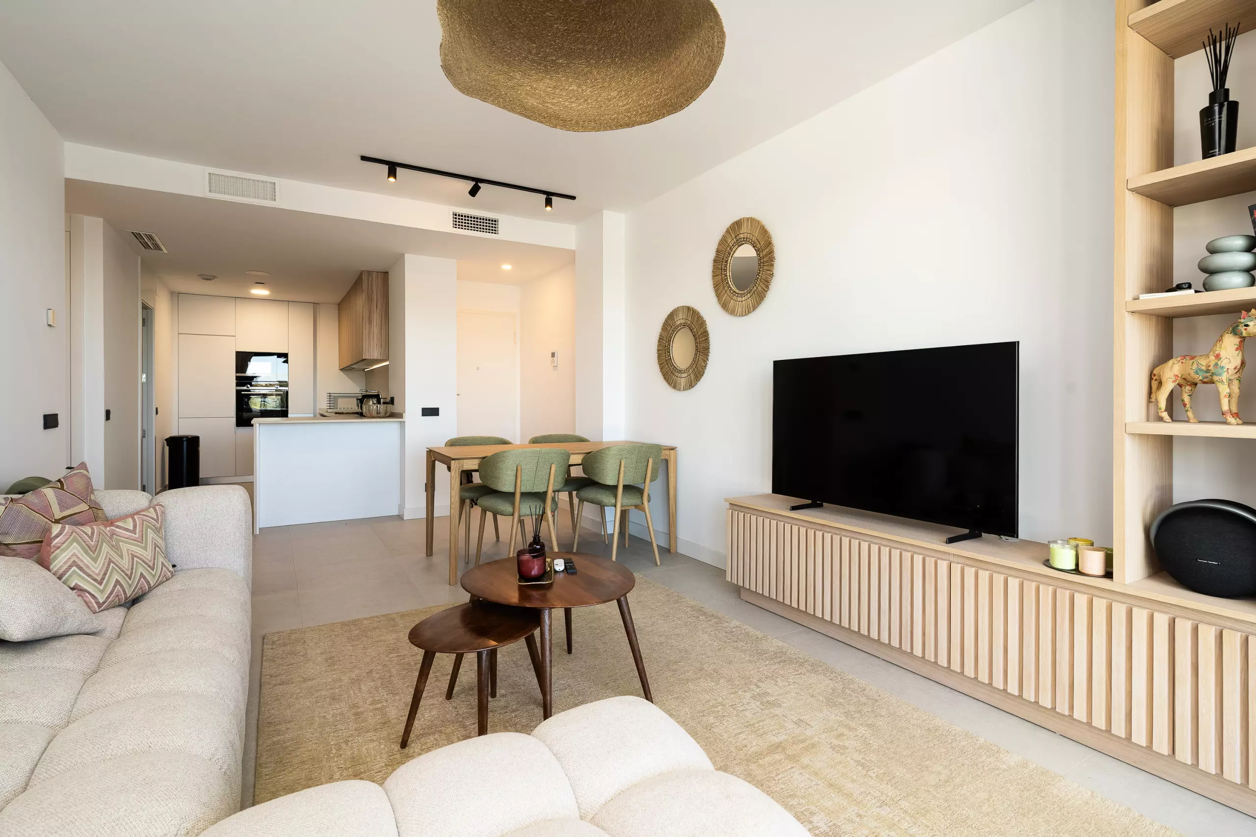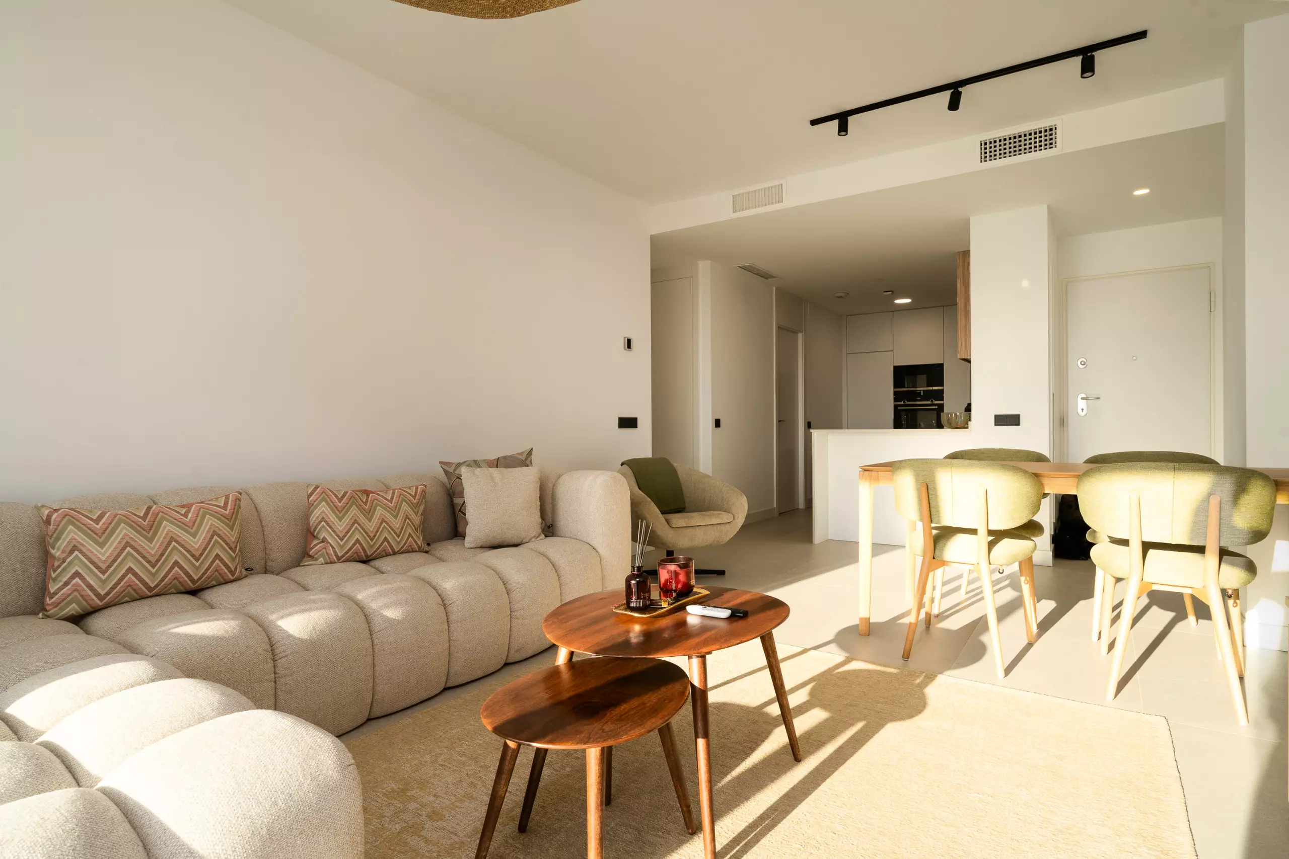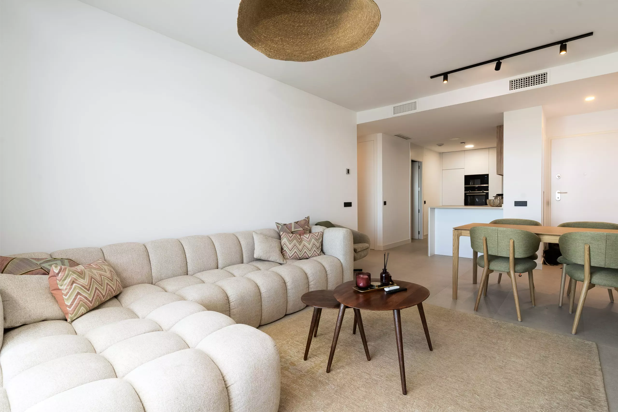L'appartement dispose de 2 chambres, 2 salles de bains modernes et d'une cuisine ouverte lumineuse intégrée au salon, créant un espace confortable et contemporain.