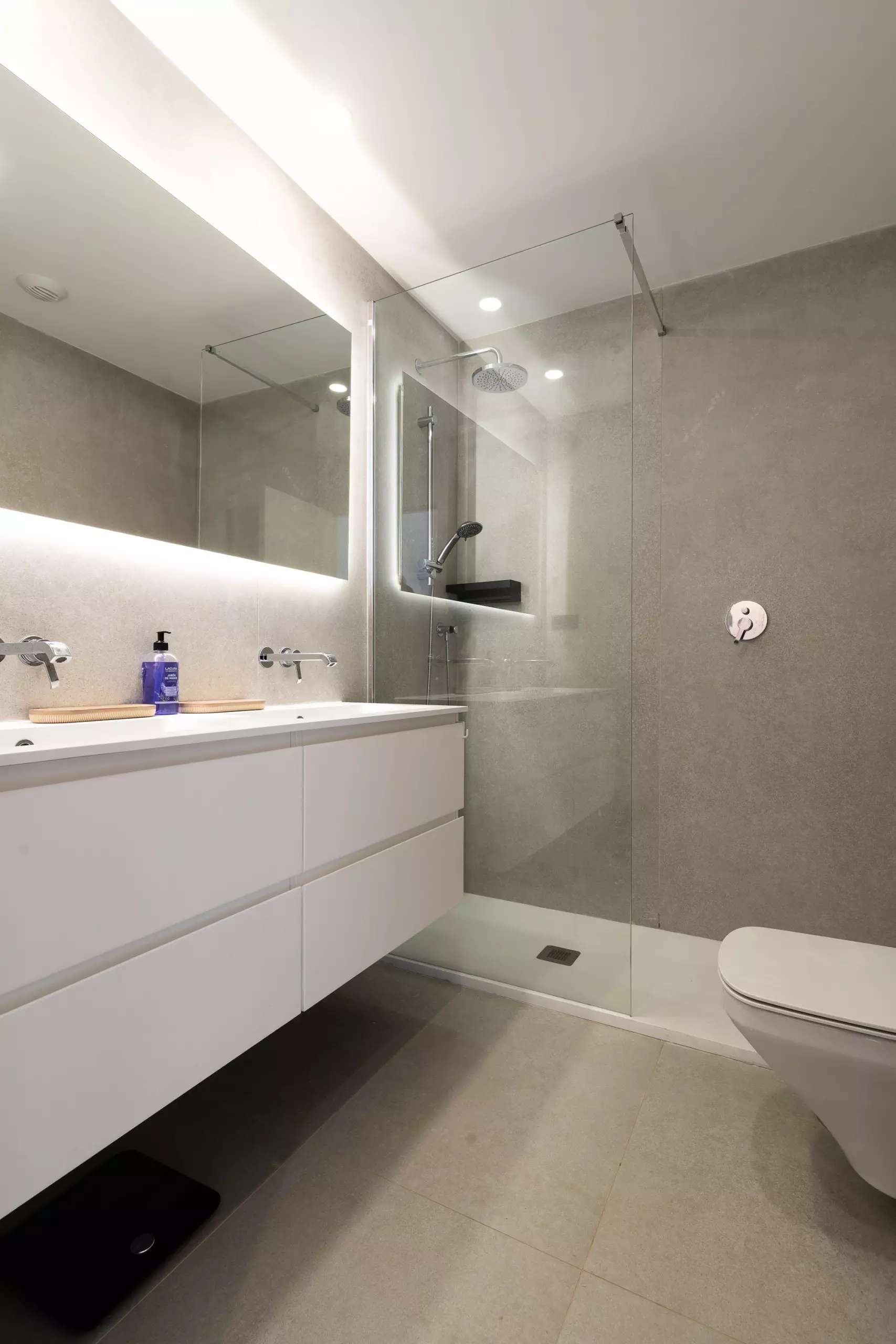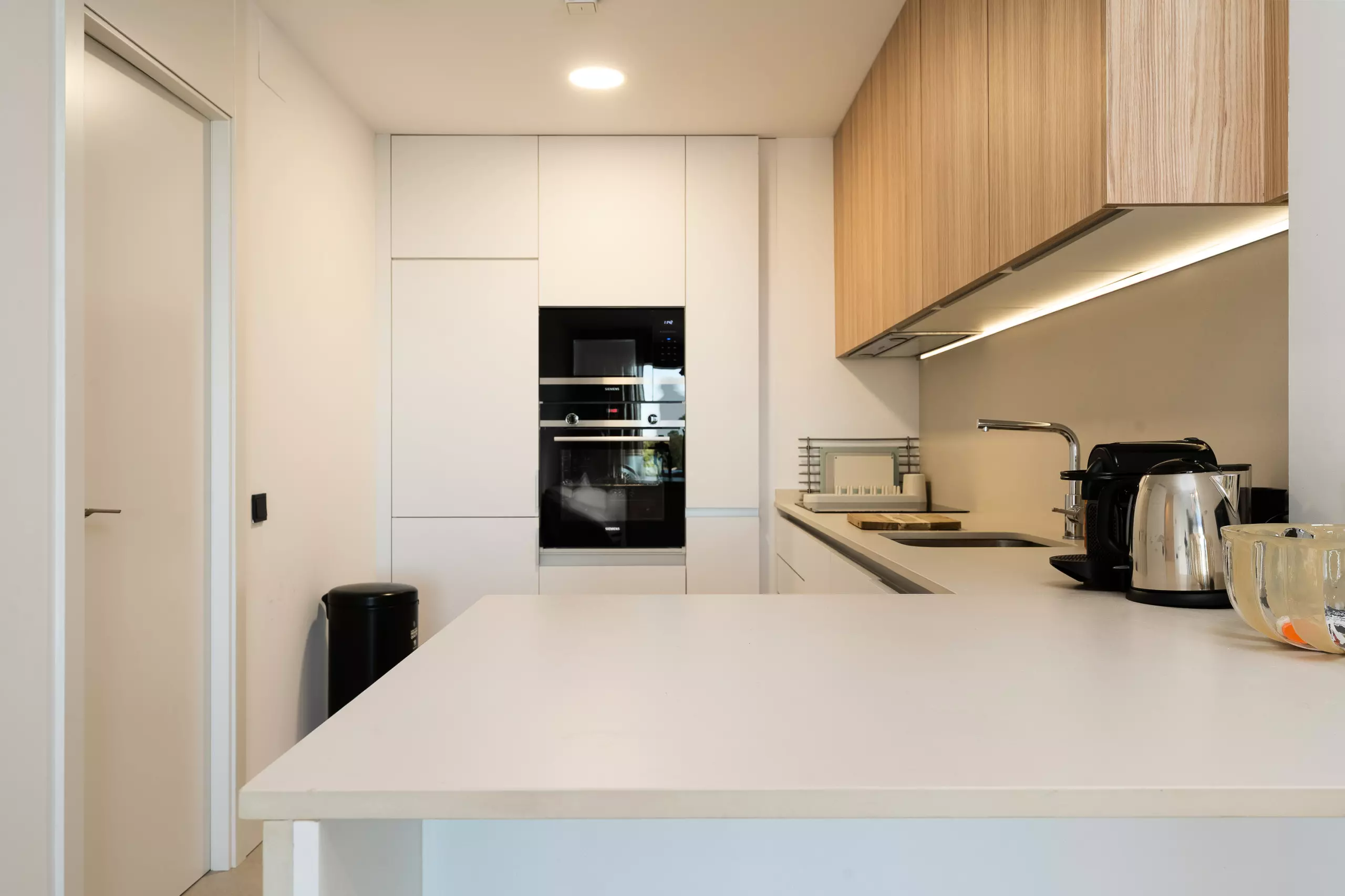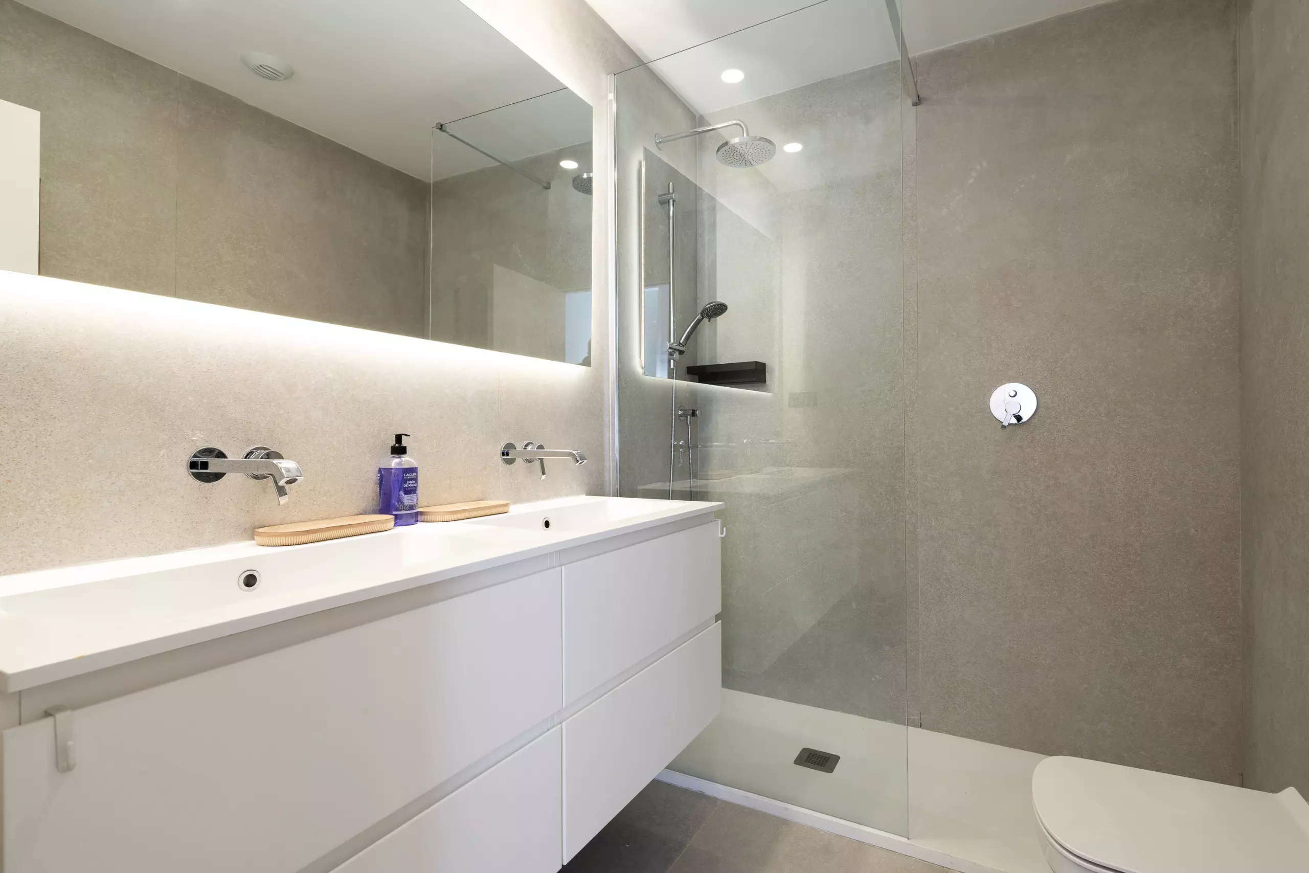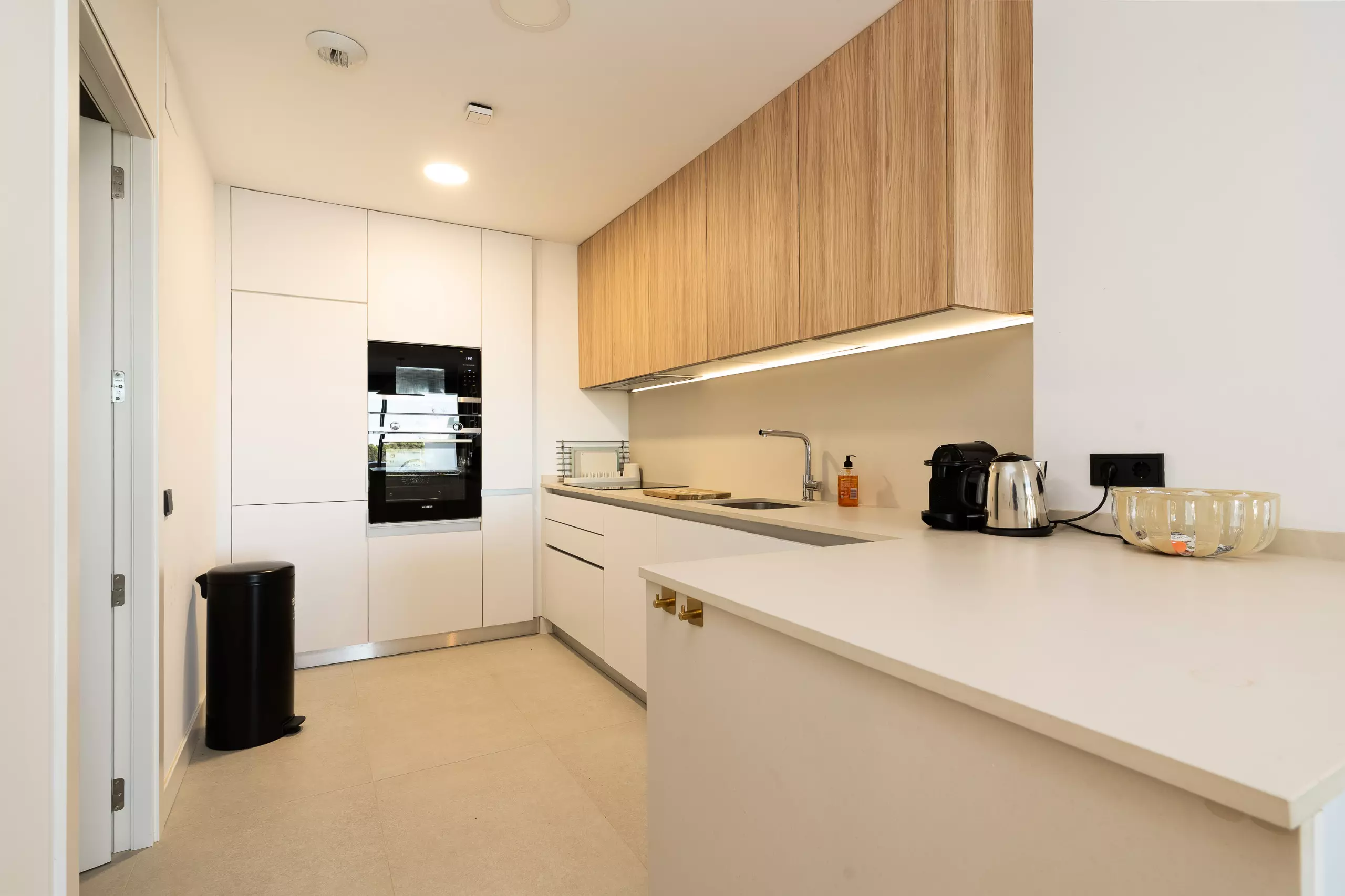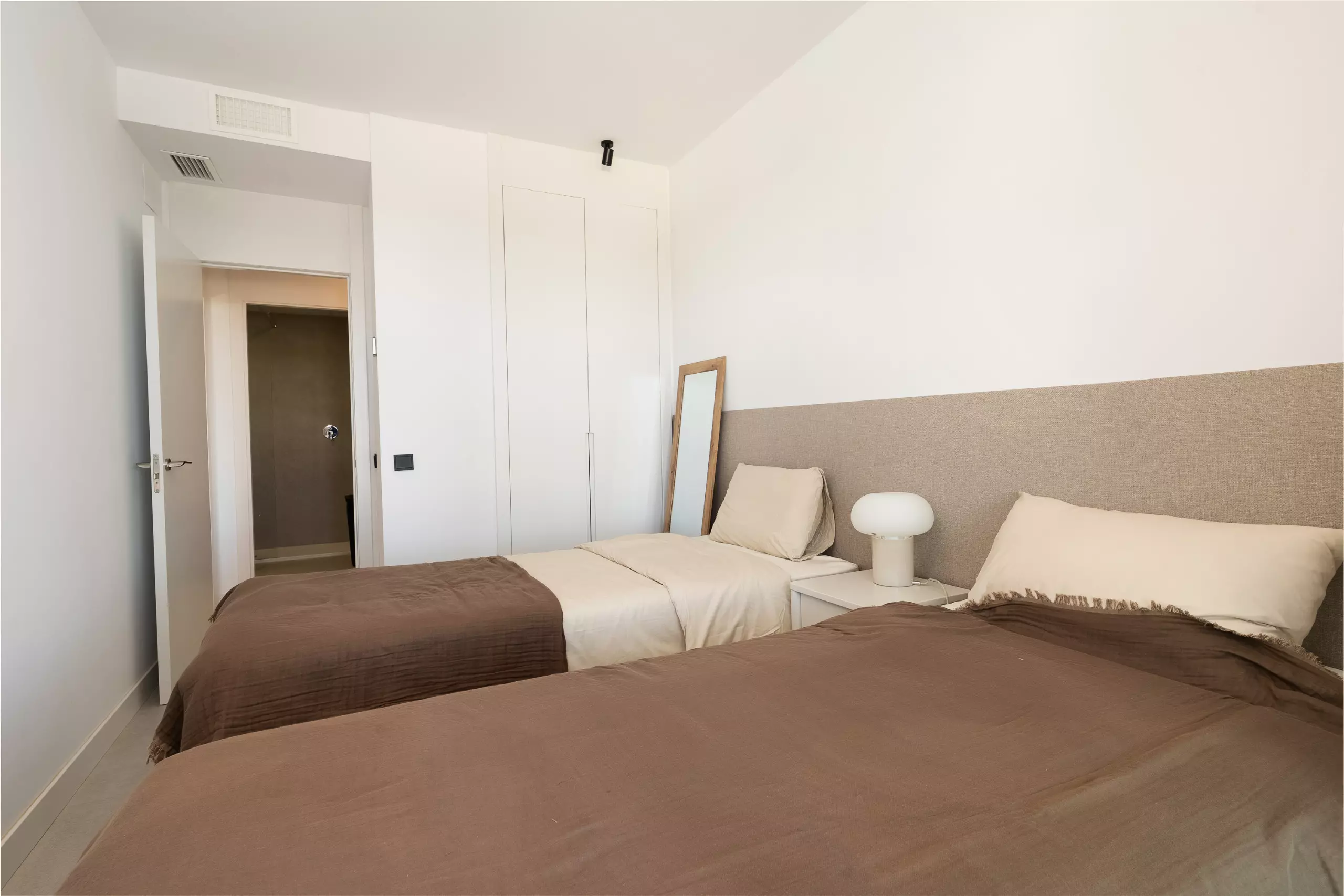 L'appartement dispose de 2 chambres, 2 salles de bains modernes et d'une cuisine ouverte lumineuse intégrée au salon, créant un espace confortable et contemporain.