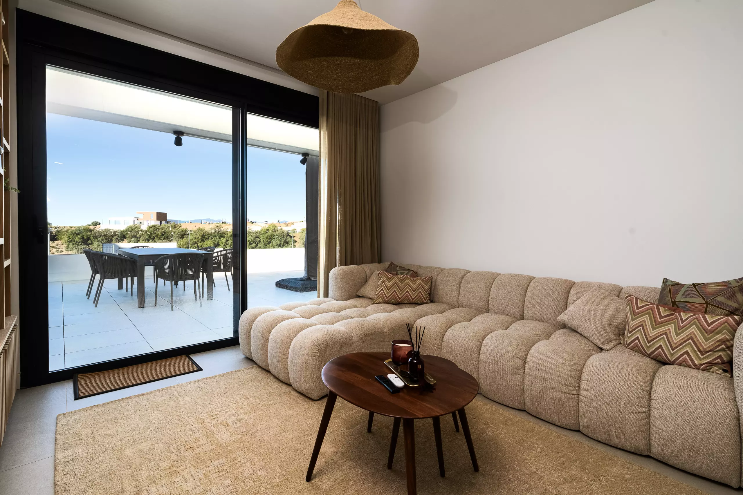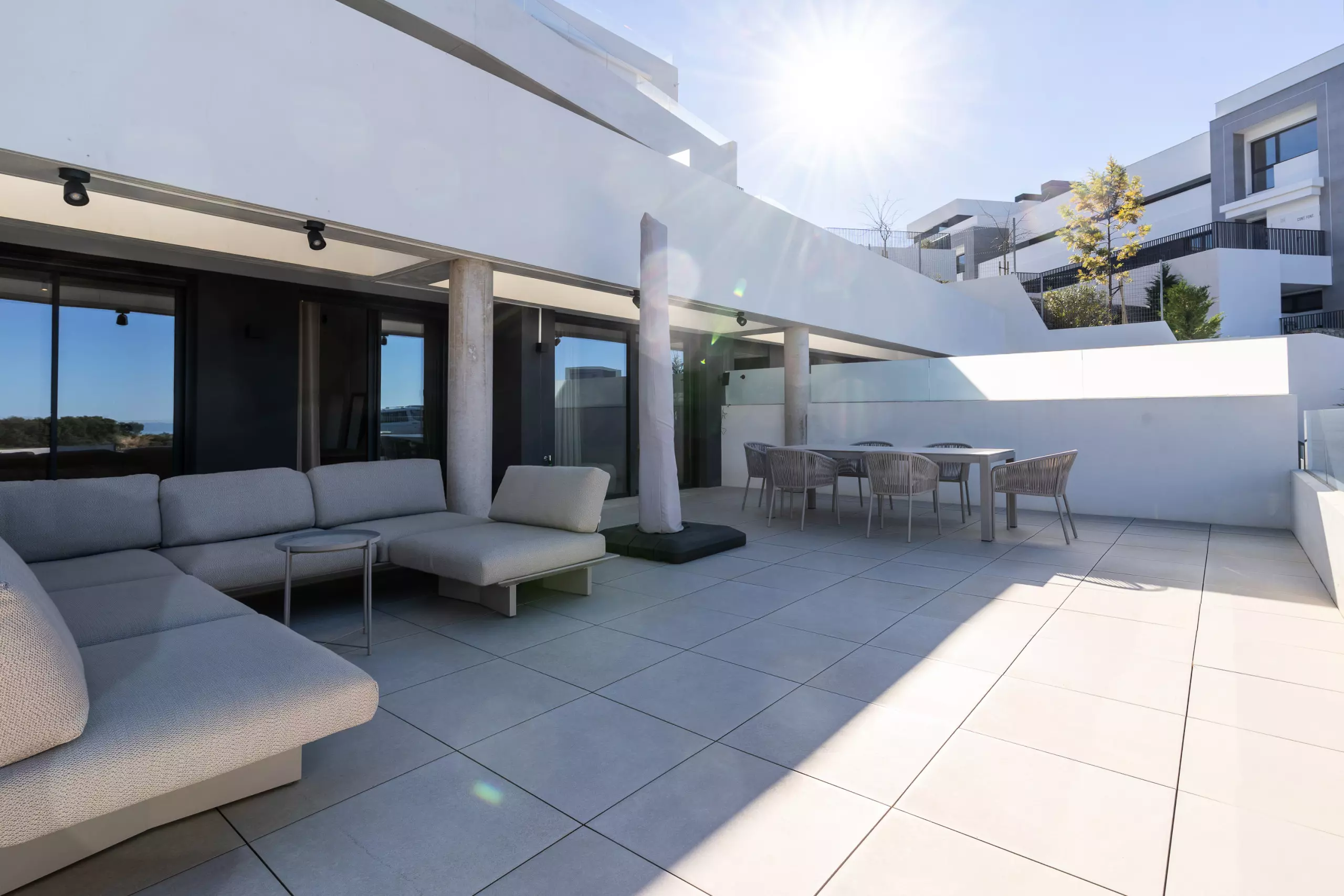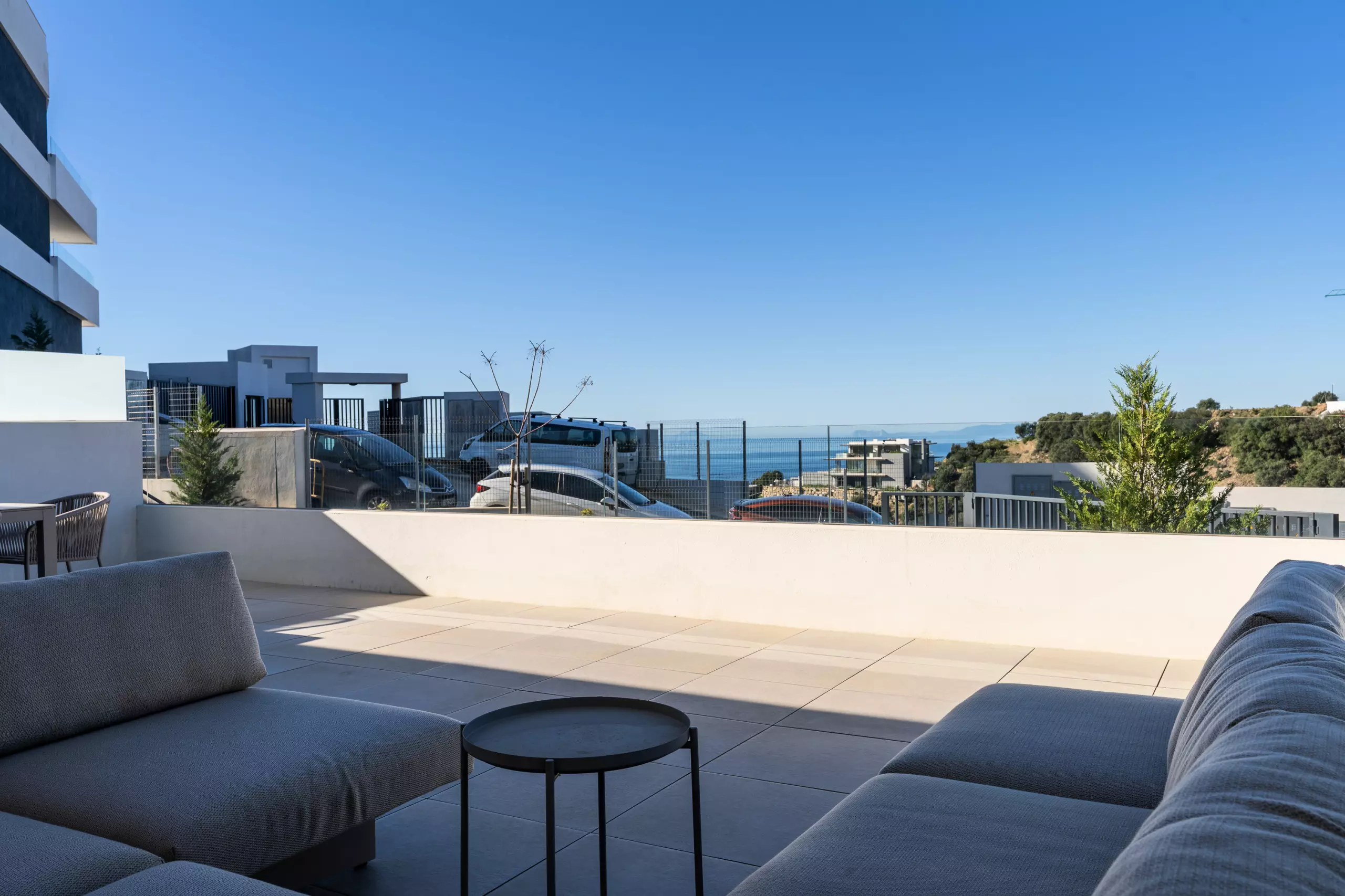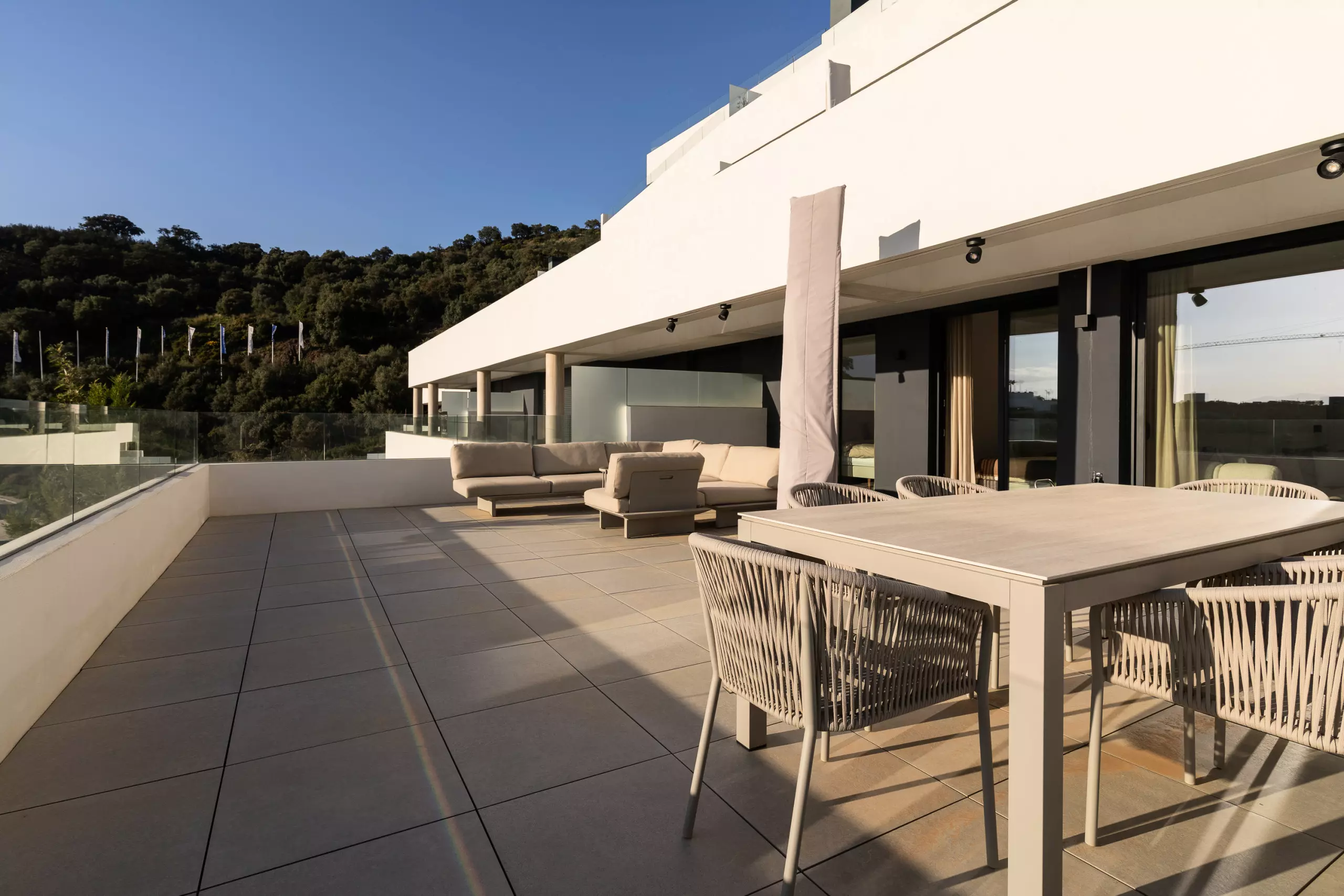 Depuis le salon, on accède à une grande terrasse privée avec de belles vues, parfaite pour prendre son petit-déjeuner au soleil ou profiter d'un verre au coucher du soleil.
