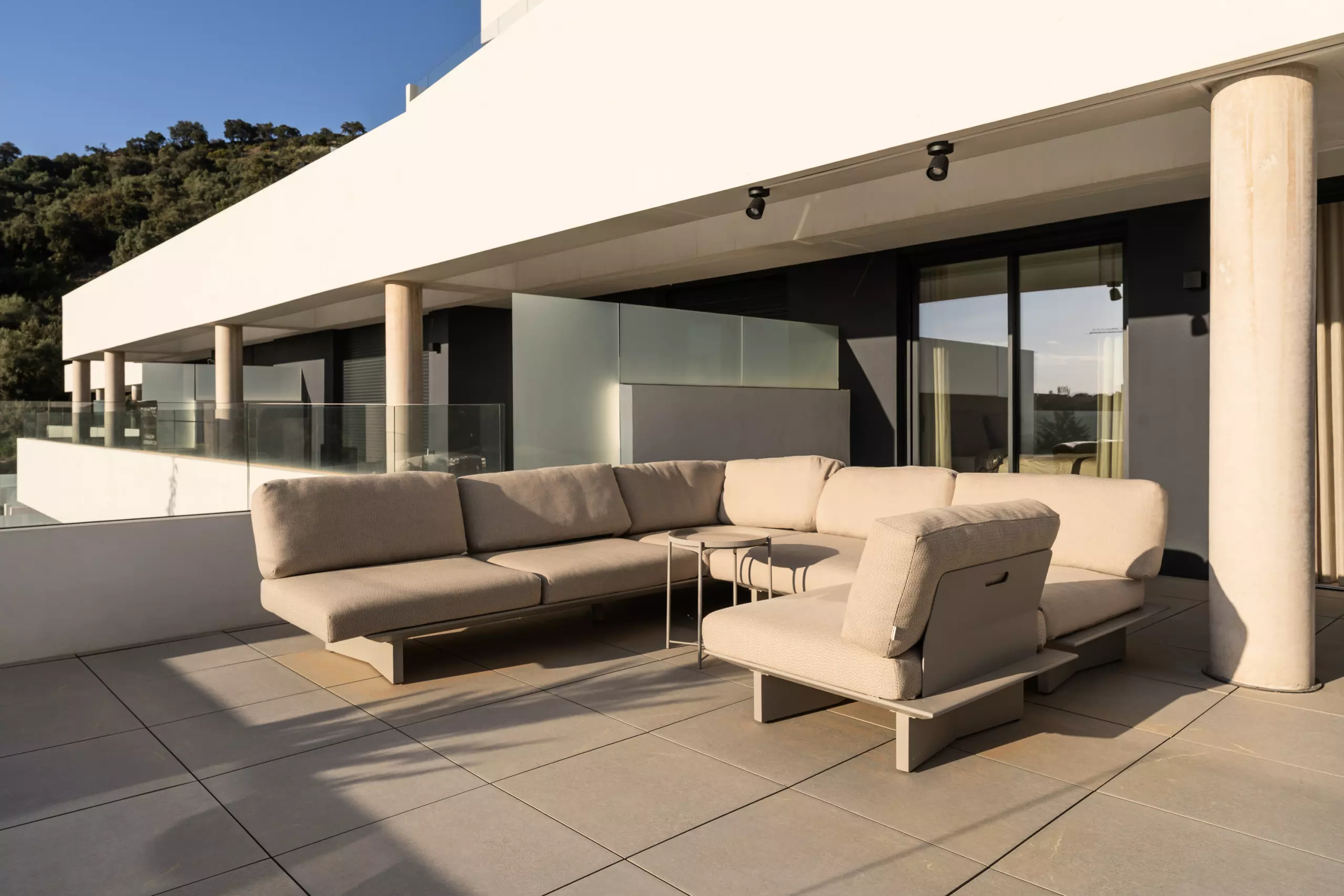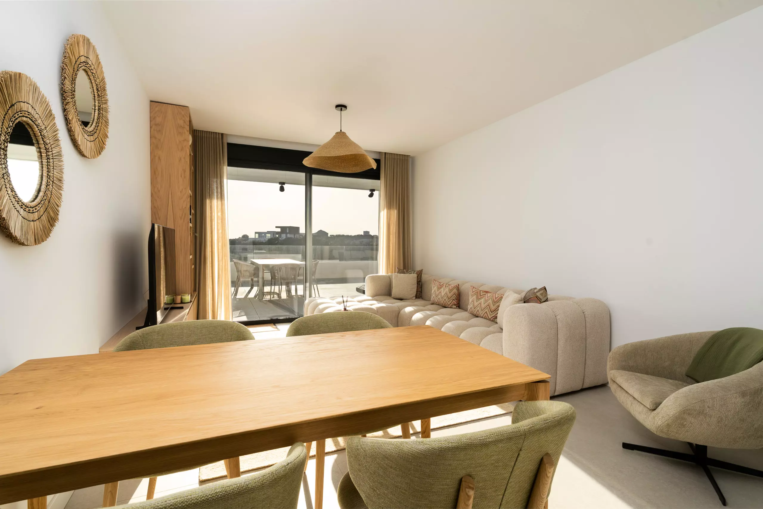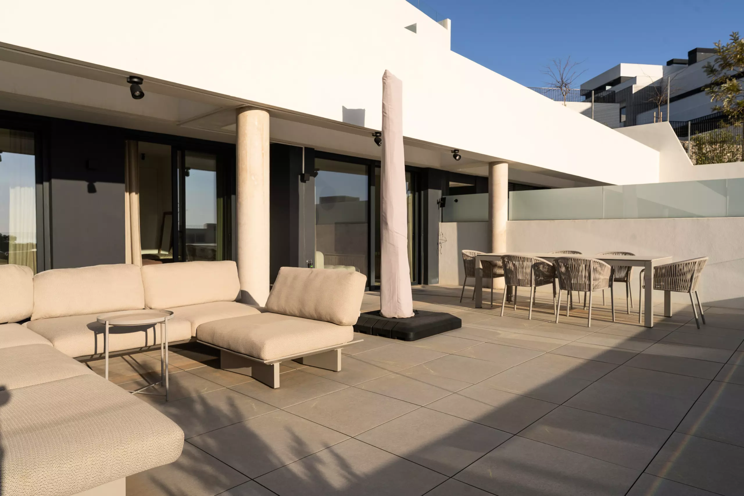Depuis le salon, on accède à une grande terrasse privée avec de belles vues, parfaite pour prendre son petit-déjeuner au soleil ou profiter d'un verre au coucher du soleil.