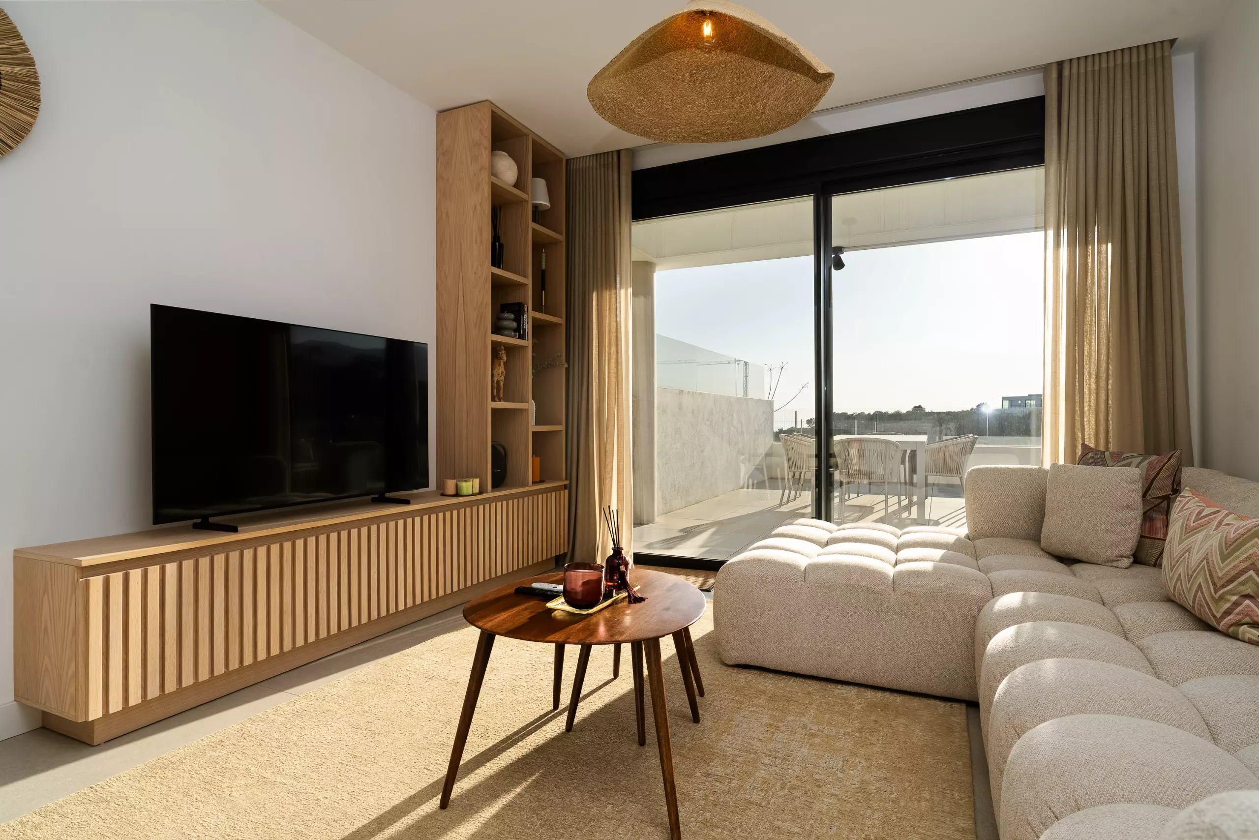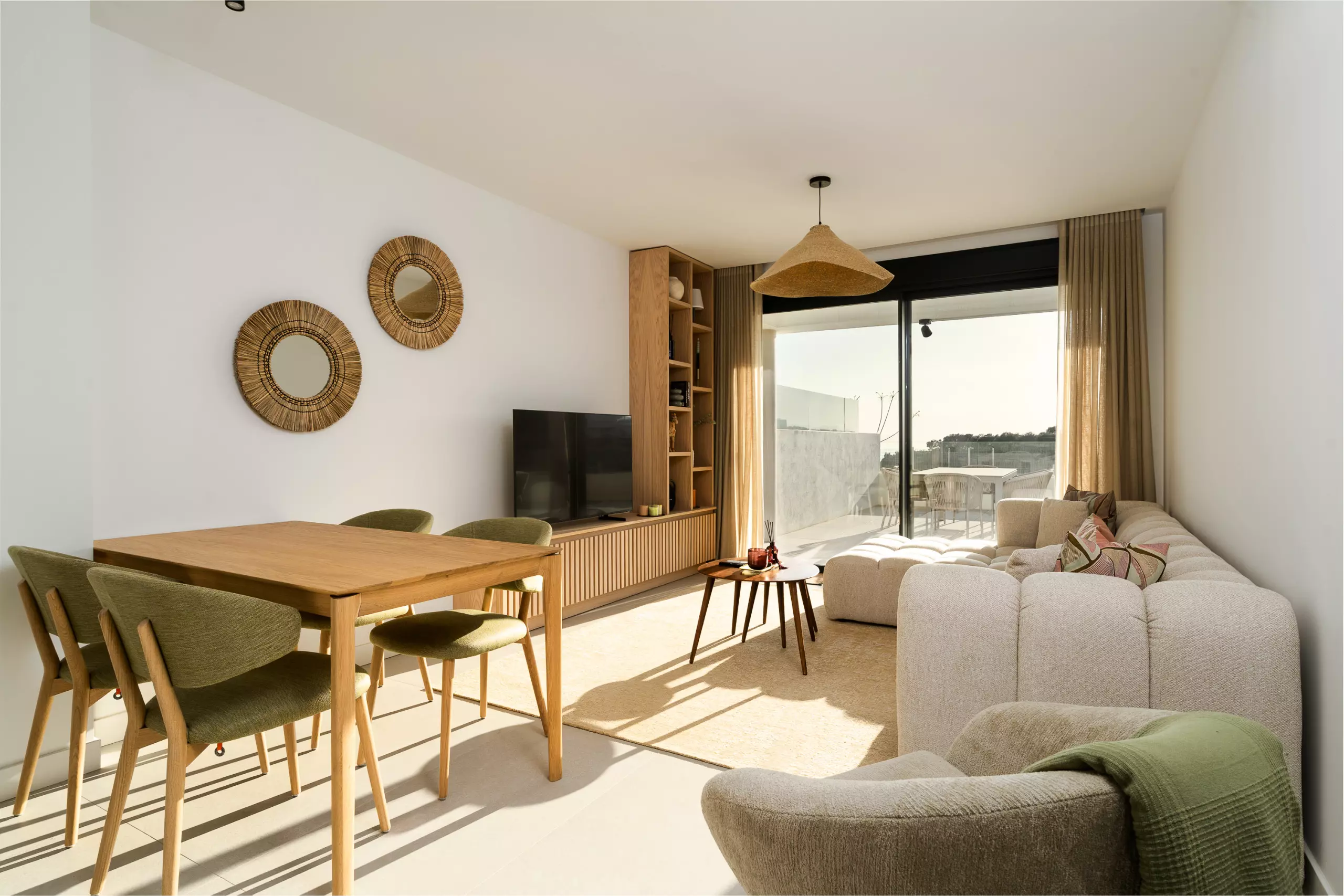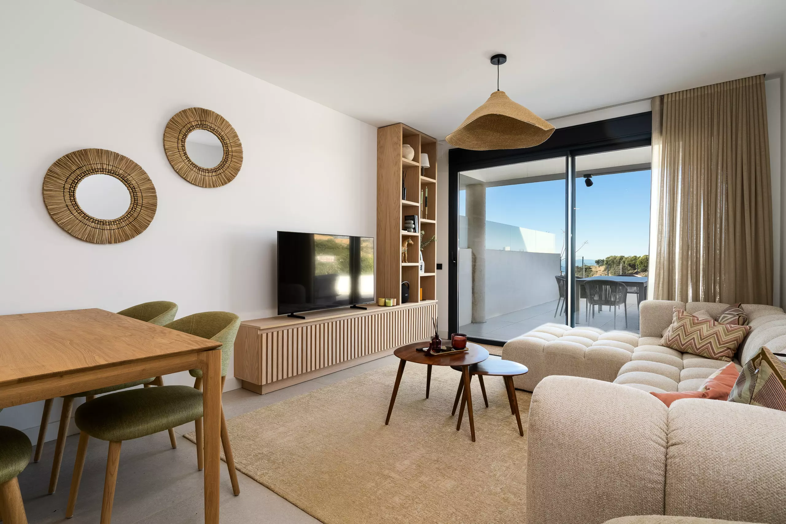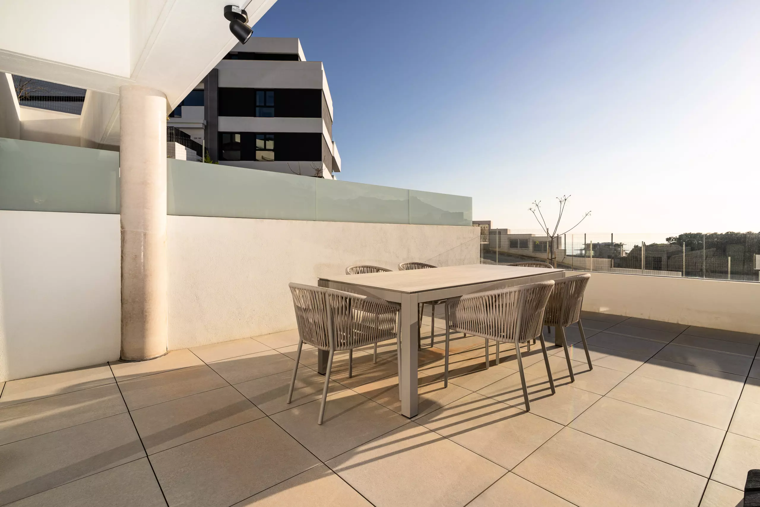 Depuis le salon, on accède à une grande terrasse privée avec de belles vues, parfaite pour prendre son petit-déjeuner au soleil ou profiter d'un verre au coucher du soleil.