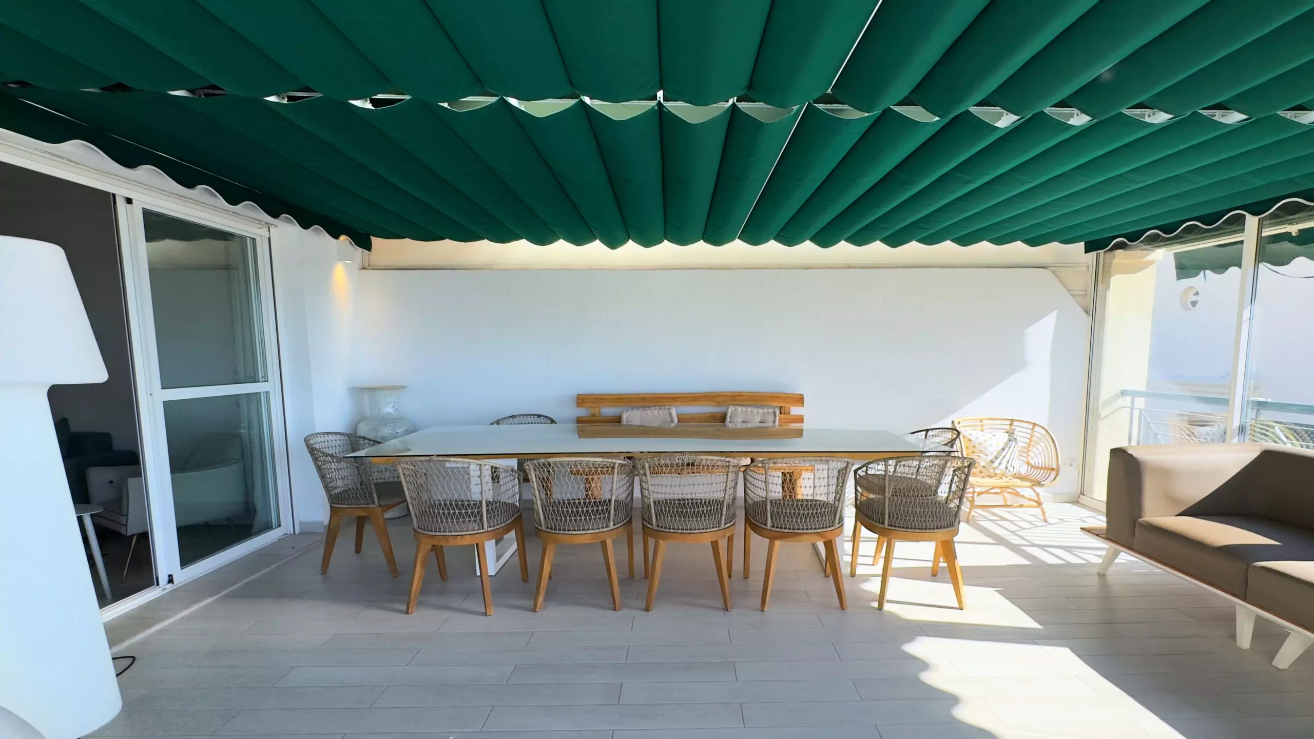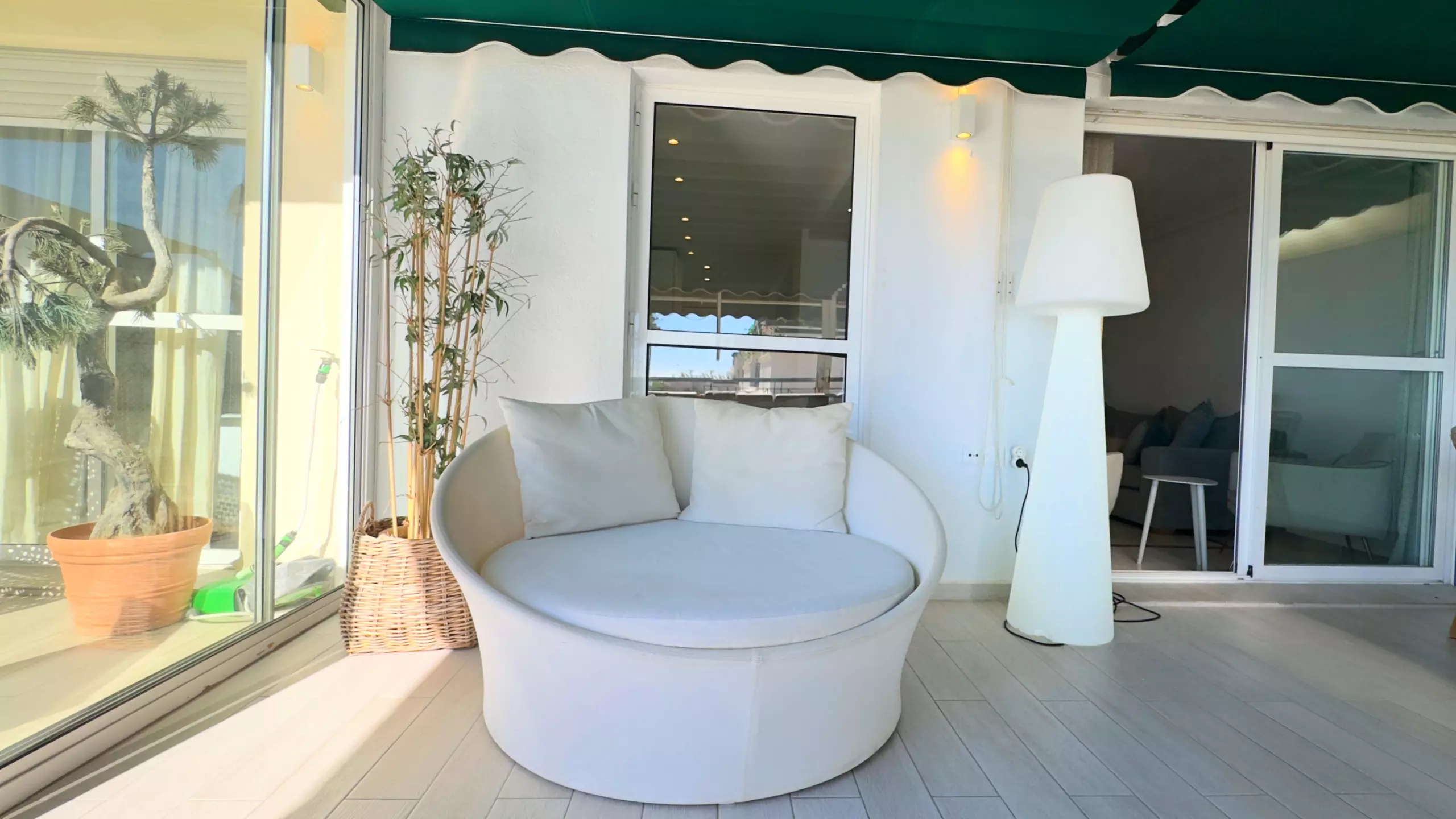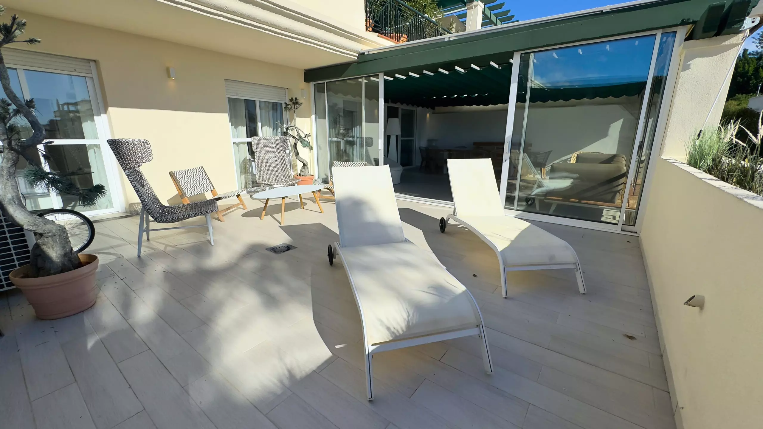 Le salon donne accès à une grande terrasse vitrée avec espace repas et coin détente, ainsi qu'un espace extérieur avec chaises longues pour profiter du soleil grâce à son orientation sud.