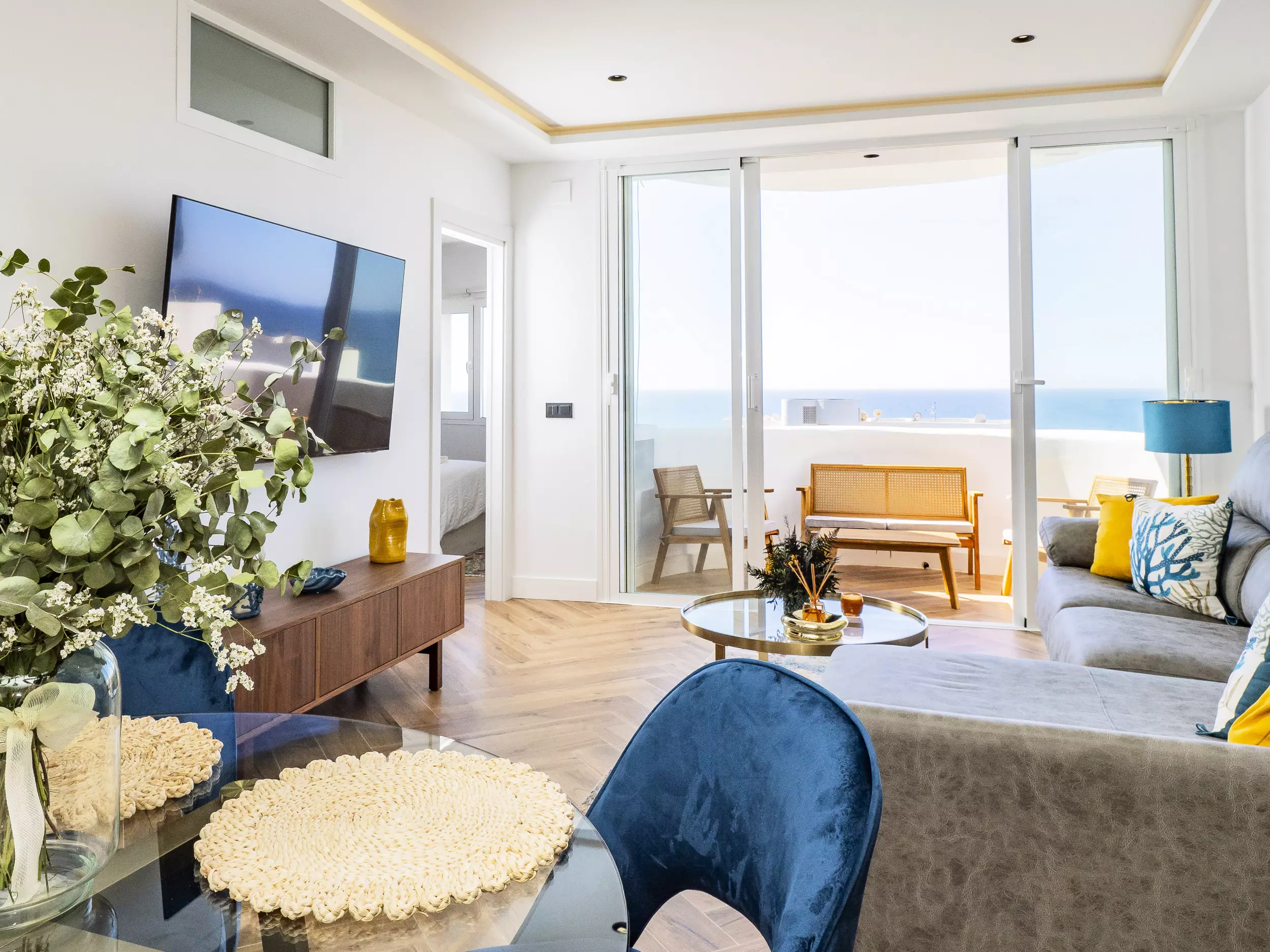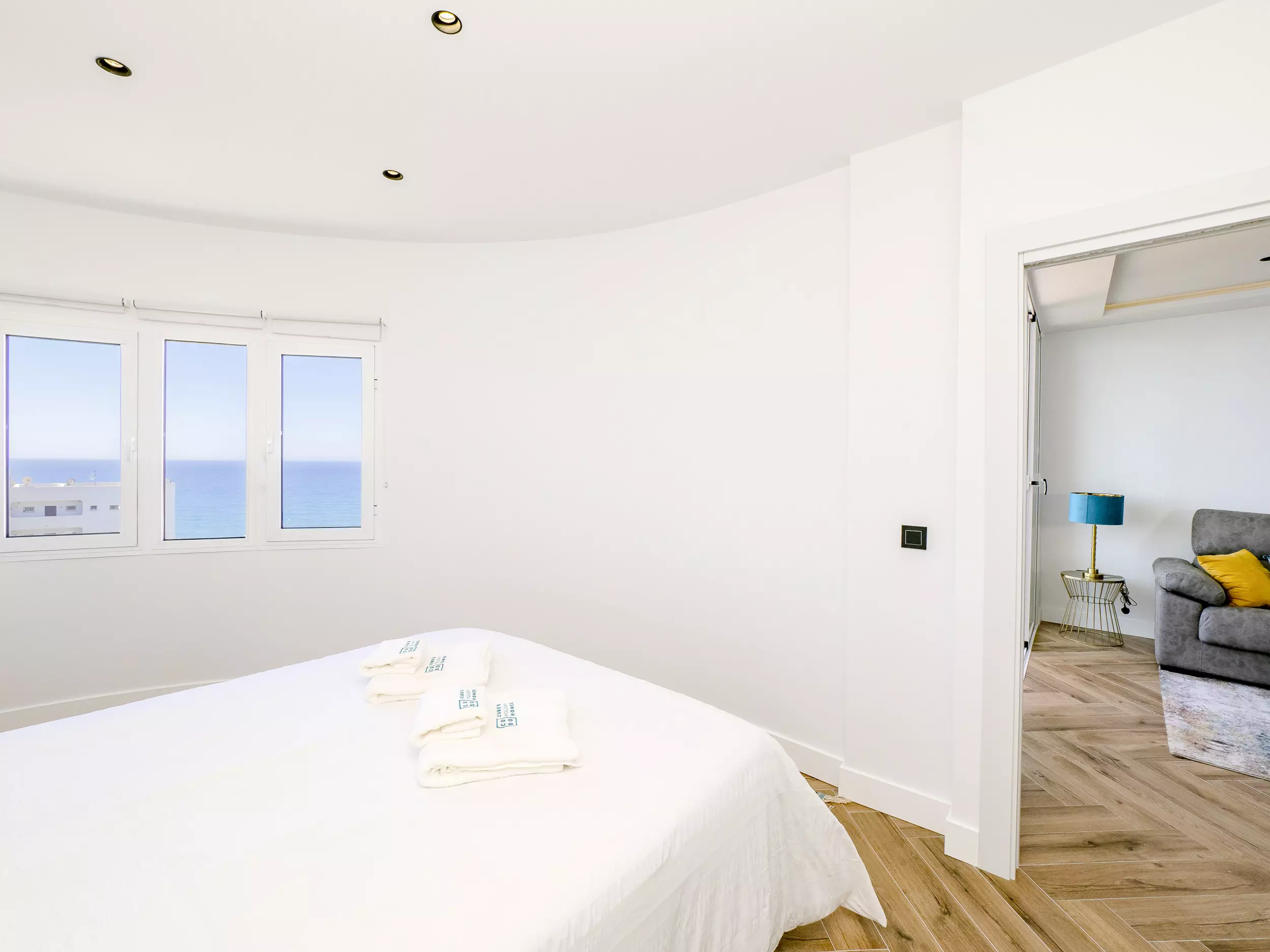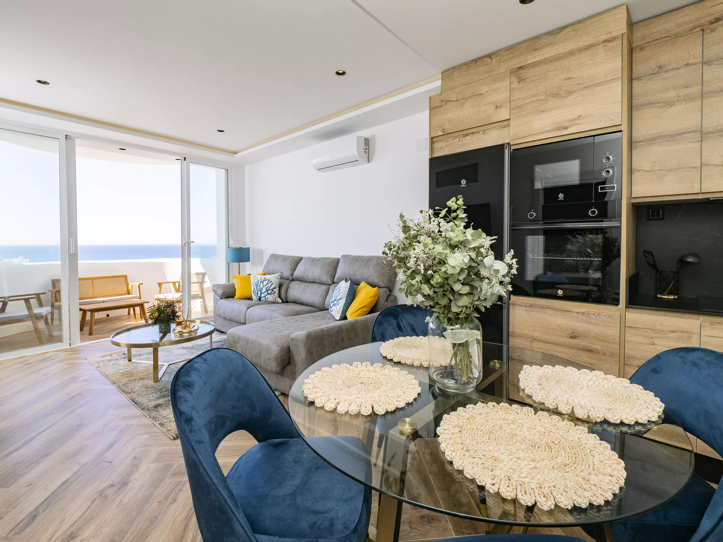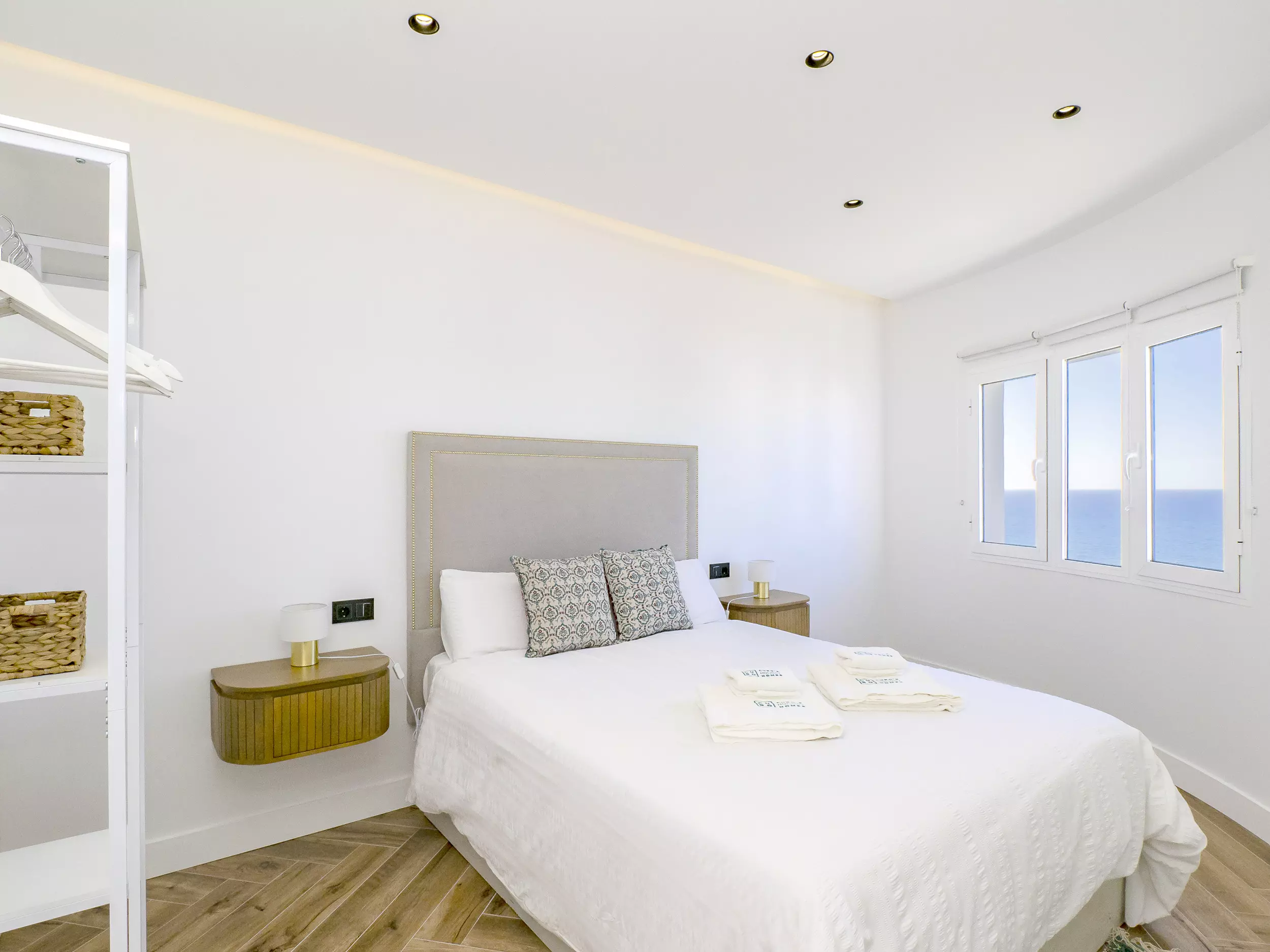 Le logement dispose de deux chambres, l'une avec un lit de matrimonial et vue sur la mer, et l'autre également avec un lit double, toutes deux offrant un espace confortable pour ranger les bagages. Le salon-salle à manger, lumineux et moderne, s'intègre à la terrasse pour que vous puissiez prendre votre petit-déjeuner ou déjeuner en profitant de la vue. La cuisine américaine est équipée de tout le nécessaire : plaque vitrocéramique, réfrigérateur, micro-ondes, four, lave-vaisselle, cafetière, grille-pain, bouilloire et presse-agrumes. La salle de bain dispose d'un receveur de douche.