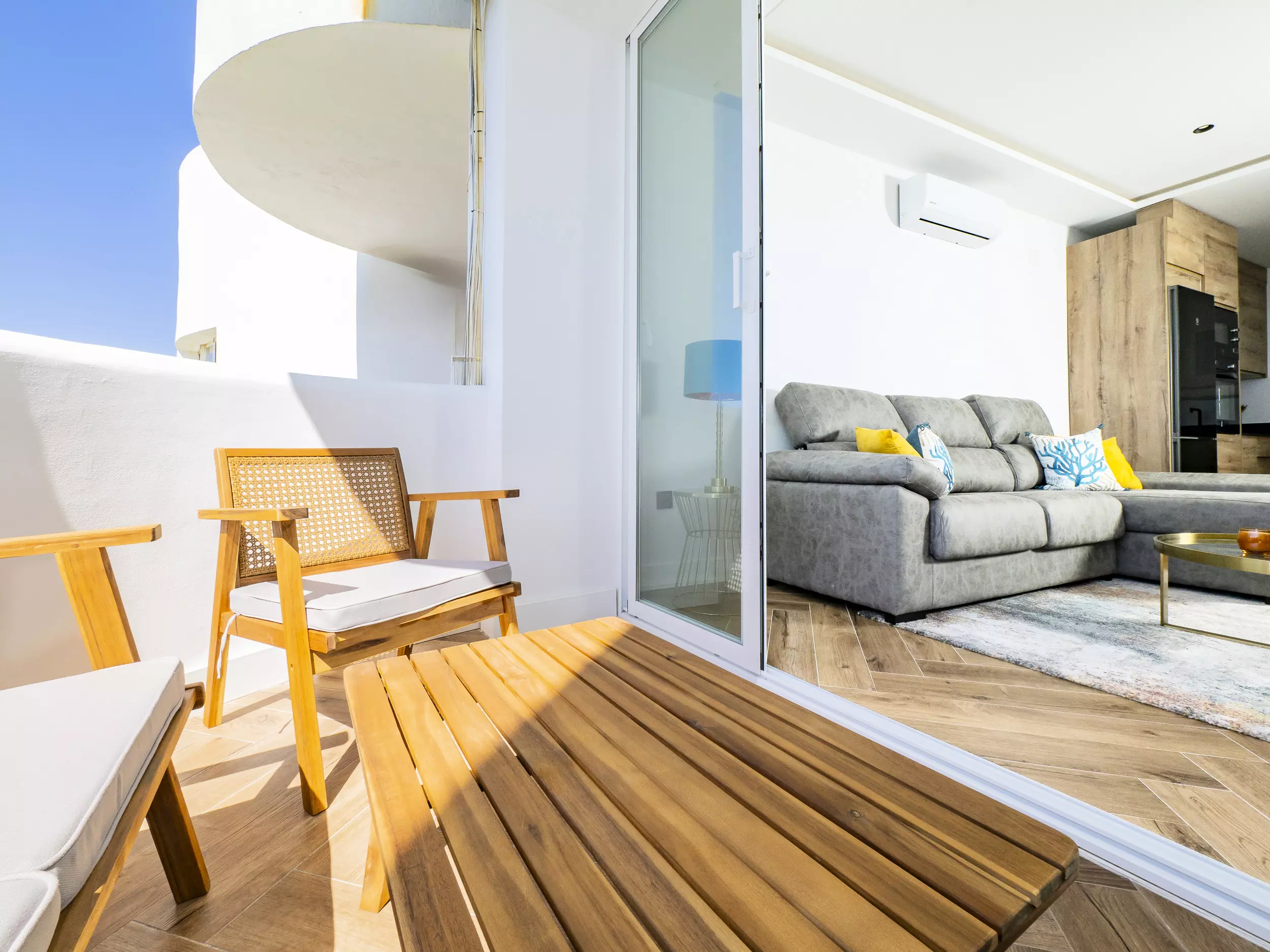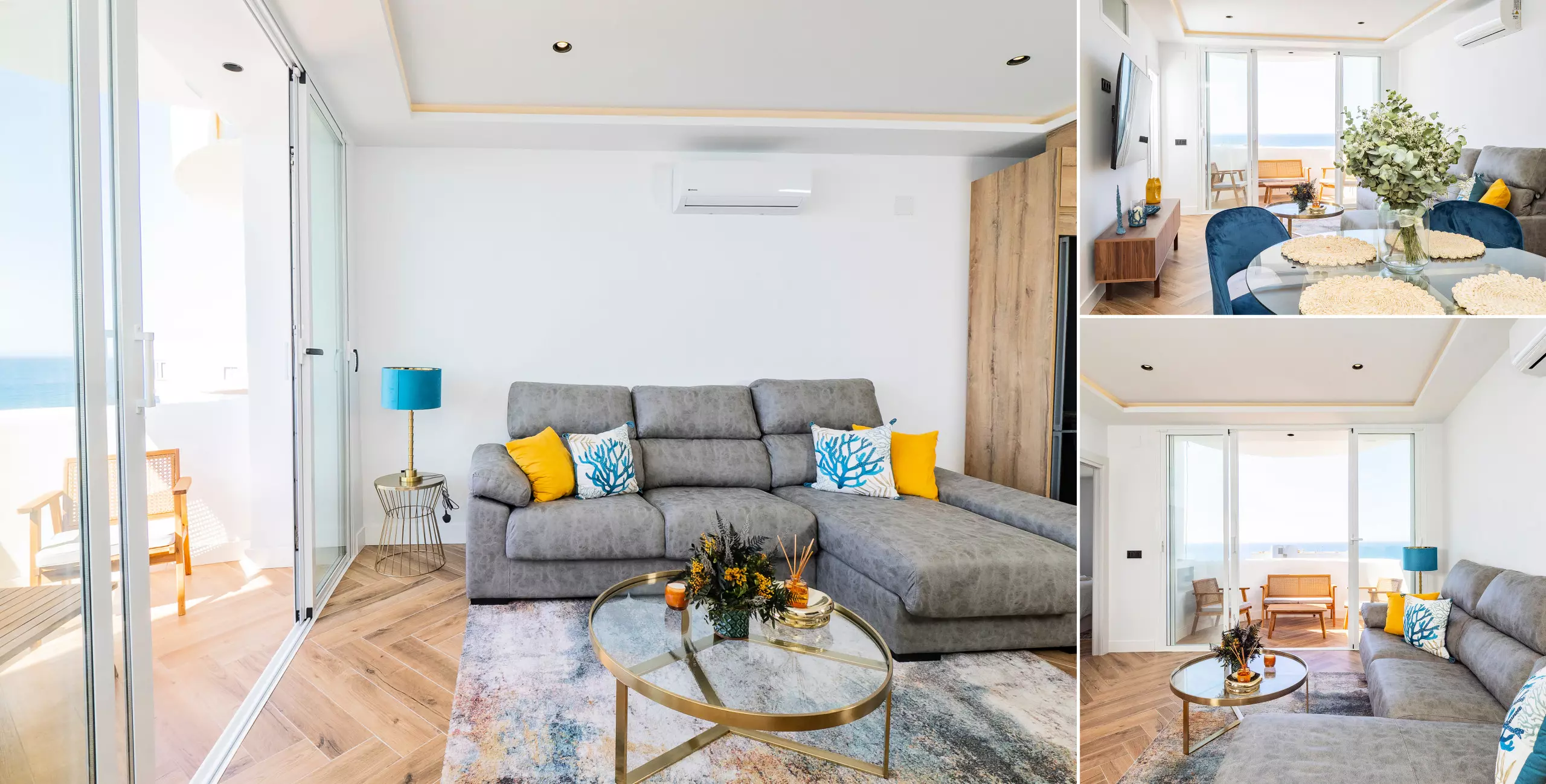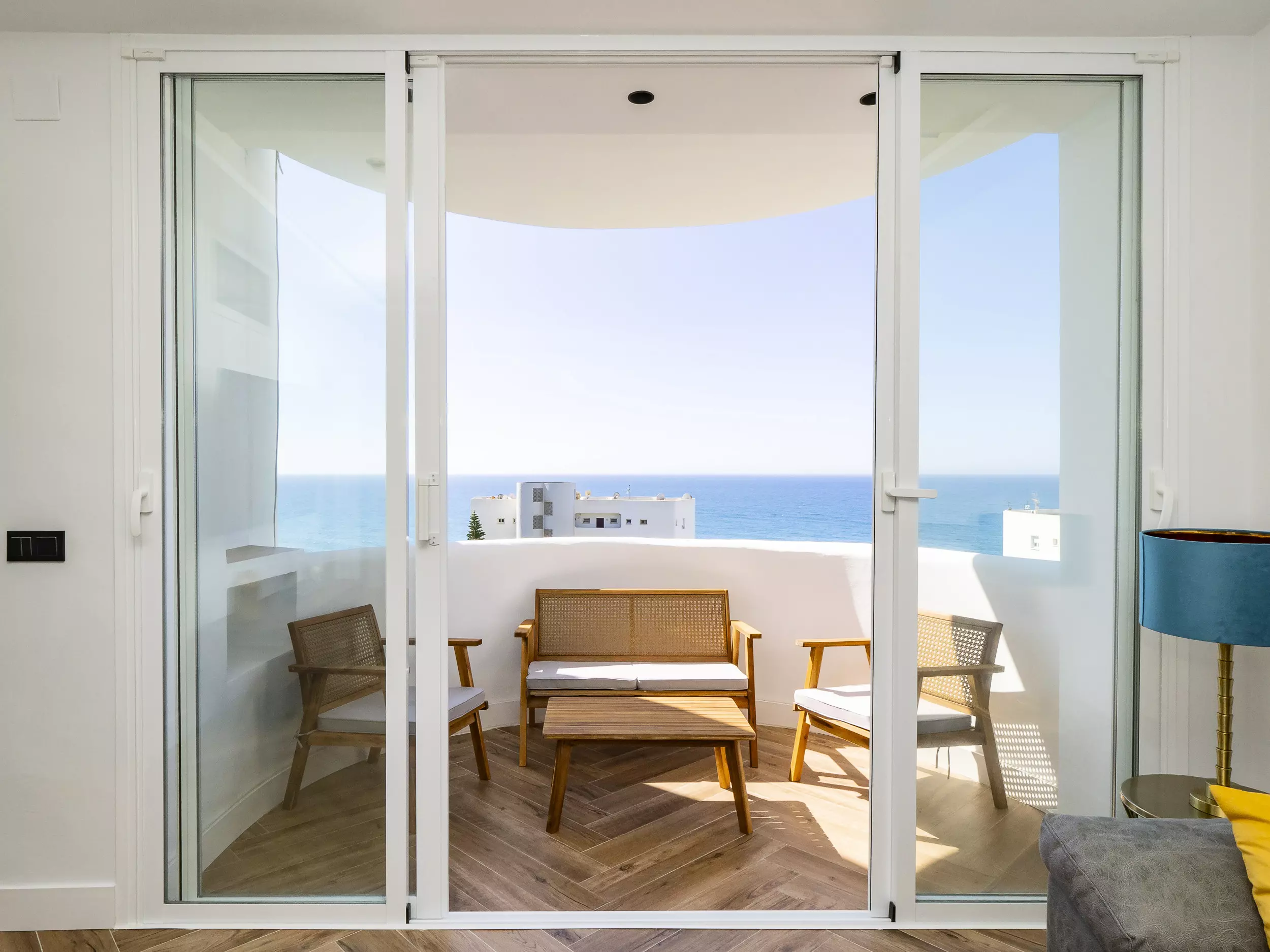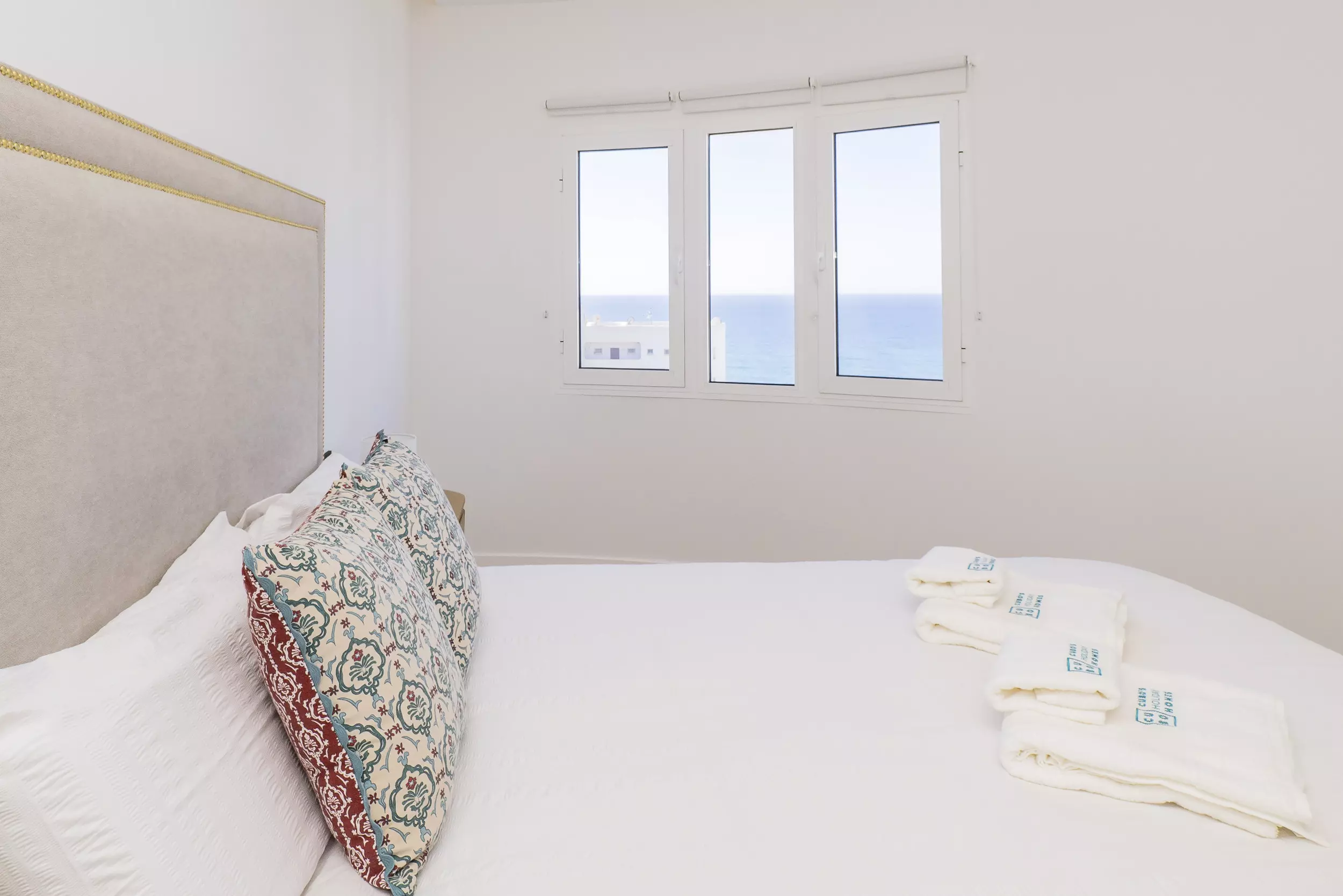 Le logement dispose de deux chambres, l'une avec un lit de matrimonial et vue sur la mer, et l'autre également avec un lit double, toutes deux offrant un espace confortable pour ranger les bagages. Le salon-salle à manger, lumineux et moderne, s'intègre à la terrasse pour que vous puissiez prendre votre petit-déjeuner ou déjeuner en profitant de la vue. La cuisine américaine est équipée de tout le nécessaire : plaque vitrocéramique, réfrigérateur, micro-ondes, four, lave-vaisselle, cafetière, grille-pain, bouilloire et presse-agrumes. La salle de bain dispose d'un receveur de douche.