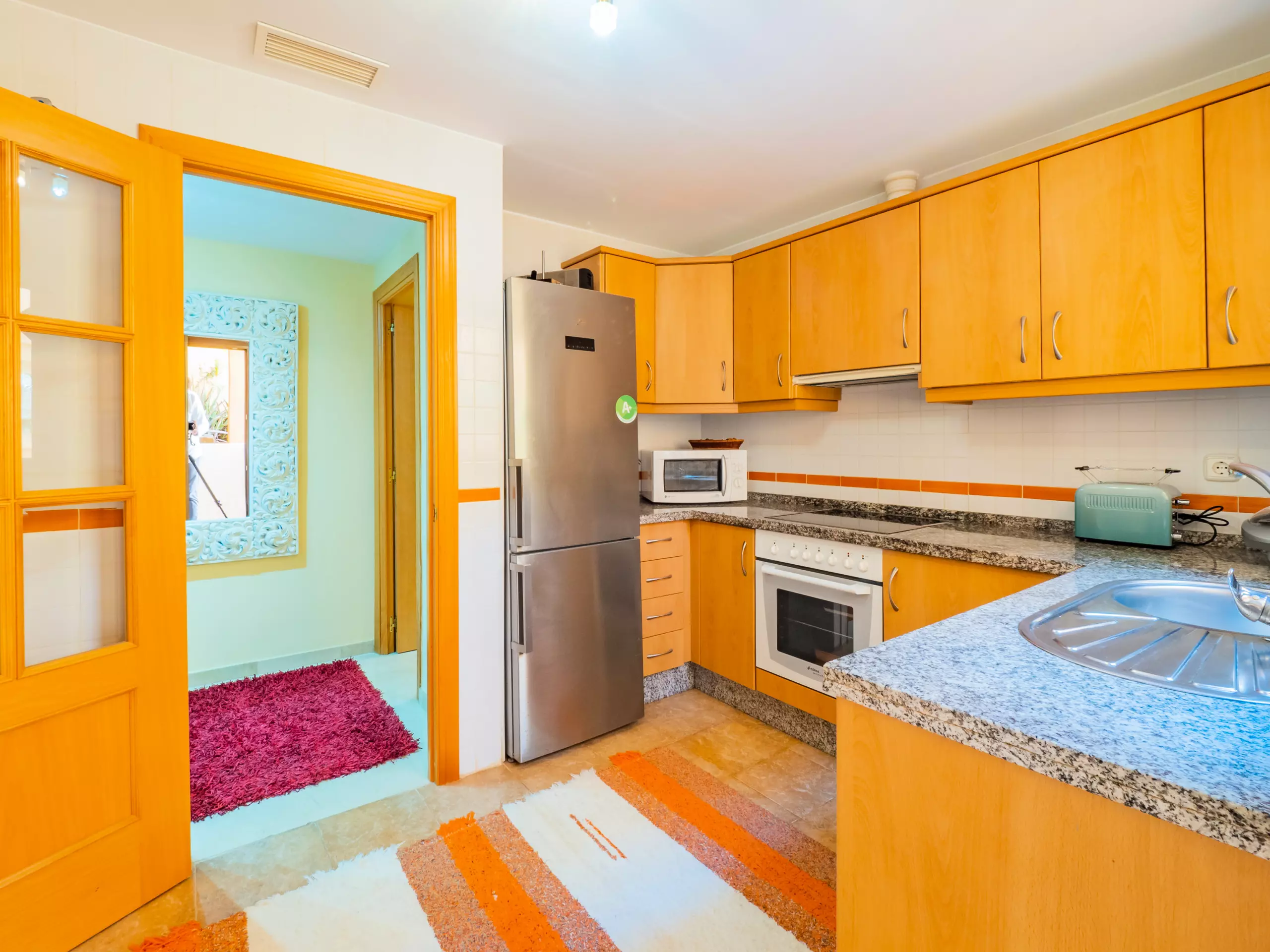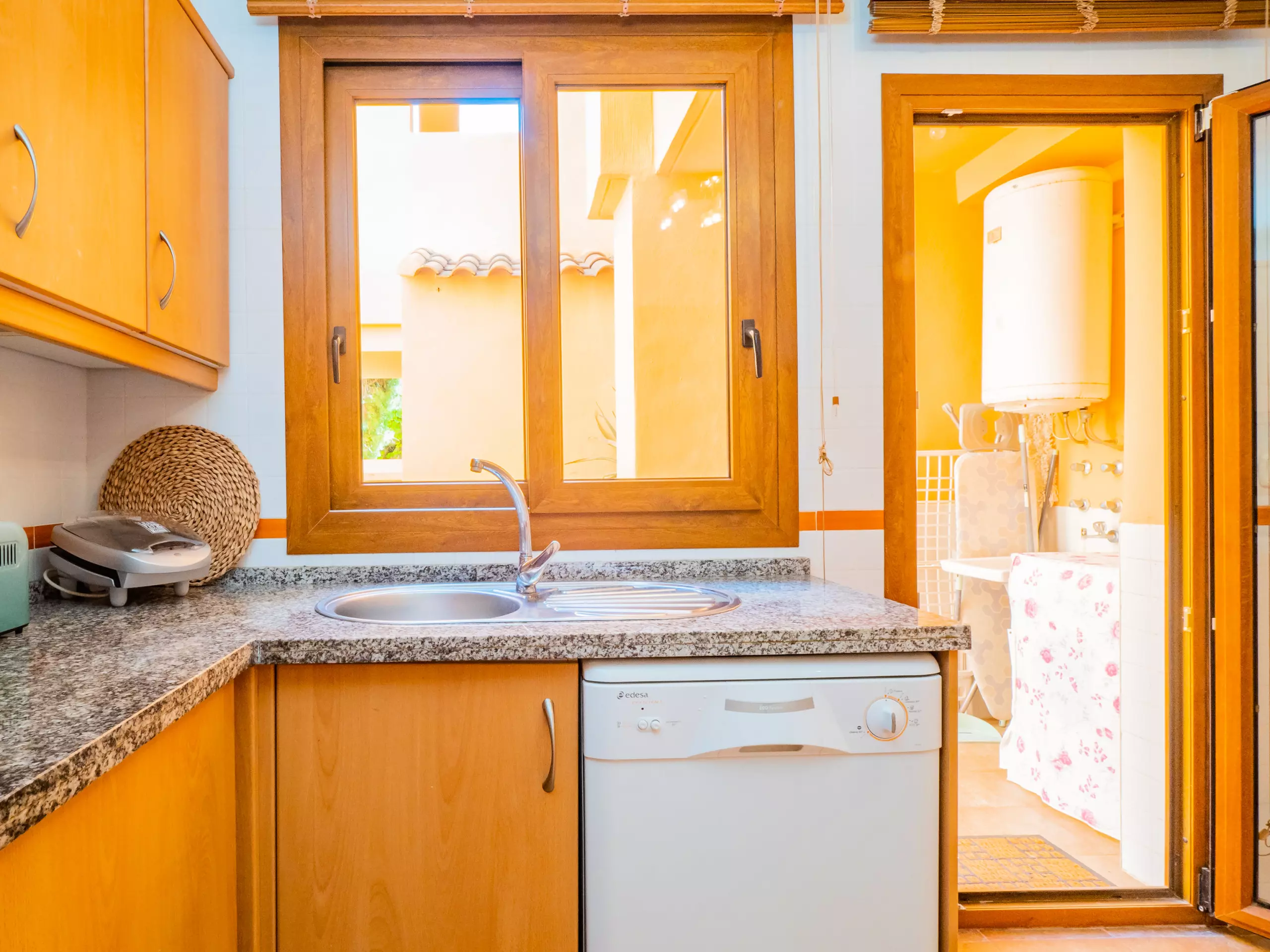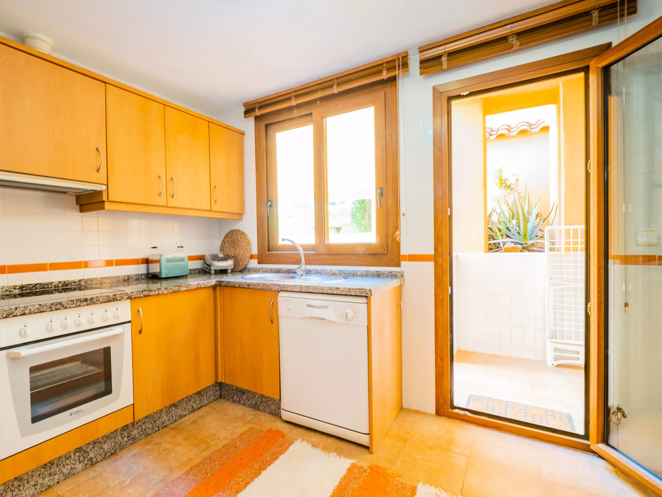 L'intérieur dispose d'un salon-salle à manger élégant et fonctionnel, avec deux zones distinctes : un espace de repos avec des canapés confortables et une télévision, et une zone de salle à manger avec une grande table en bois. La cuisine indépendante est entièrement équipée d'appareils électroménagers modernes : plaque vitrocéramique, réfrigérateur combiné, micro-ondes, four, congélateur, machine à laver, lave-vaisselle, cafetière, grille-pain, bouilloire et presse-agrumes, avec un accès à une cour intérieure qui apporte de la lumière naturelle.