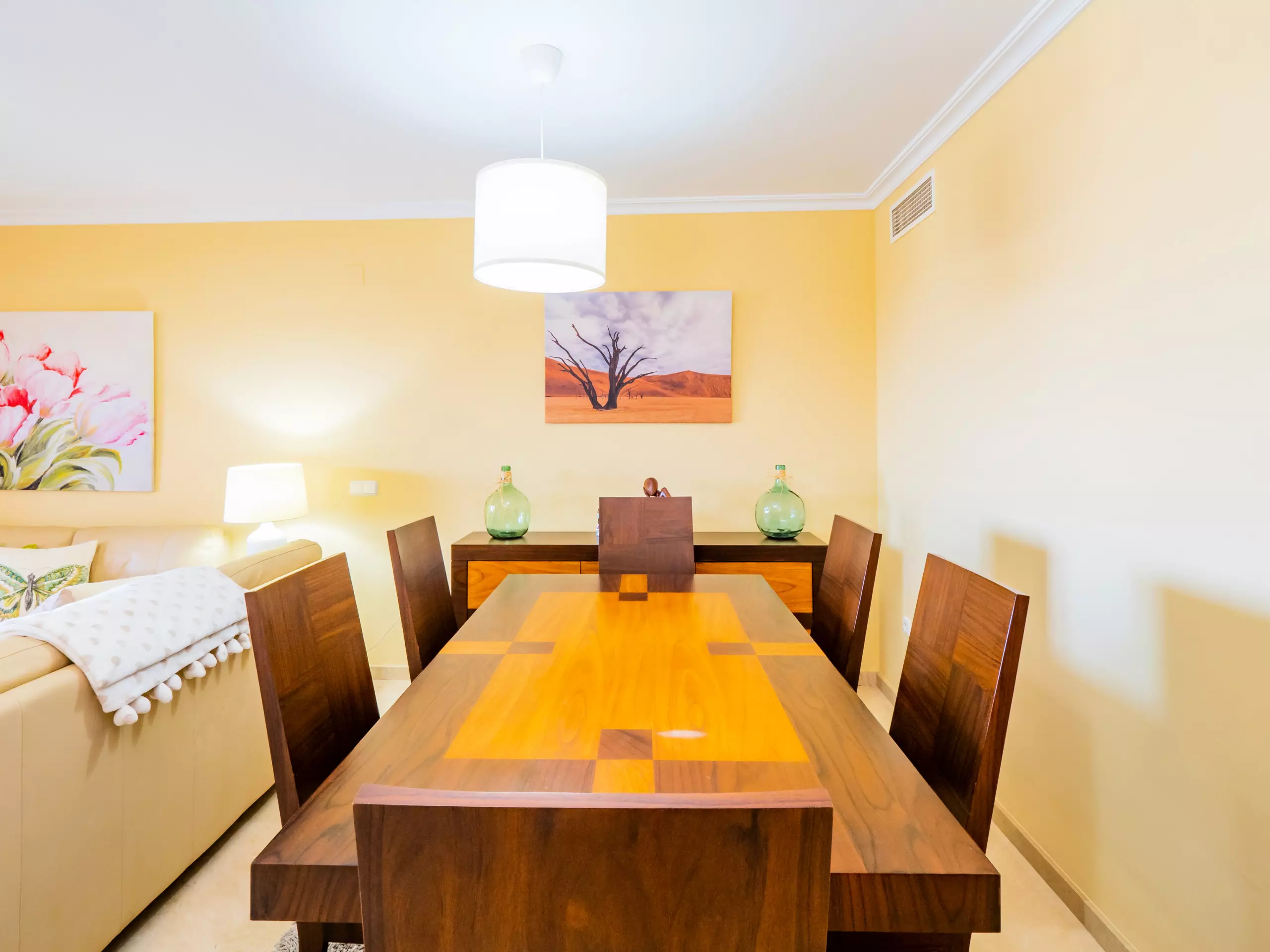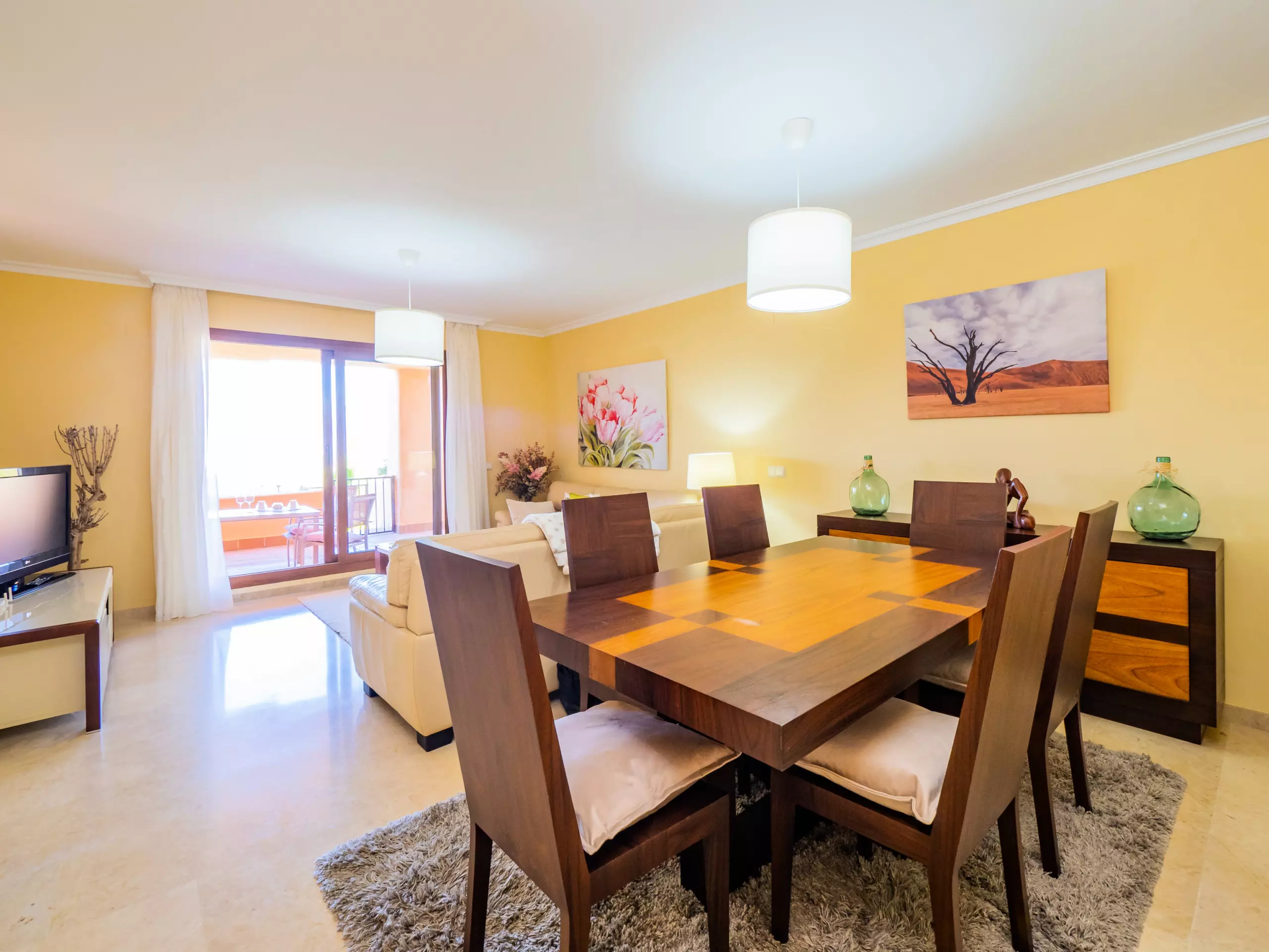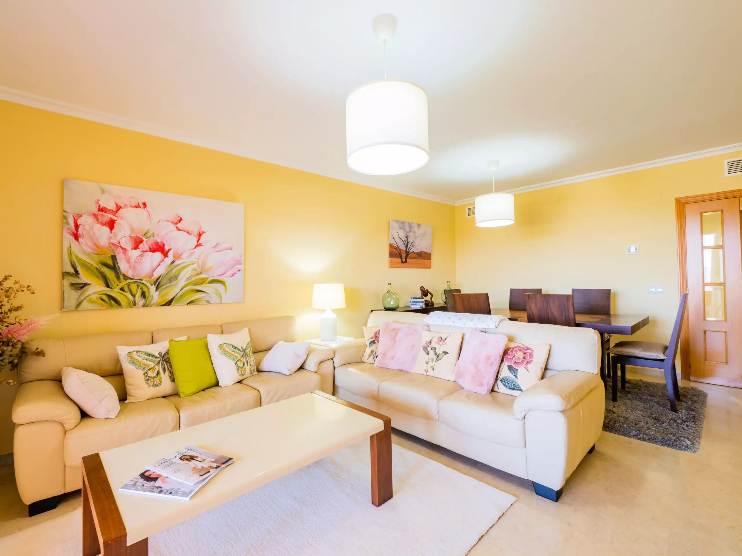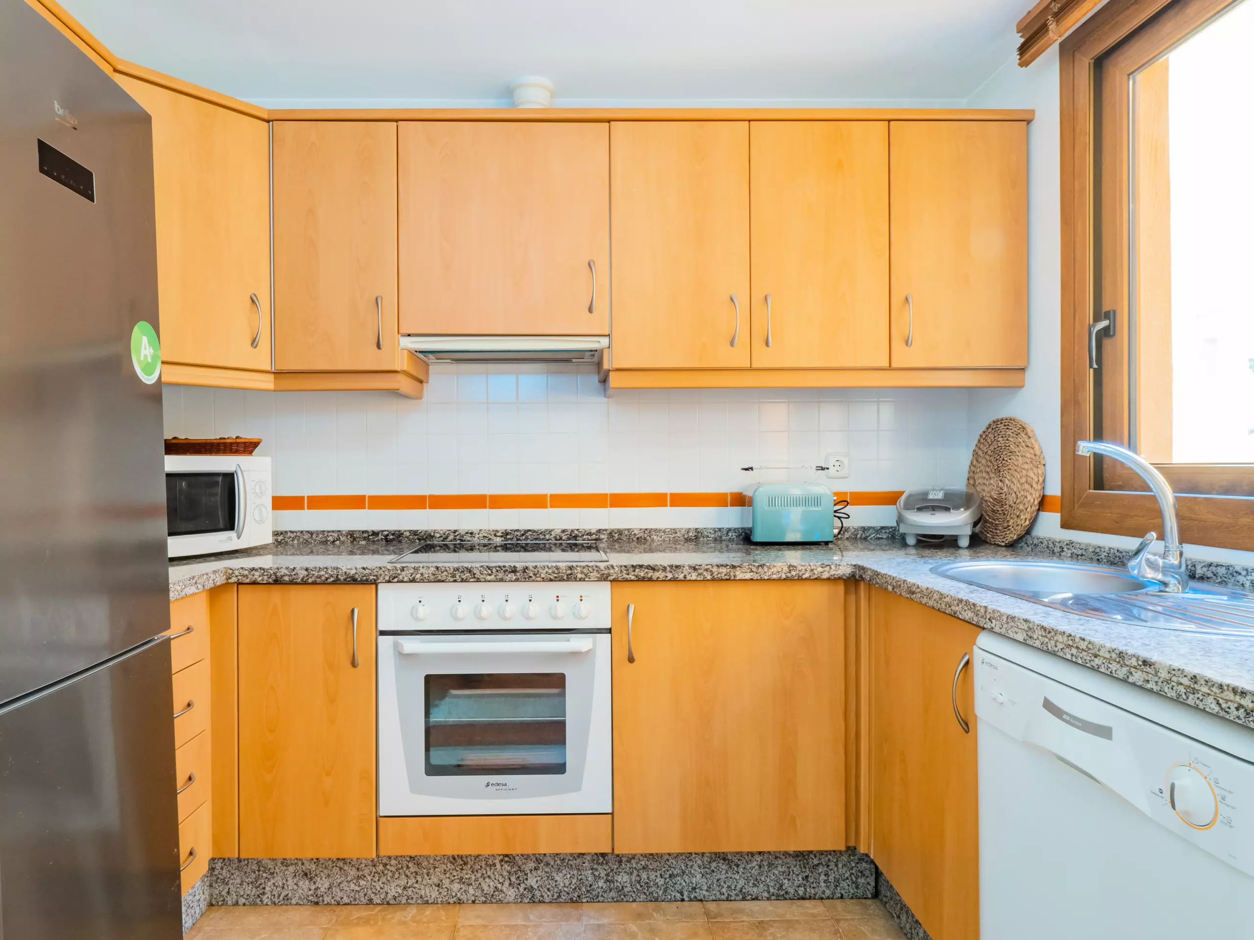 L'intérieur dispose d'un salon-salle à manger élégant et fonctionnel, avec deux zones distinctes : un espace de repos avec des canapés confortables et une télévision, et une zone de salle à manger avec une grande table en bois. La cuisine indépendante est entièrement équipée d'appareils électroménagers modernes : plaque vitrocéramique, réfrigérateur combiné, micro-ondes, four, congélateur, machine à laver, lave-vaisselle, cafetière, grille-pain, bouilloire et presse-agrumes, avec un accès à une cour intérieure qui apporte de la lumière naturelle.
